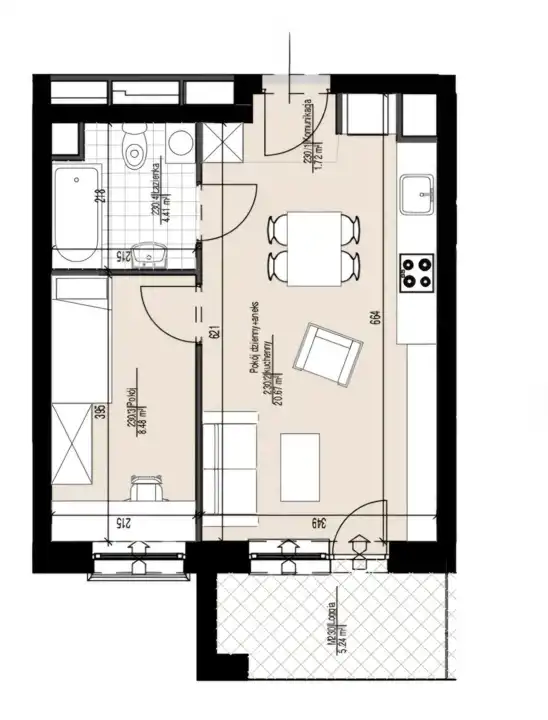 - salon z aneksem kuchennym – 21 m²