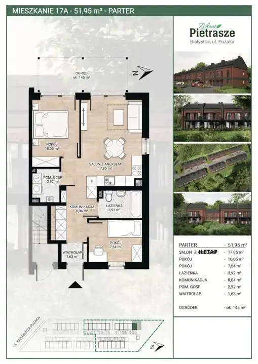 Oferujemy do sprzedaży mieszkanie 3- pokojowe 17A o powierzchni 51,95 m2 w budynku w zabudowie szeregowej w trakcie realizacji.