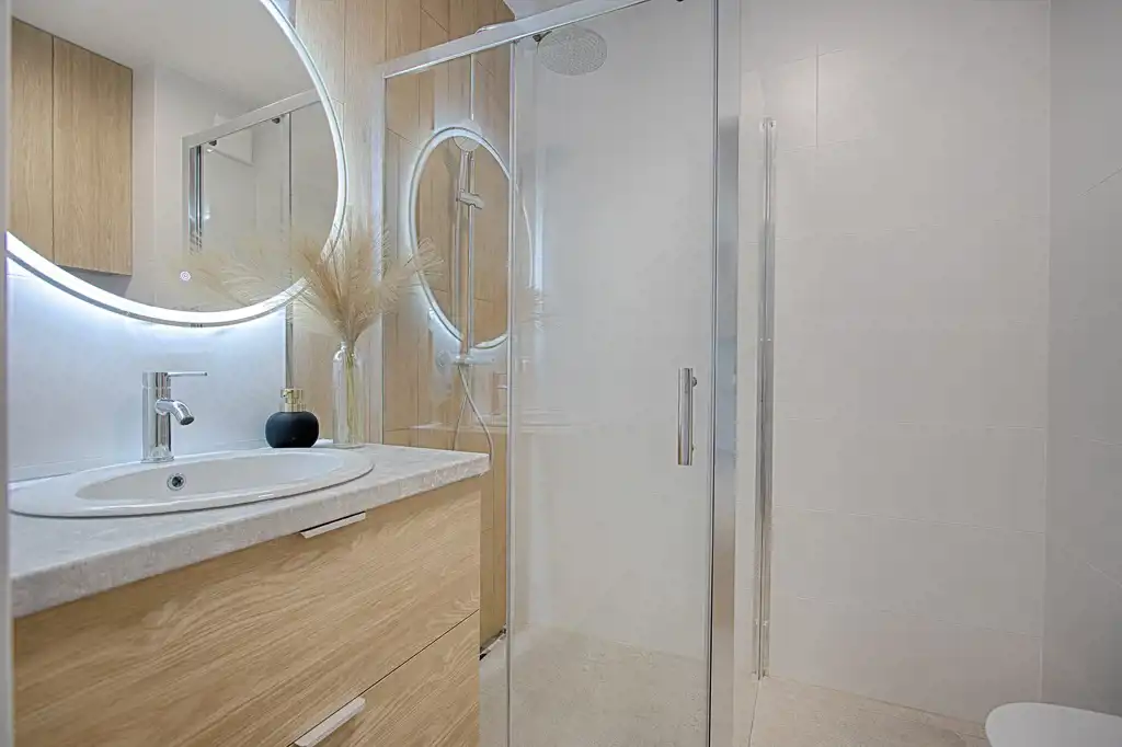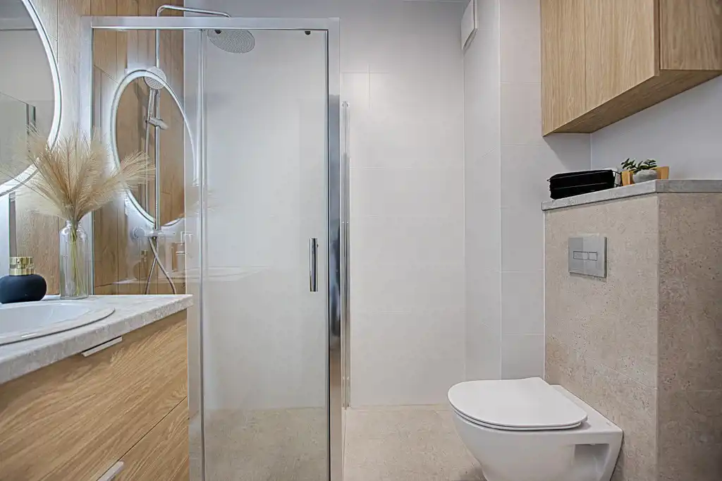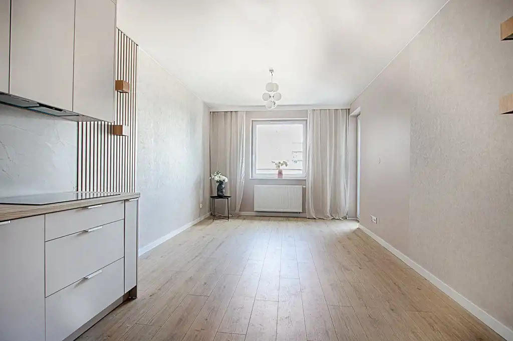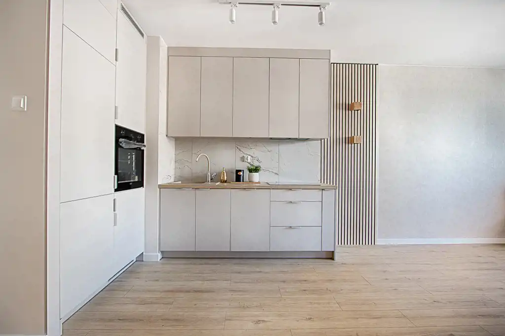 Kuchnia została wykonana w zabudowie na wymiar i wyposażona w nowy sprzęt AGD (lodówka, zmywarka, piekarnik, płyta indukcyjna, okap) – wszystkie urządzenia objęte są gwarancją. Wnętrze jest estetyczne, spójne i gotowe do wprowadzenia.