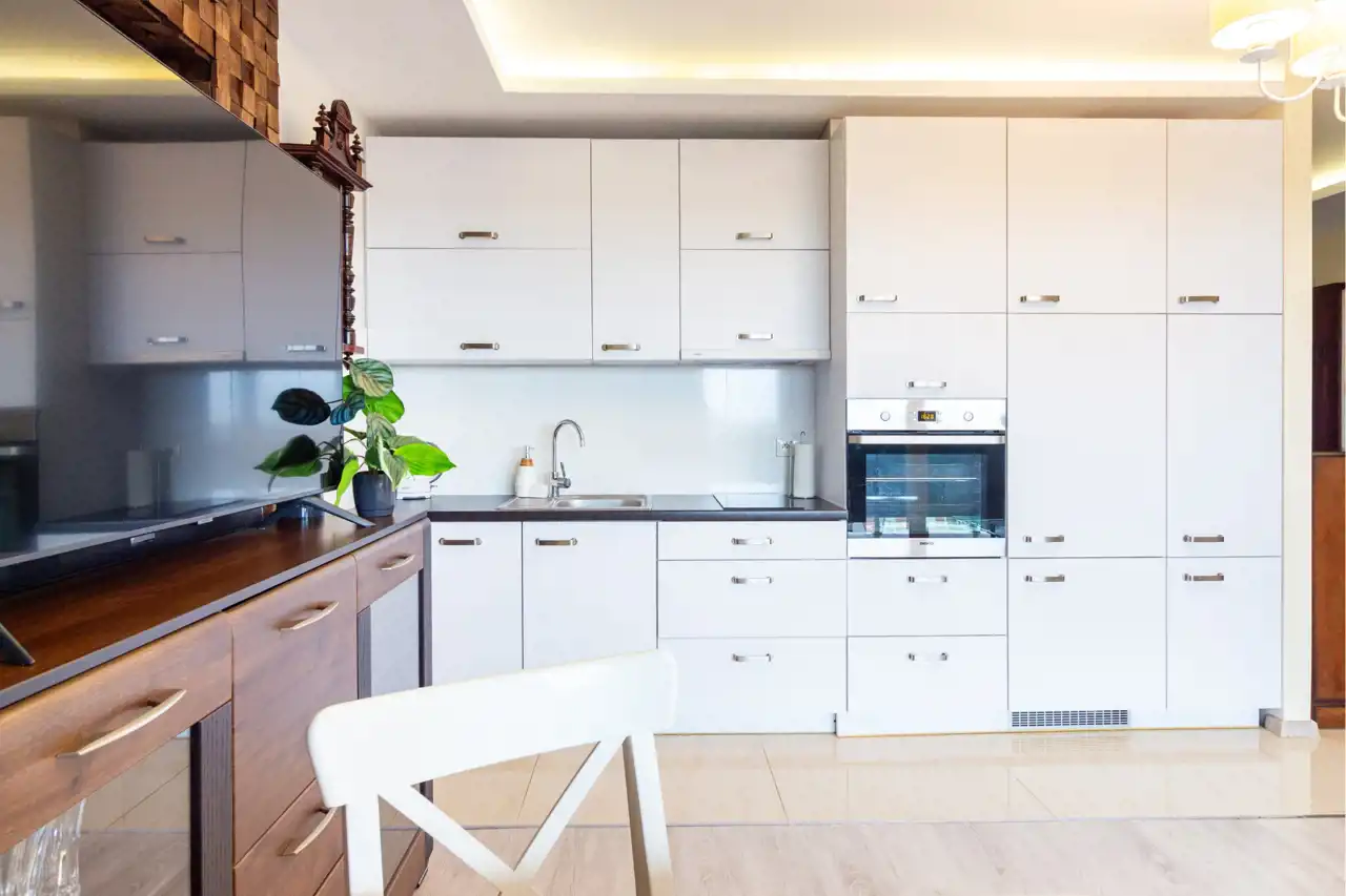 - salonu z aneksem kuchennym, w pełni wyposażonym w zabudowę i sprzęt AGD (zmywarka, lodówka, piekarnik, płyta indukcyjna),