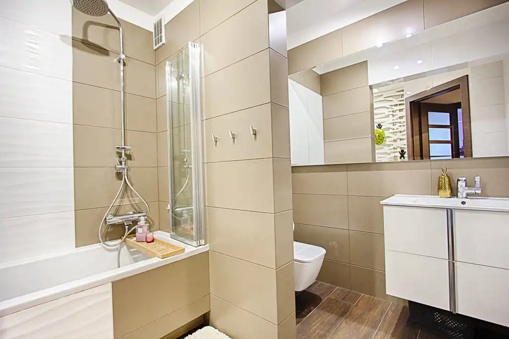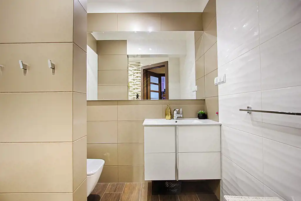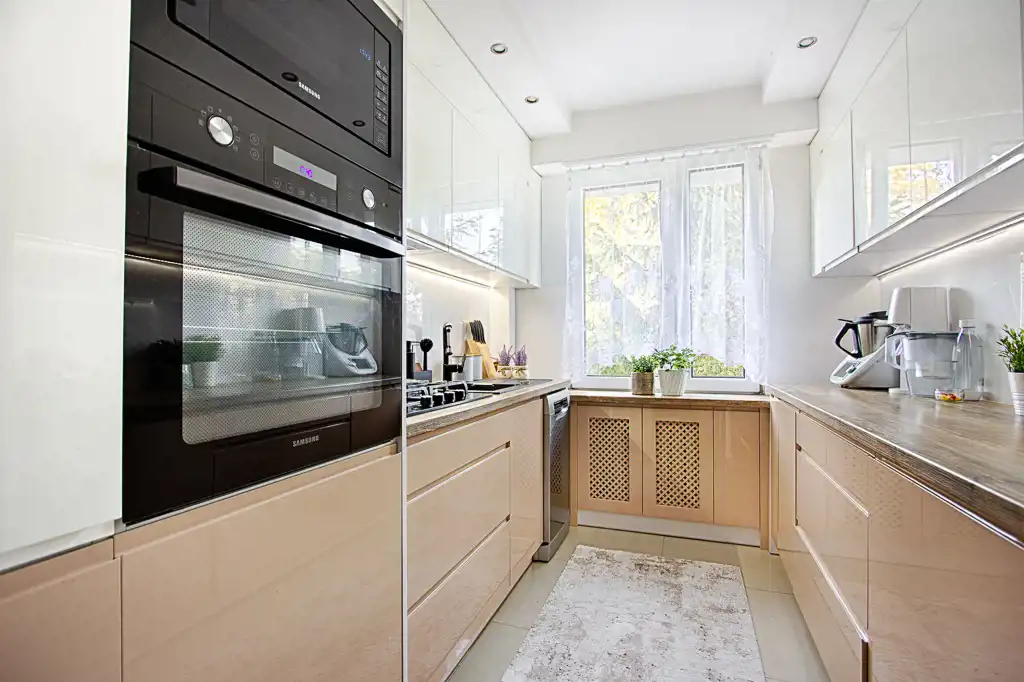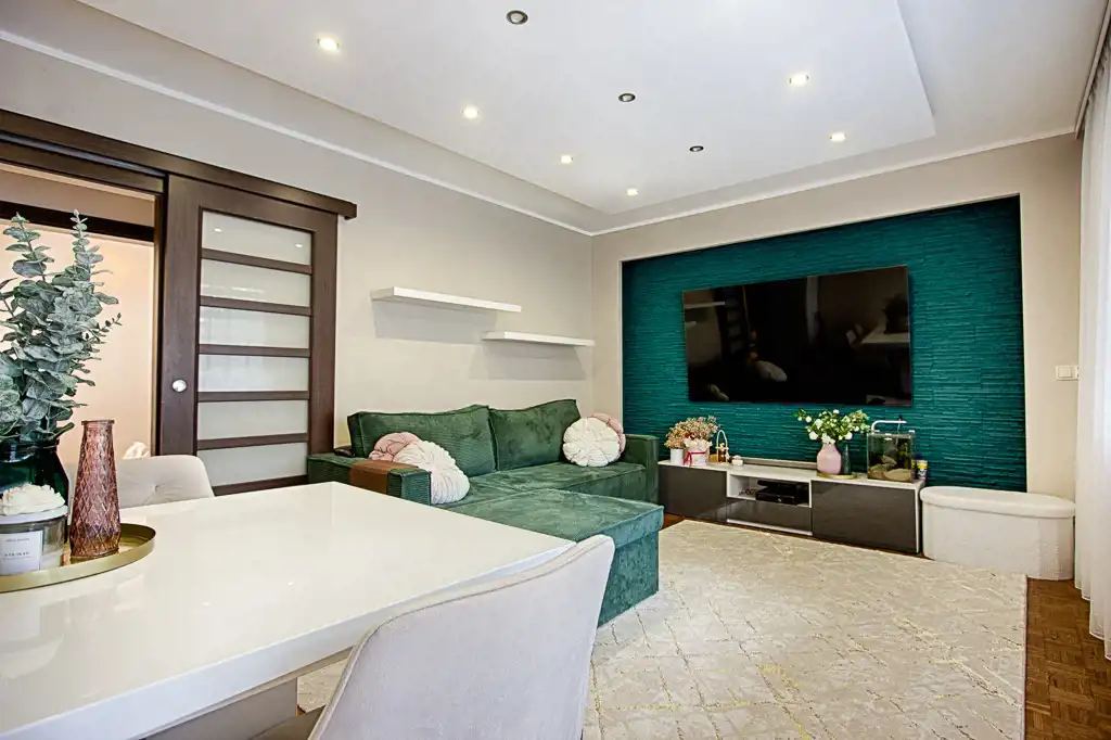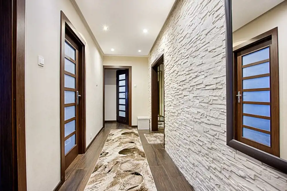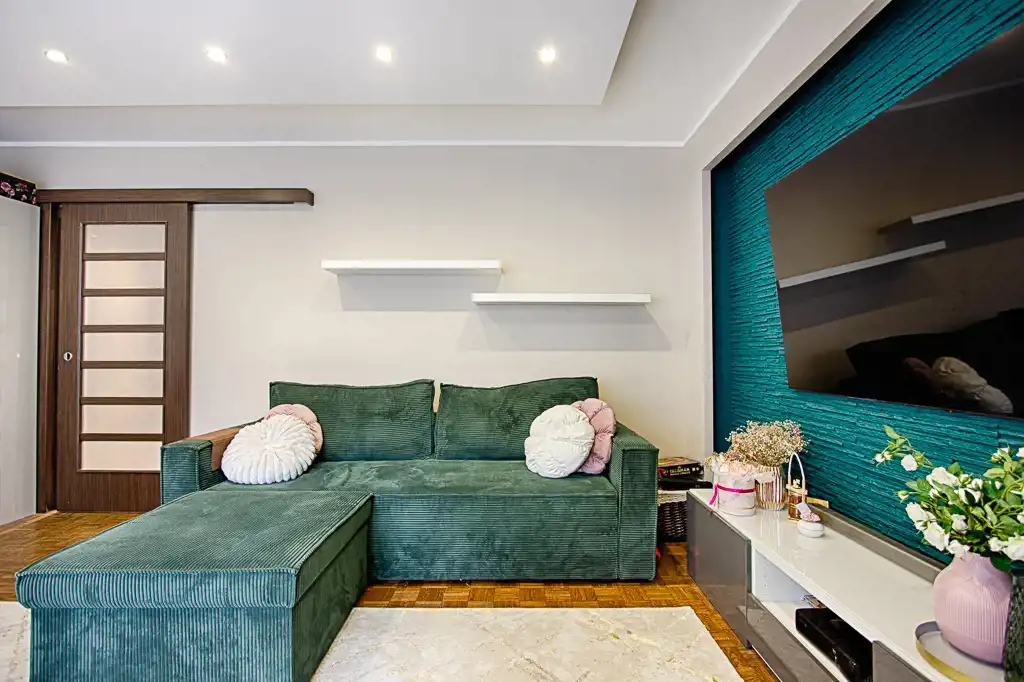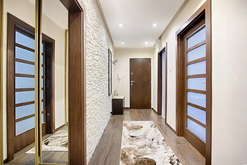 Nieruchomość ma dwustronny i niezależny rozkład pomieszczeń – każde jest dostępne z korytarza. Wnętrza zostały urządzone w przytulnym stylu oraz nowoczesnej kolorystyce. Nie wymagają dodatkowych nakładów finansowych- nieruchomość przeszła generalny remont kilka lat temu. Charakteru nadają całości wysokiej klasy materiały wykończeniowe. Mieszkanie jest zadbane i wyposażone w niezbędne sprzęty i niektóre meble ruchome - gotowe do zamieszkania. W przedpokoju znajdują się dwie zabudowy stałe wykonane na wymiar przez stolarza. Zabudowa kuchenna również została zaprojektowana i wykonana według indywidualnego projektu. Na podłogach w salonie i sypialniach położony jest drewniany parkiet a w łazience, przedpokoju i kuchni gres. Zabudowany balkon który został zaaranżowany jako kącik do relaksu, pozwala na spędzanie czasu na świeżym powietrzu bez wychodzenia z domu.