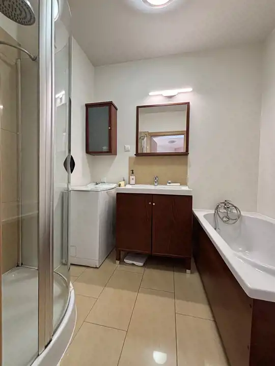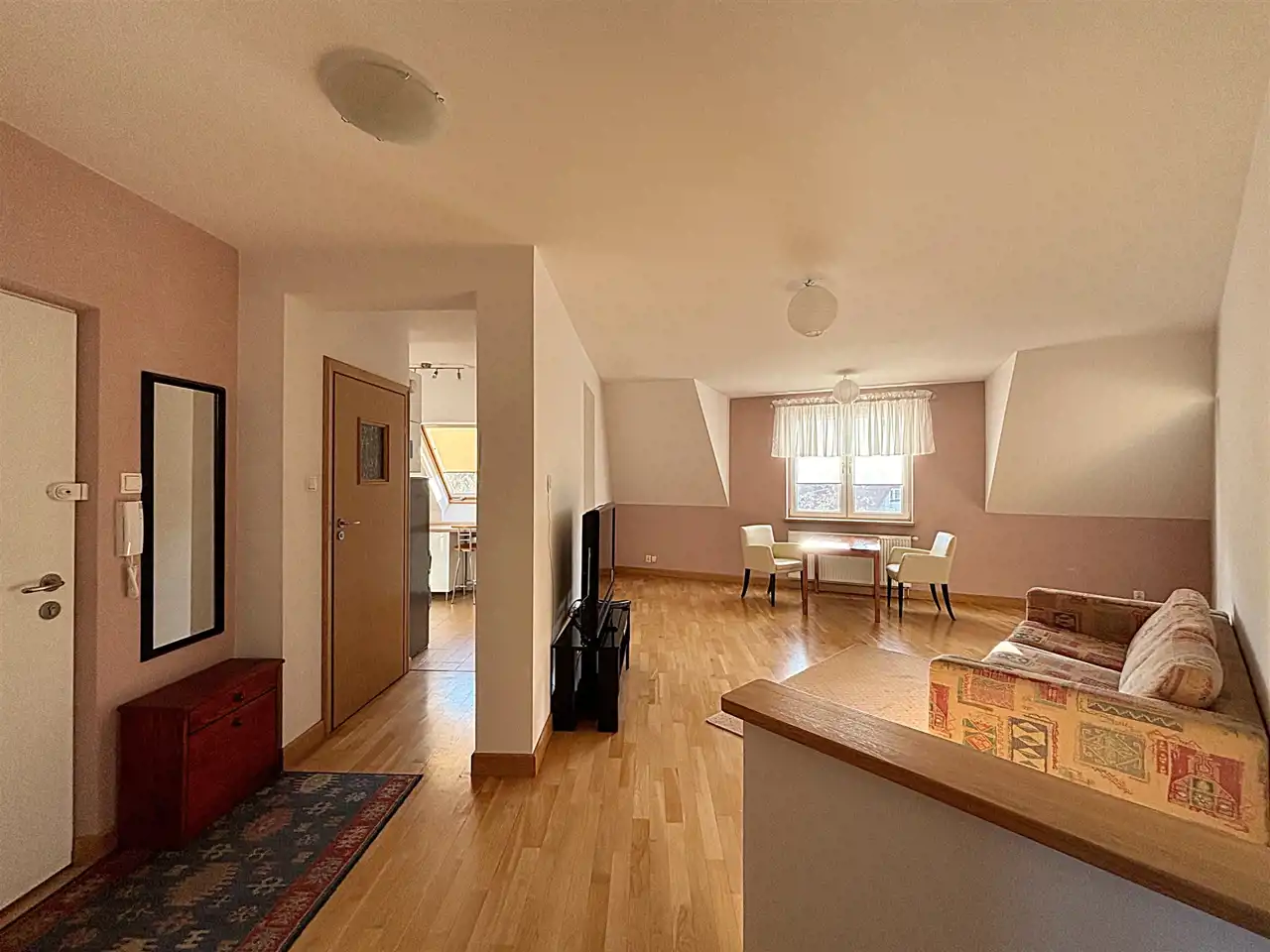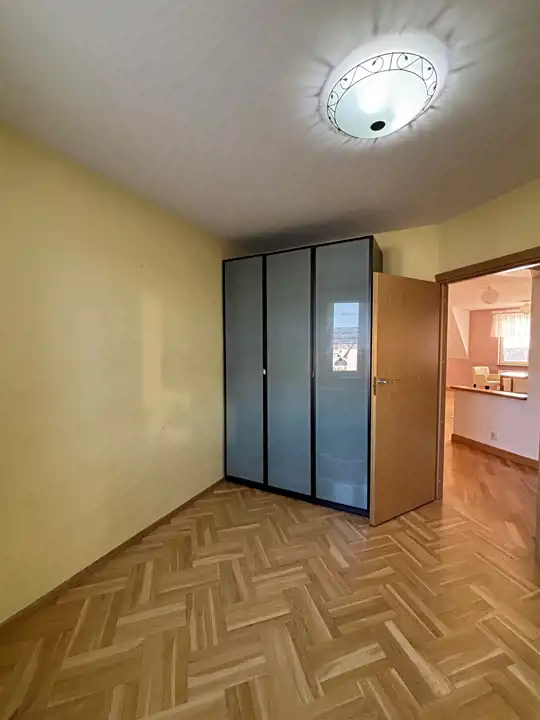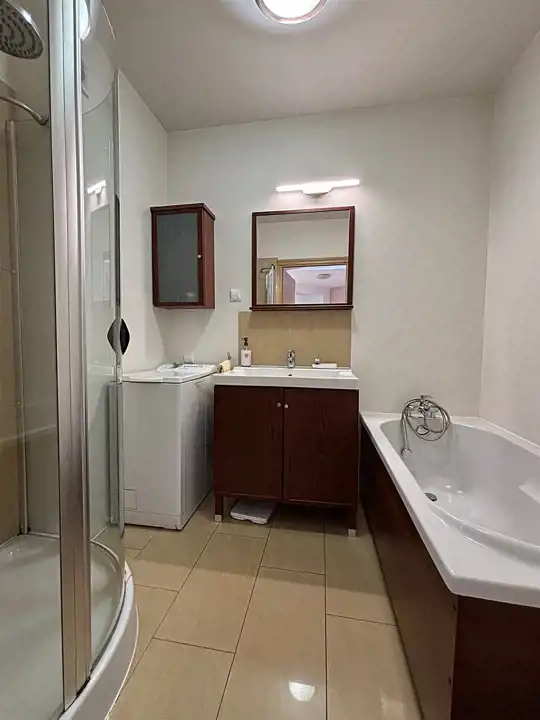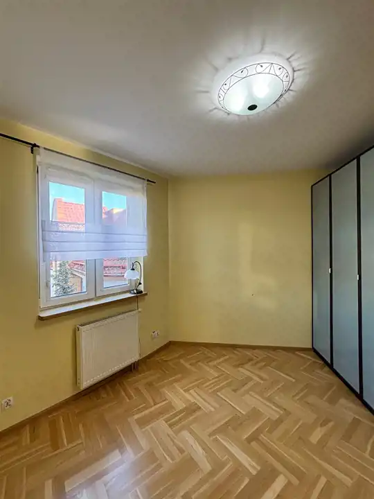 Na powierzchni 63 m2 do dyspozycji właściciela pozostaje pokój dzienny tworzący spójną, otwartą przestrzeń z przedpokojem i półotwartą kuchnią, dwie sypialnie, dość duża łazienka (z wanną i kabiną prysznicową), osobne WC i garderoba. Z balkonu rozpościera się widok na zieleń i niską zabudowę. Na uwagę zasługuje również dokonale utrzymany parkiet dębowy (w pokojach i przedpokoju).