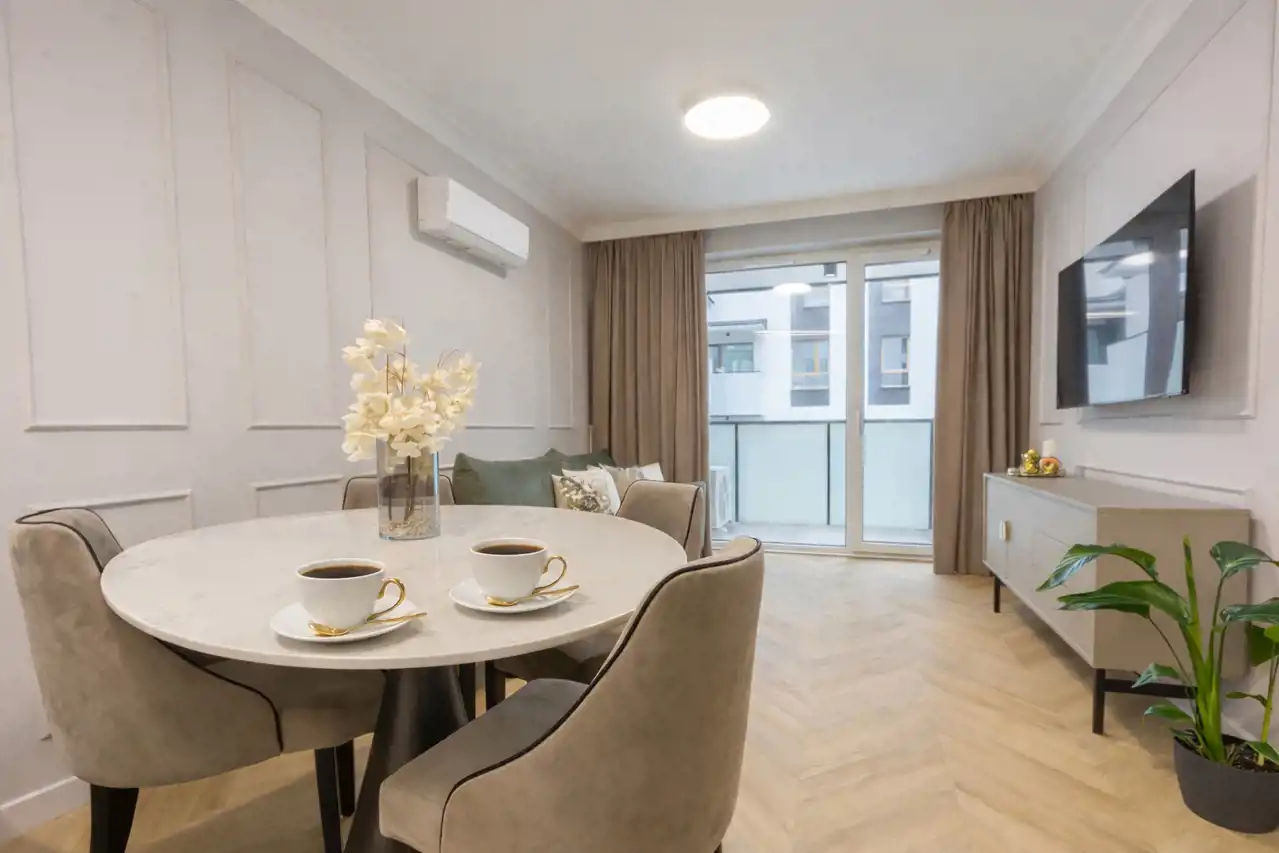 Lokal jest w pełni wyposażony w sprzęt: lodówka, piekarnik, płyta indukcyjna, zmywarka, okap, pralka, telewizor 55 cali oraz meble: stół z krzesłami, rozkładana kanapa i łóżko .