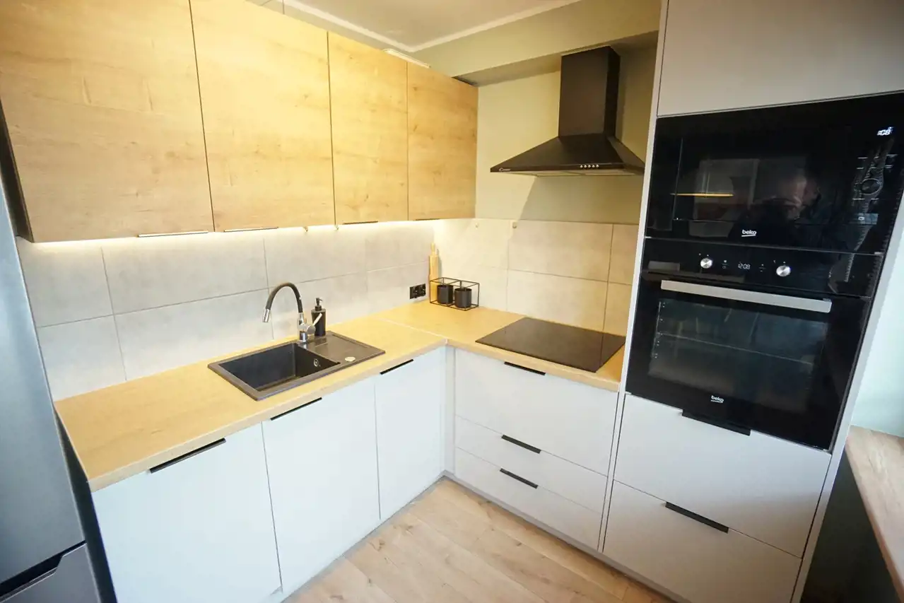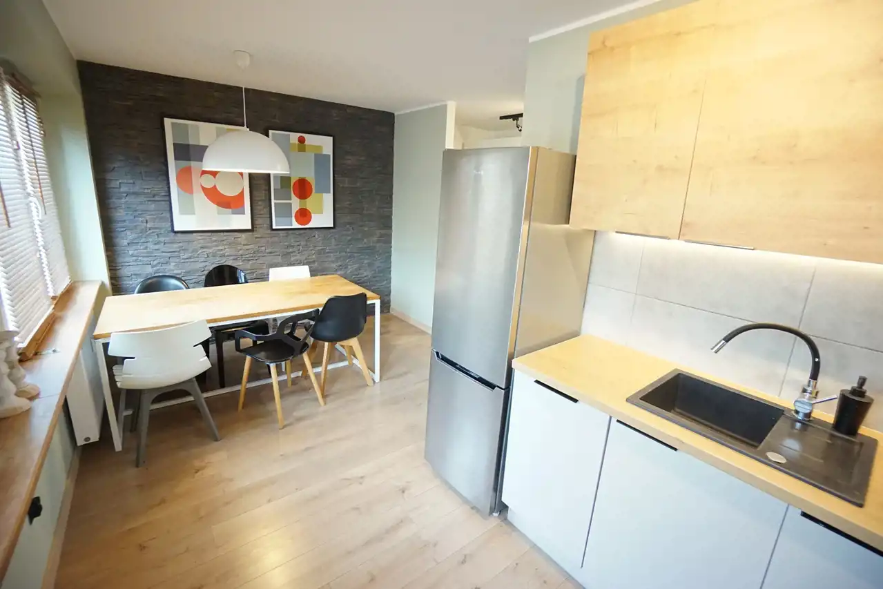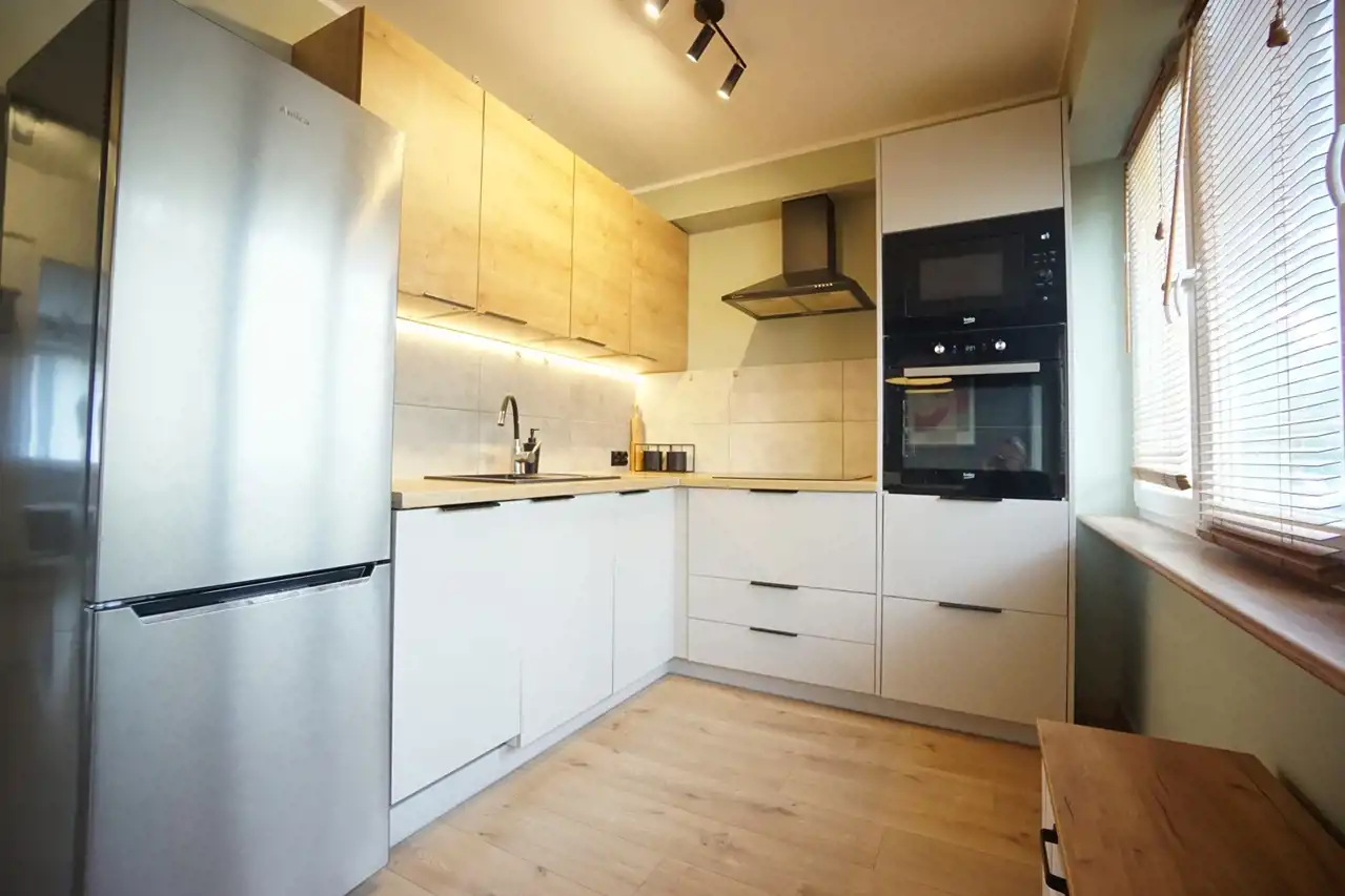 Kuchnia wyposażona w lodówkę, piekarnik, płytę indukcyjną, zmywarkę, mikrofalę.