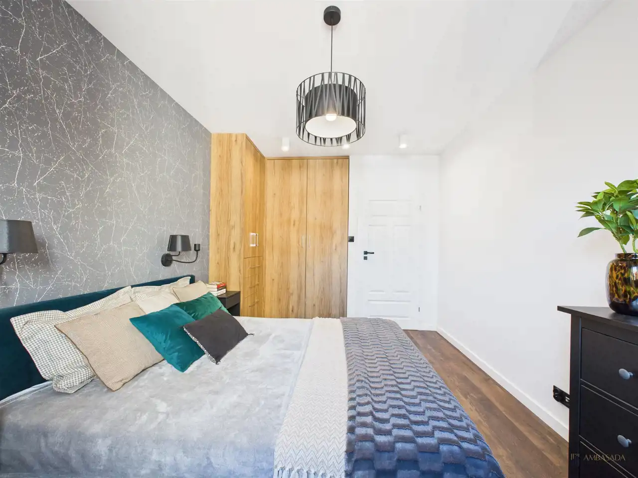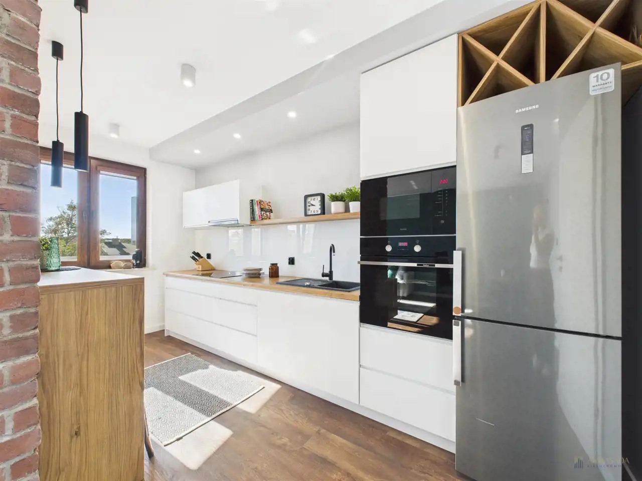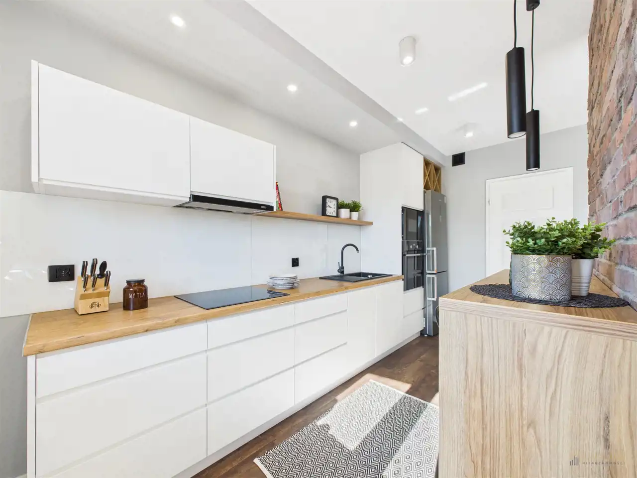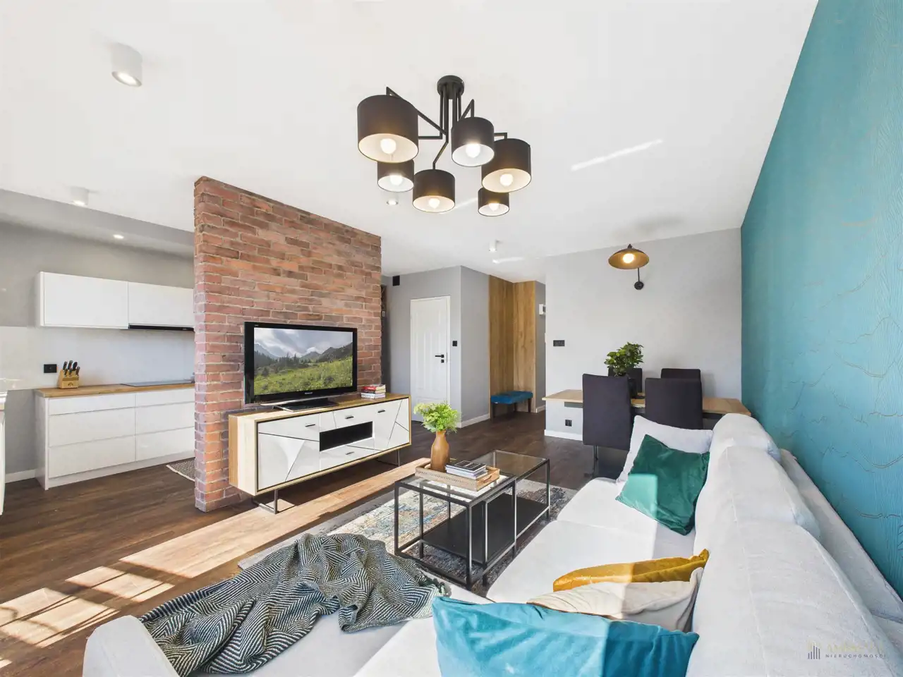 Powierzchnia mieszkalna to 55,50 m2 obejmujące przestronny salon z aneksem kuchennym, wydzieloną składówką/garderobą, oddzielną sypialnię, wygodną łazienkę z wc oraz korytarz. Metraże poszczególnych pomieszczeń zostały umieszczone na rzucie technicznym. Wnętrza wykończone w bardzo dobrym standardzie (5 lat temu mieszkanie przeszło gruntowny remont). Wyposażone w niezbędne zabudowy stałe w kuchni i garderobie oraz meble wolnostojące w salonie. Sypialnia przestronna, wyposażona w funkcjonalne zabudowy. Pełne wyposażenie AGD (lodówka, zmywarka, piekarnik, pralka). Na ścianach dekoracyjna cegła, tapety, na podłogach panel winylowy i terakota. Gotowe do zamieszkania lub pod wynajem od zaraz.