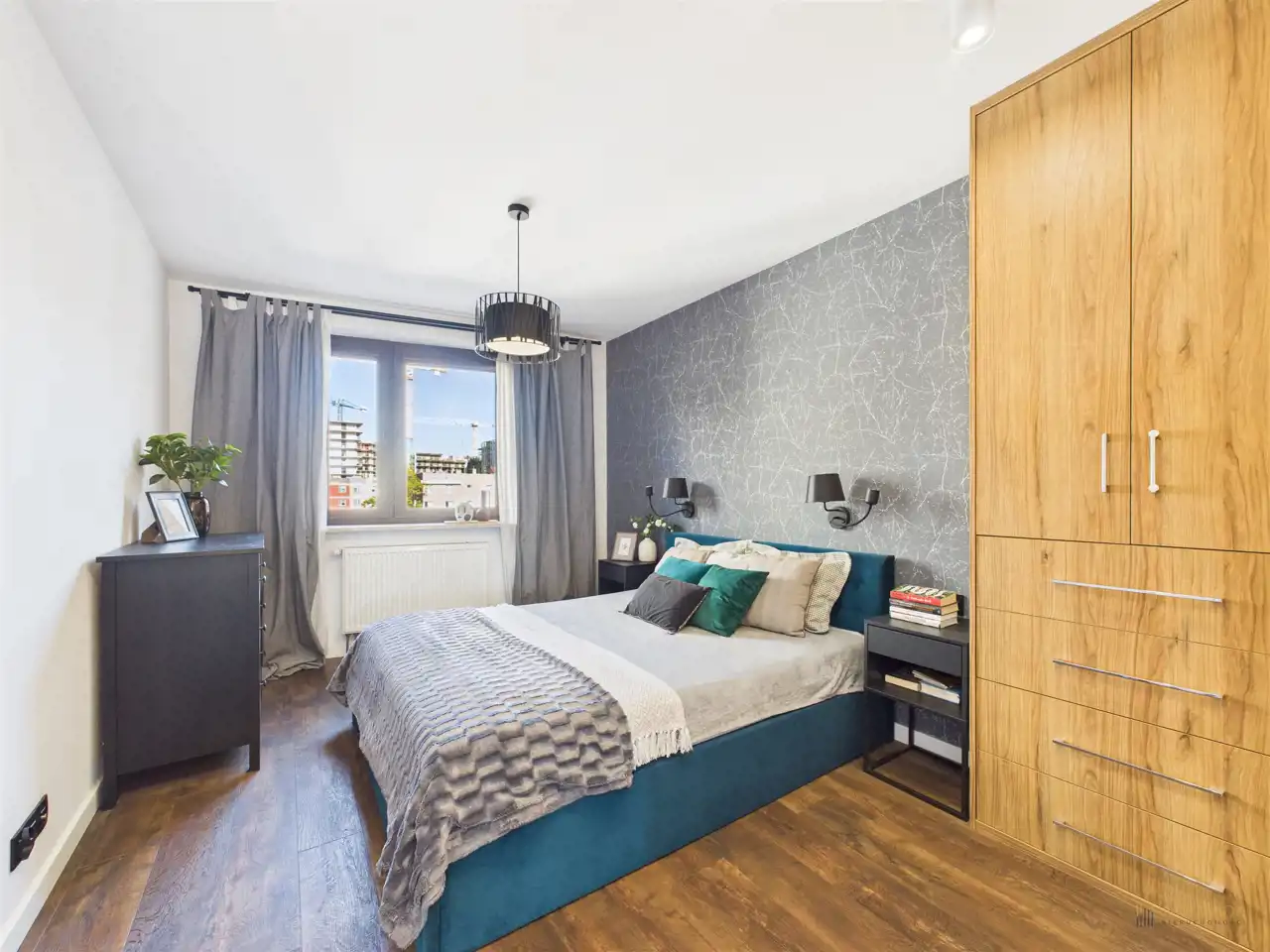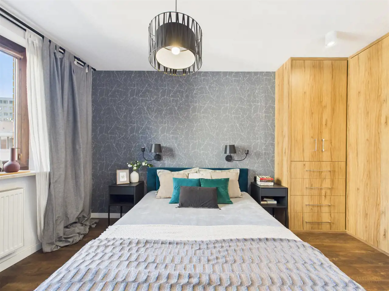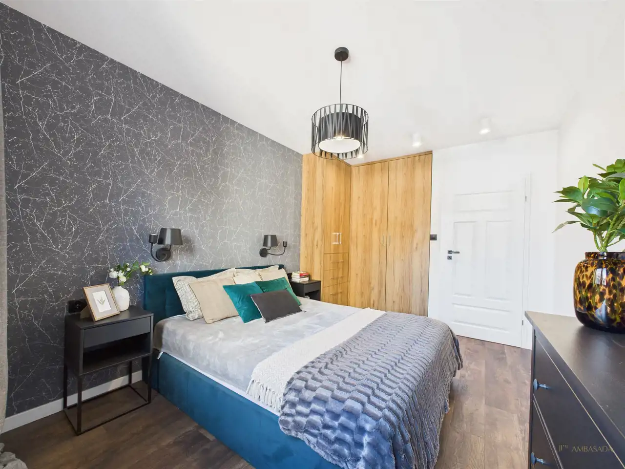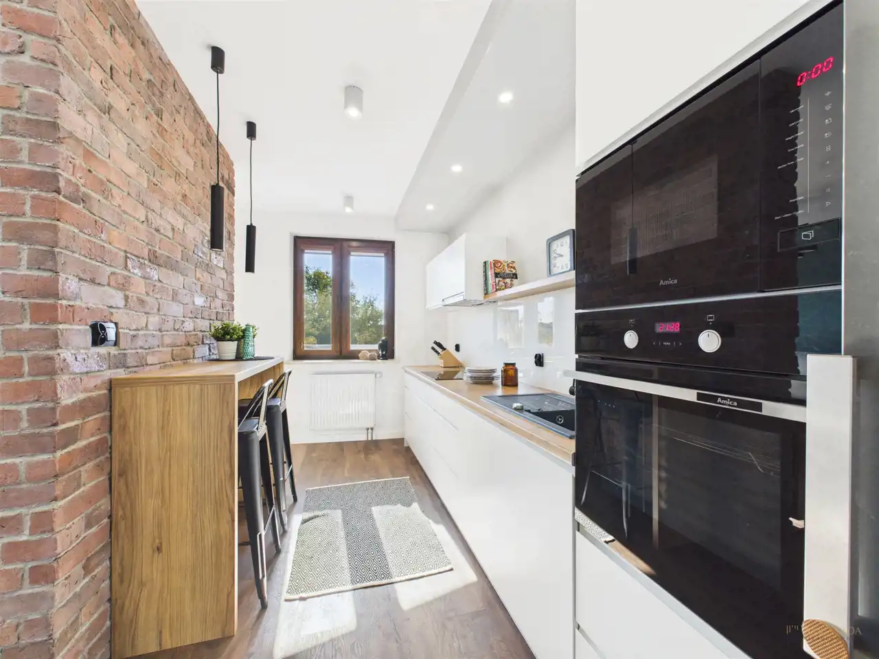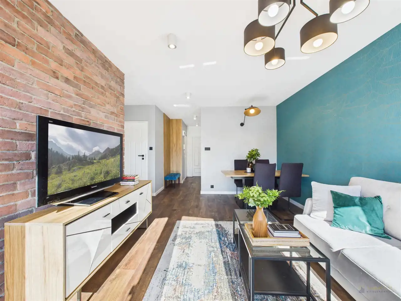 Powierzchnia mieszkalna to 55,50 m2 obejmujące przestronny salon z aneksem kuchennym, wydzieloną składówką/garderobą, oddzielną sypialnię, wygodną łazienkę z wc oraz korytarz. Metraże poszczególnych pomieszczeń zostały umieszczone na rzucie technicznym. Wnętrza wykończone w bardzo dobrym standardzie (5 lat temu mieszkanie przeszło gruntowny remont). Wyposażone w niezbędne zabudowy stałe w kuchni i garderobie oraz meble wolnostojące w salonie. Sypialnia przestronna, wyposażona w funkcjonalne zabudowy. Pełne wyposażenie AGD (lodówka, zmywarka, piekarnik, pralka). Na ścianach dekoracyjna cegła, tapety, na podłogach panel winylowy i terakota. Gotowe do zamieszkania lub pod wynajem od zaraz.