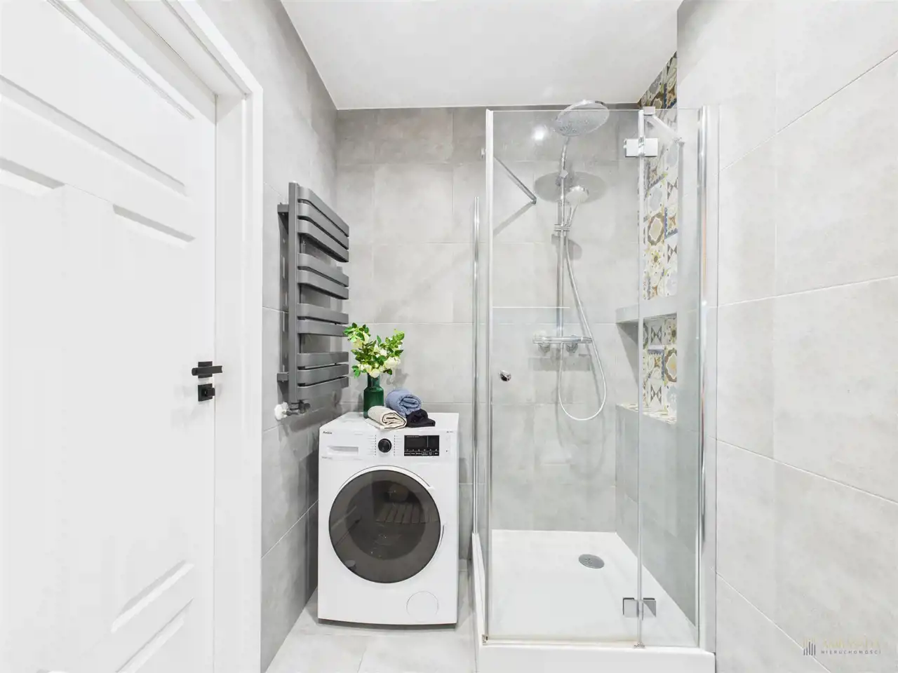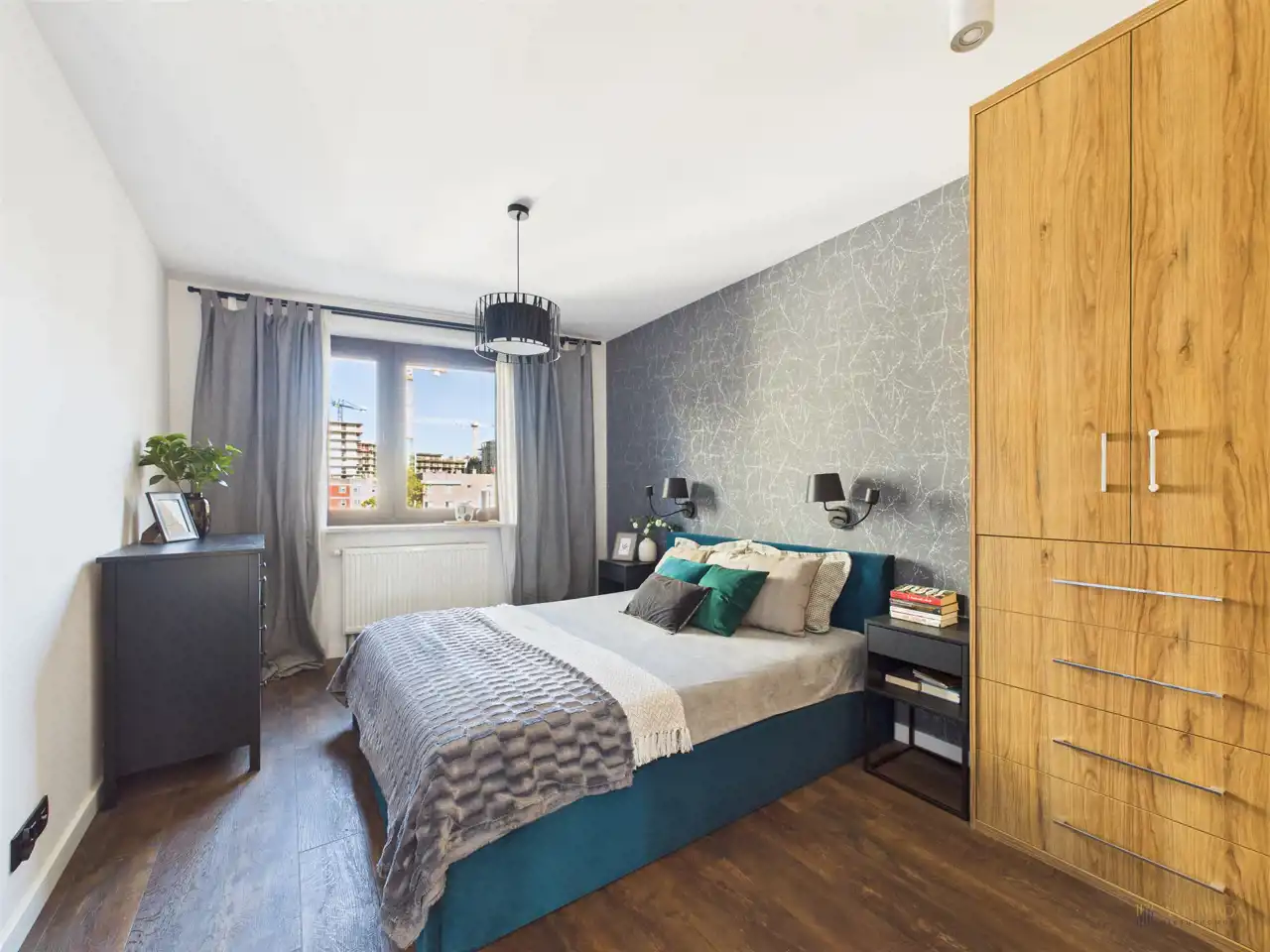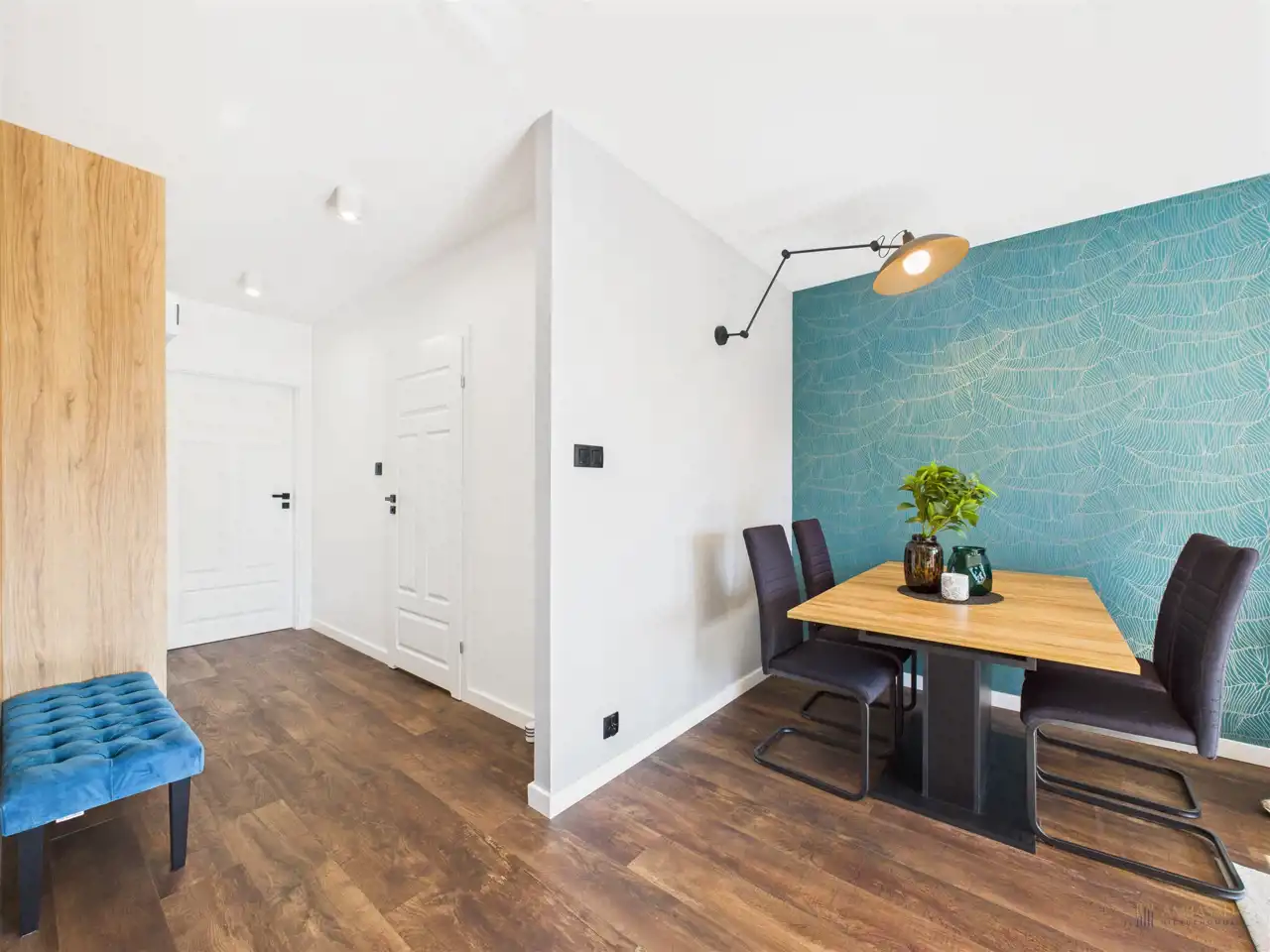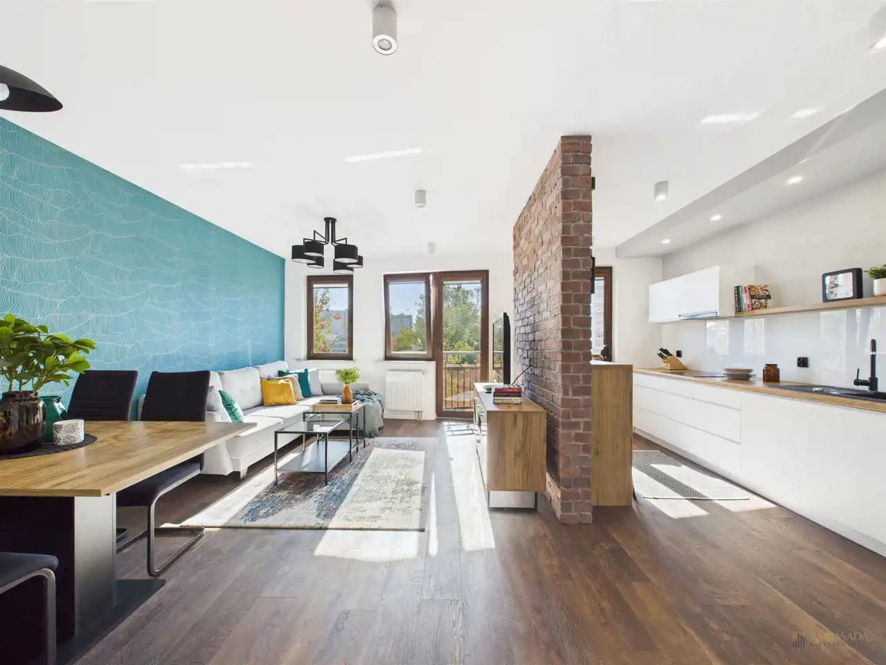 Powierzchnia mieszkalna to 55,50 m2 obejmujące przestronny salon z aneksem kuchennym, wydzieloną składówką/garderobą, oddzielną sypialnię, wygodną łazienkę z wc oraz korytarz. Metraże poszczególnych pomieszczeń zostały umieszczone na rzucie technicznym. Wnętrza wykończone w bardzo dobrym standardzie (5 lat temu mieszkanie przeszło gruntowny remont). Wyposażone w niezbędne zabudowy stałe w kuchni i garderobie oraz meble wolnostojące w salonie. Sypialnia przestronna, wyposażona w funkcjonalne zabudowy. Pełne wyposażenie AGD (lodówka, zmywarka, piekarnik, pralka). Na ścianach dekoracyjna cegła, tapety, na podłogach panel winylowy i terakota. Gotowe do zamieszkania lub pod wynajem od zaraz.