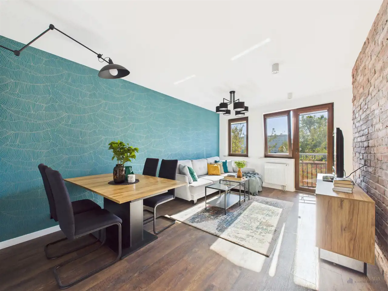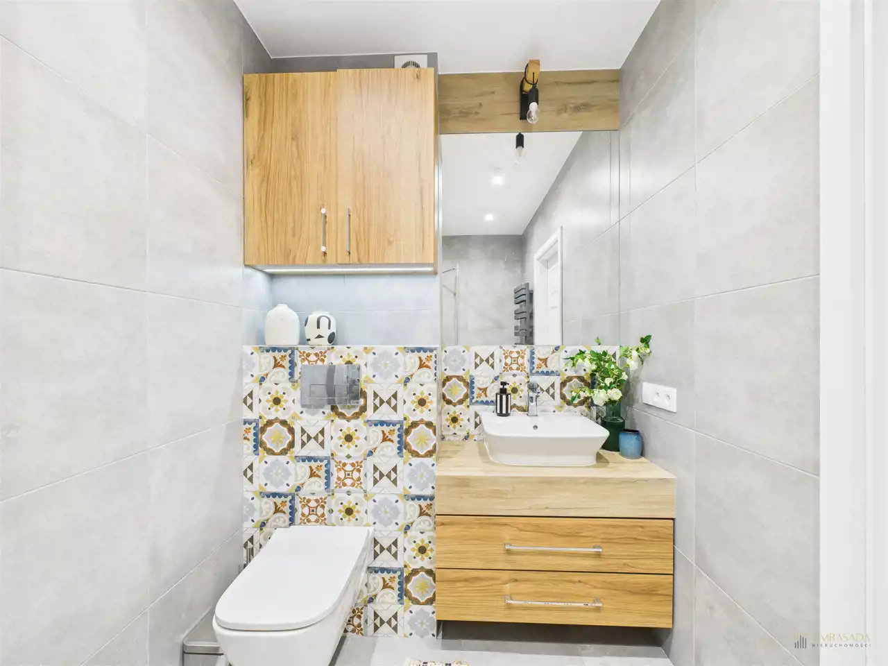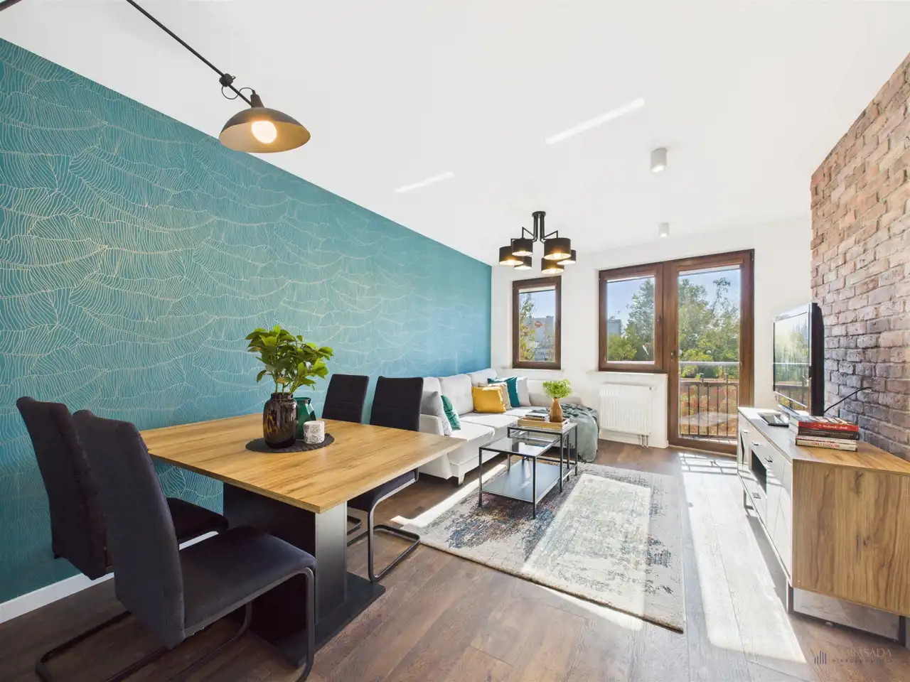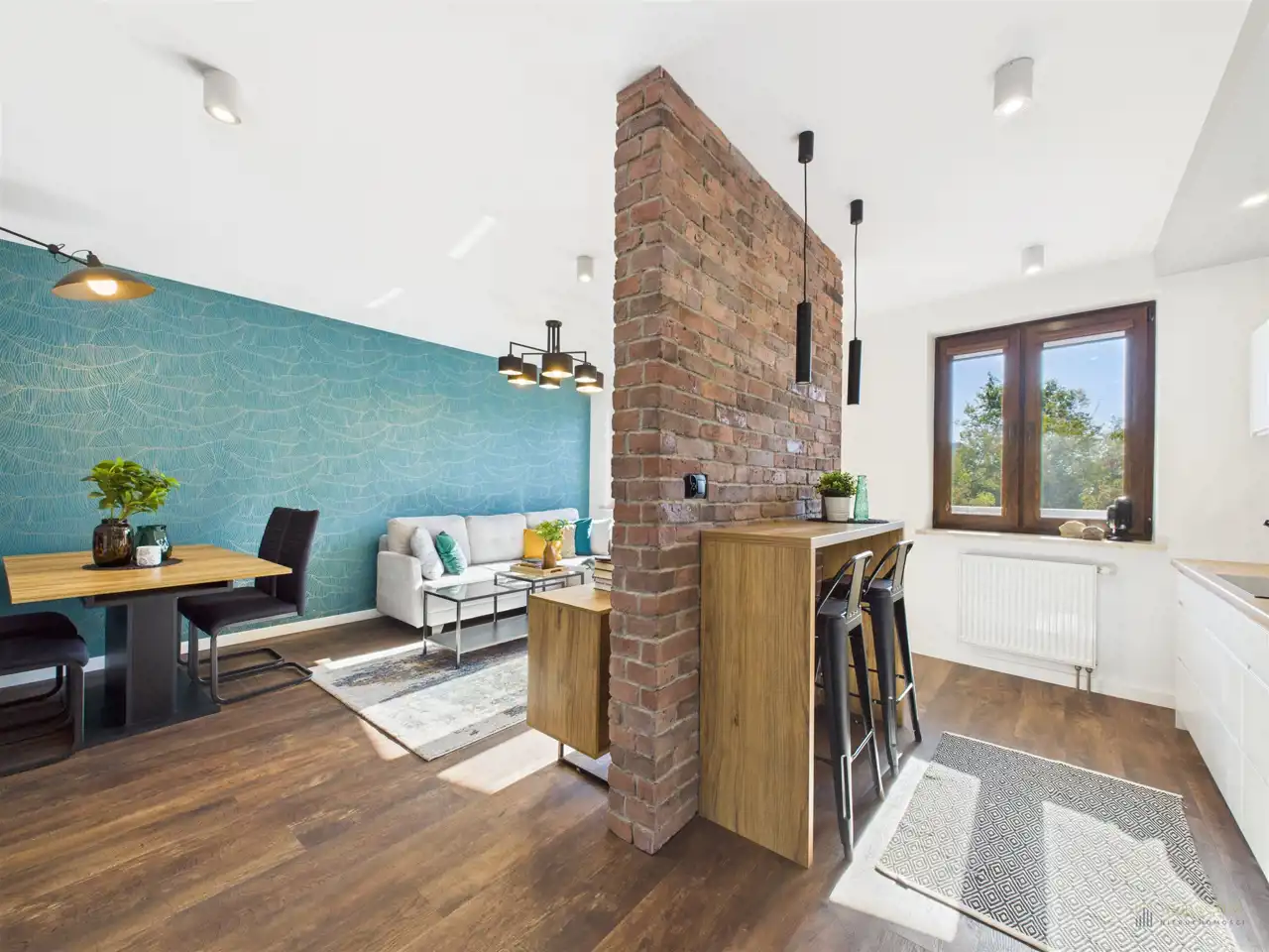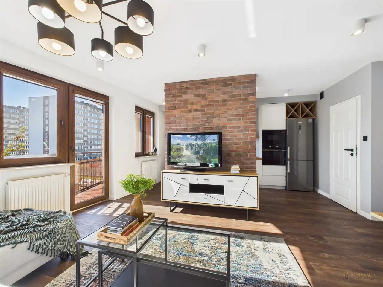 Powierzchnia mieszkalna to 55,50 m2 obejmujące przestronny salon z aneksem kuchennym, wydzieloną składówką/garderobą, oddzielną sypialnię, wygodną łazienkę z wc oraz korytarz. Metraże poszczególnych pomieszczeń zostały umieszczone na rzucie technicznym. Wnętrza wykończone w bardzo dobrym standardzie (5 lat temu mieszkanie przeszło gruntowny remont). Wyposażone w niezbędne zabudowy stałe w kuchni i garderobie oraz meble wolnostojące w salonie. Sypialnia przestronna, wyposażona w funkcjonalne zabudowy. Pełne wyposażenie AGD (lodówka, zmywarka, piekarnik, pralka). Na ścianach dekoracyjna cegła, tapety, na podłogach panel winylowy i terakota. Gotowe do zamieszkania lub pod wynajem od zaraz.