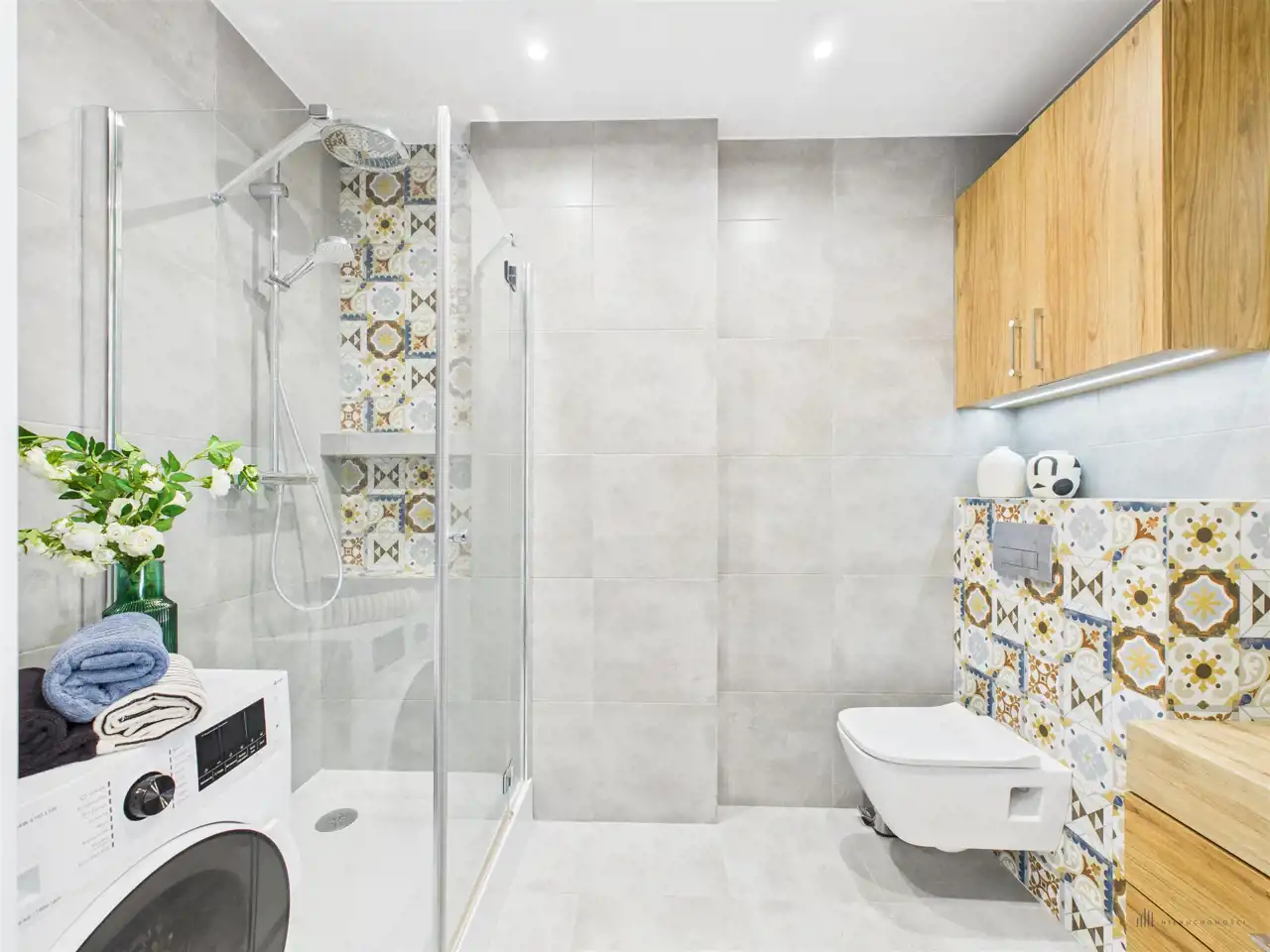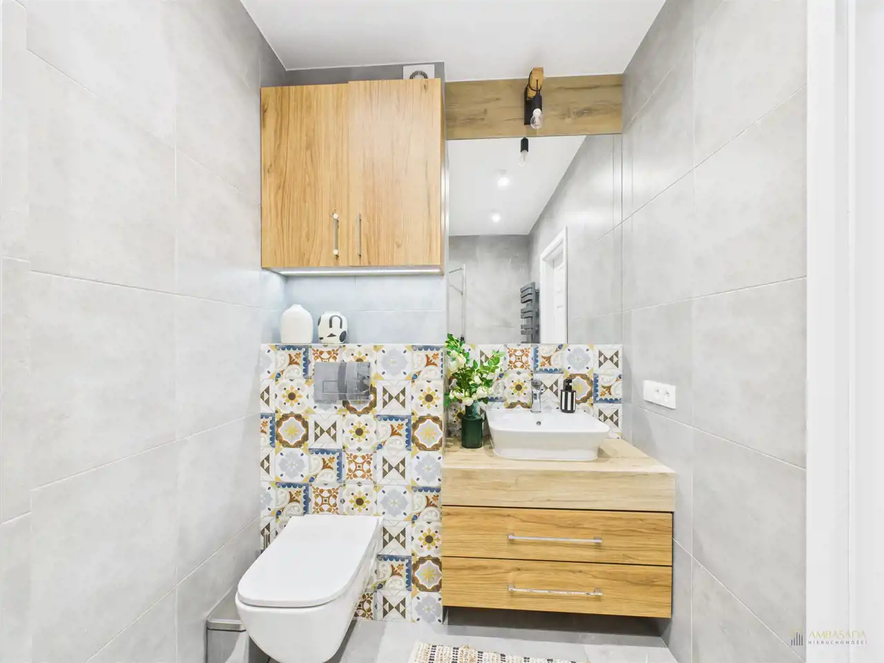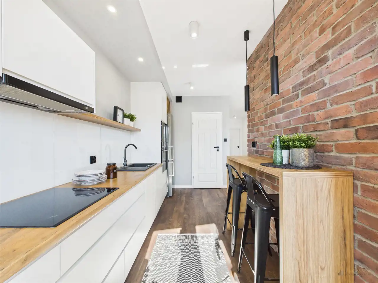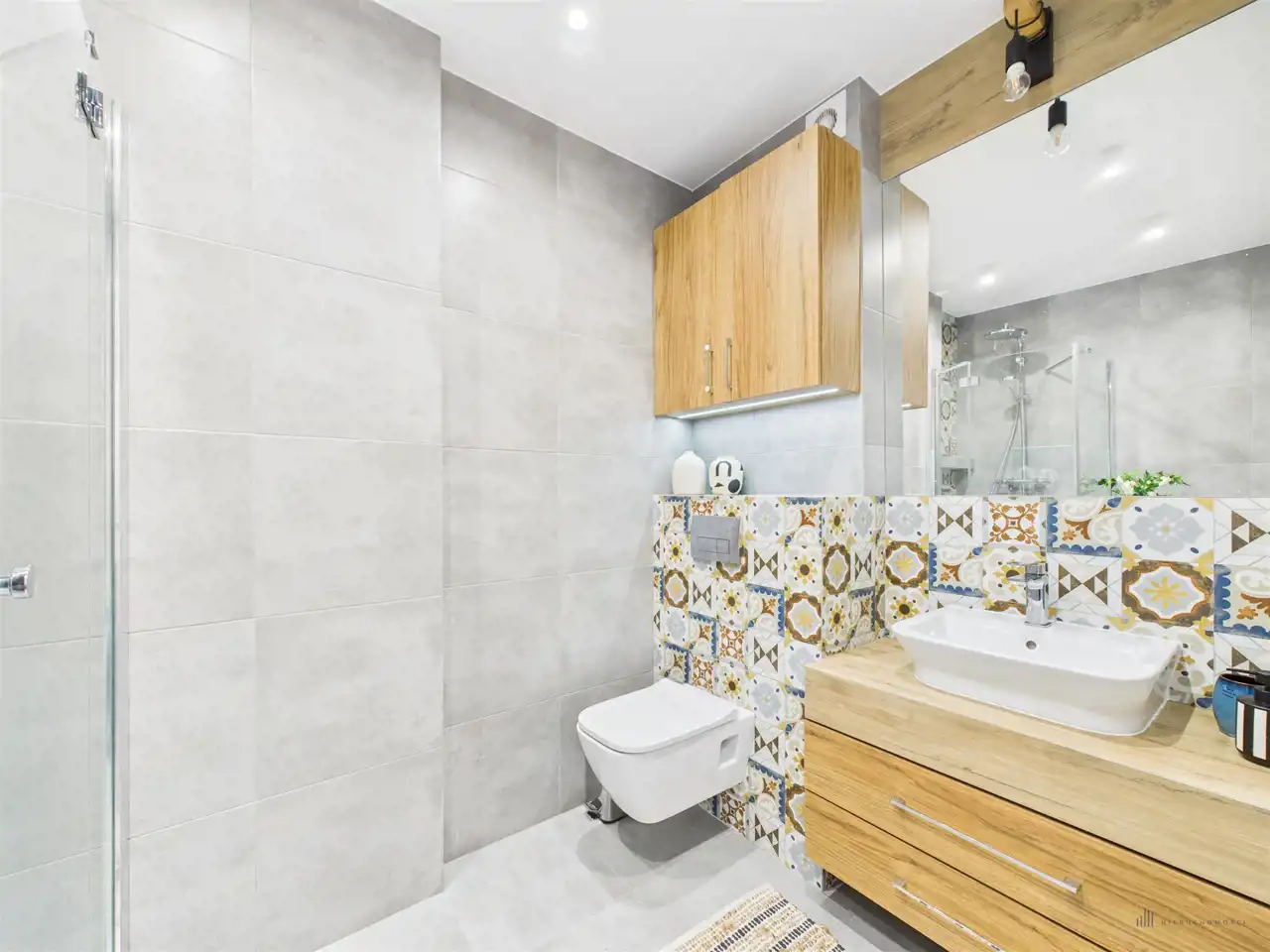 Powierzchnia mieszkalna to 55,50 m2 obejmujące przestronny salon z aneksem kuchennym, wydzieloną składówką/garderobą, oddzielną sypialnię, wygodną łazienkę z wc oraz korytarz. Metraże poszczególnych pomieszczeń zostały umieszczone na rzucie technicznym. Wnętrza wykończone w bardzo dobrym standardzie (5 lat temu mieszkanie przeszło gruntowny remont). Wyposażone w niezbędne zabudowy stałe w kuchni i garderobie oraz meble wolnostojące w salonie. Sypialnia przestronna, wyposażona w funkcjonalne zabudowy. Pełne wyposażenie AGD (lodówka, zmywarka, piekarnik, pralka). Na ścianach dekoracyjna cegła, tapety, na podłogach panel winylowy i terakota. Gotowe do zamieszkania lub pod wynajem od zaraz.