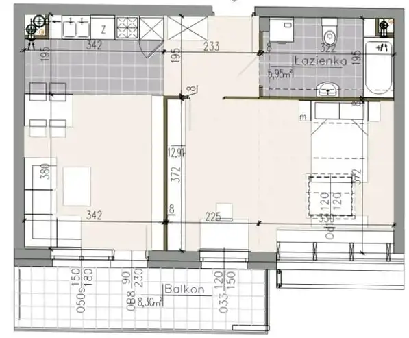Polecamy nieruchomość o powierzchni użytkowej 42,33m2(metraż po podłodze to 49,84m2). Mieszkanie trzypokojowe składa się z salonu połączonego z aneksem kuchennym, dwóch sypialni, łazienki razem z wc oraz przedpokoju. Duży balkon o powierzchni 8,3m2.