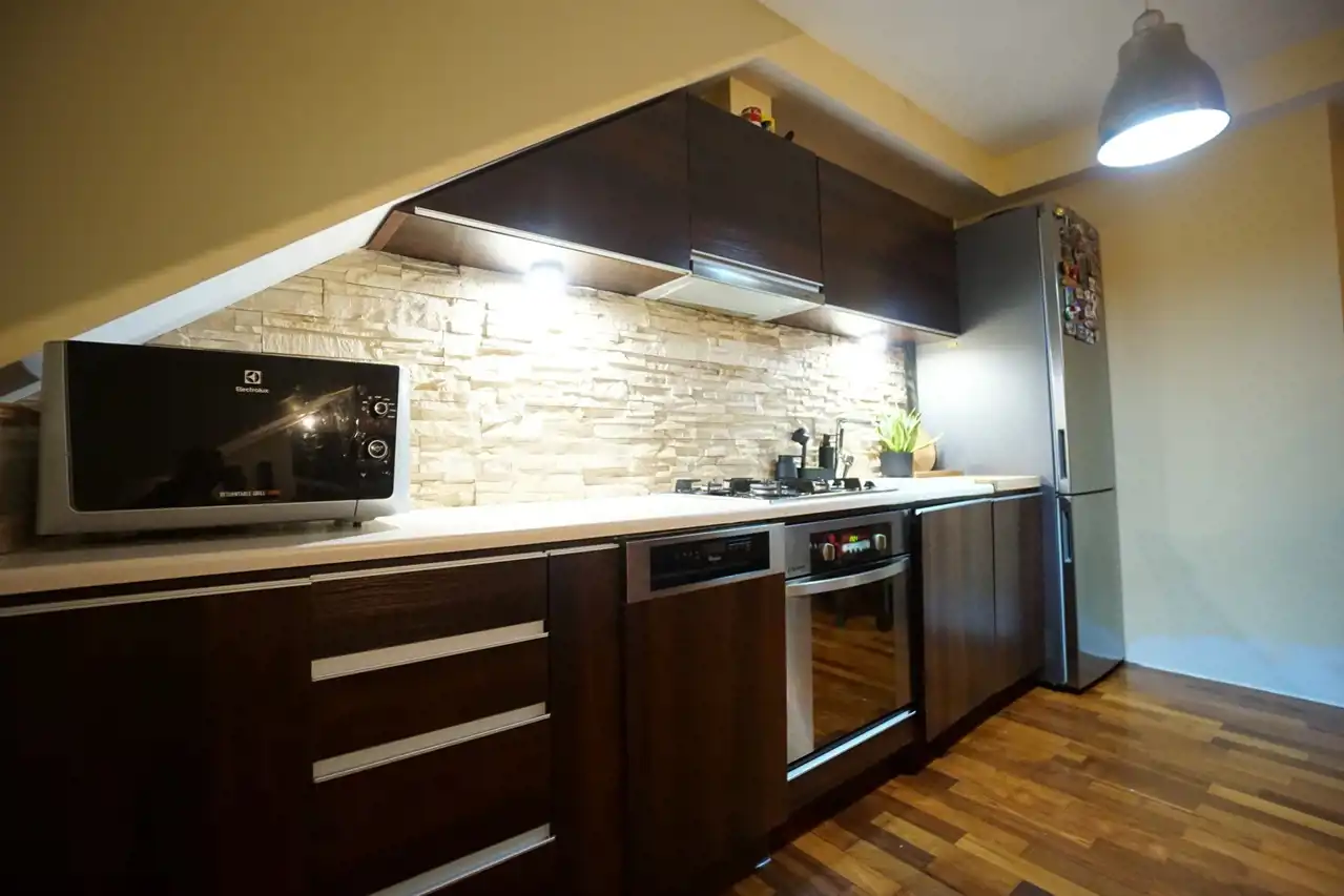 W kuchni mamy w pełni sprawną i wydajną zmywarkę w zabudowie, pojemna energooszczędna lodówkę, piekarnik oraz kuchenkę mikrofalową.