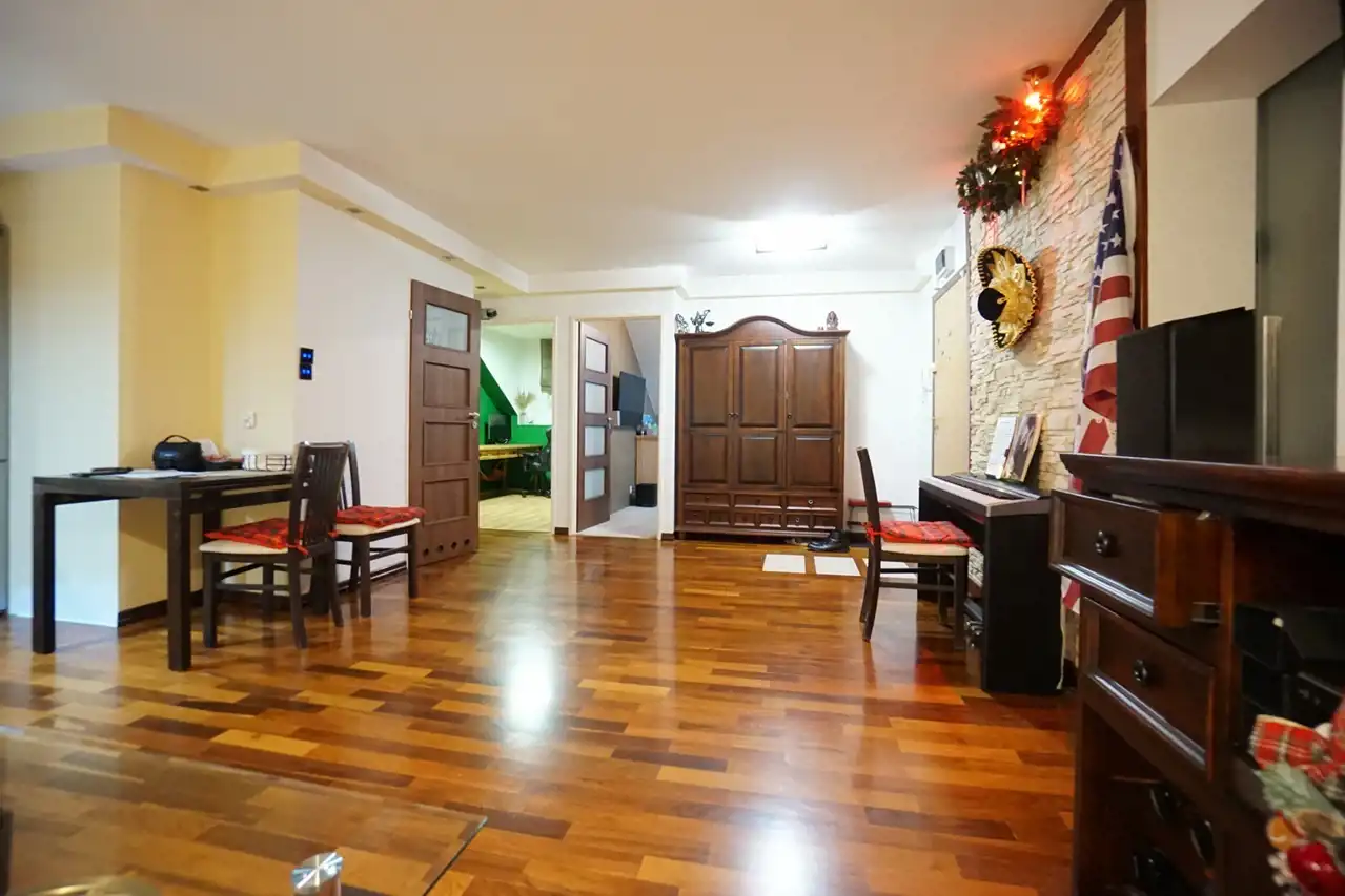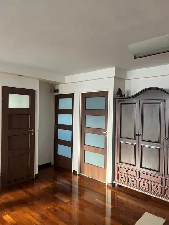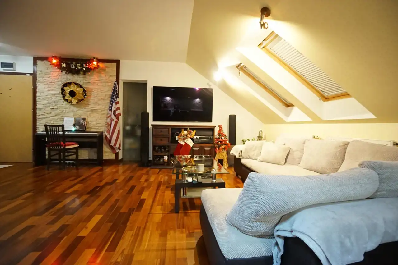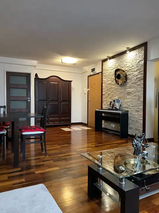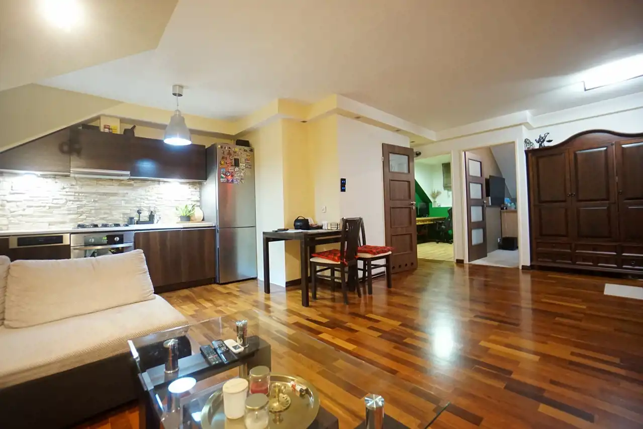 Parkiet w salonie i kuchni jest wykonany z drewna brazylijskiego, które było cyklinowane oraz odpowiednio konserwowane.