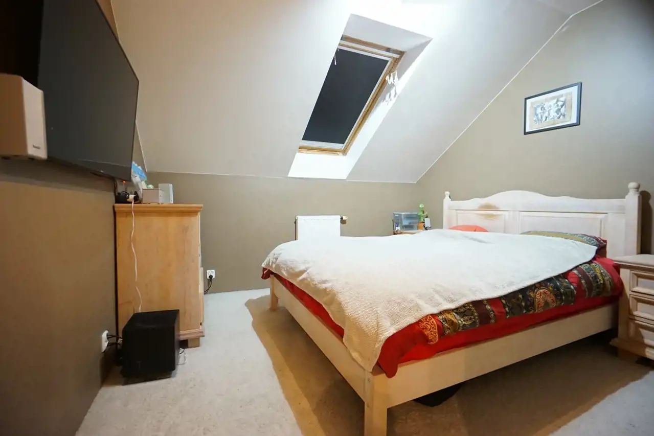 Sypialnia przytulna, z oknem dachowym w której zagościła atmosfera spokoju.
