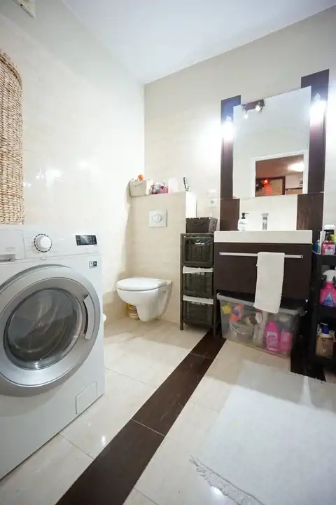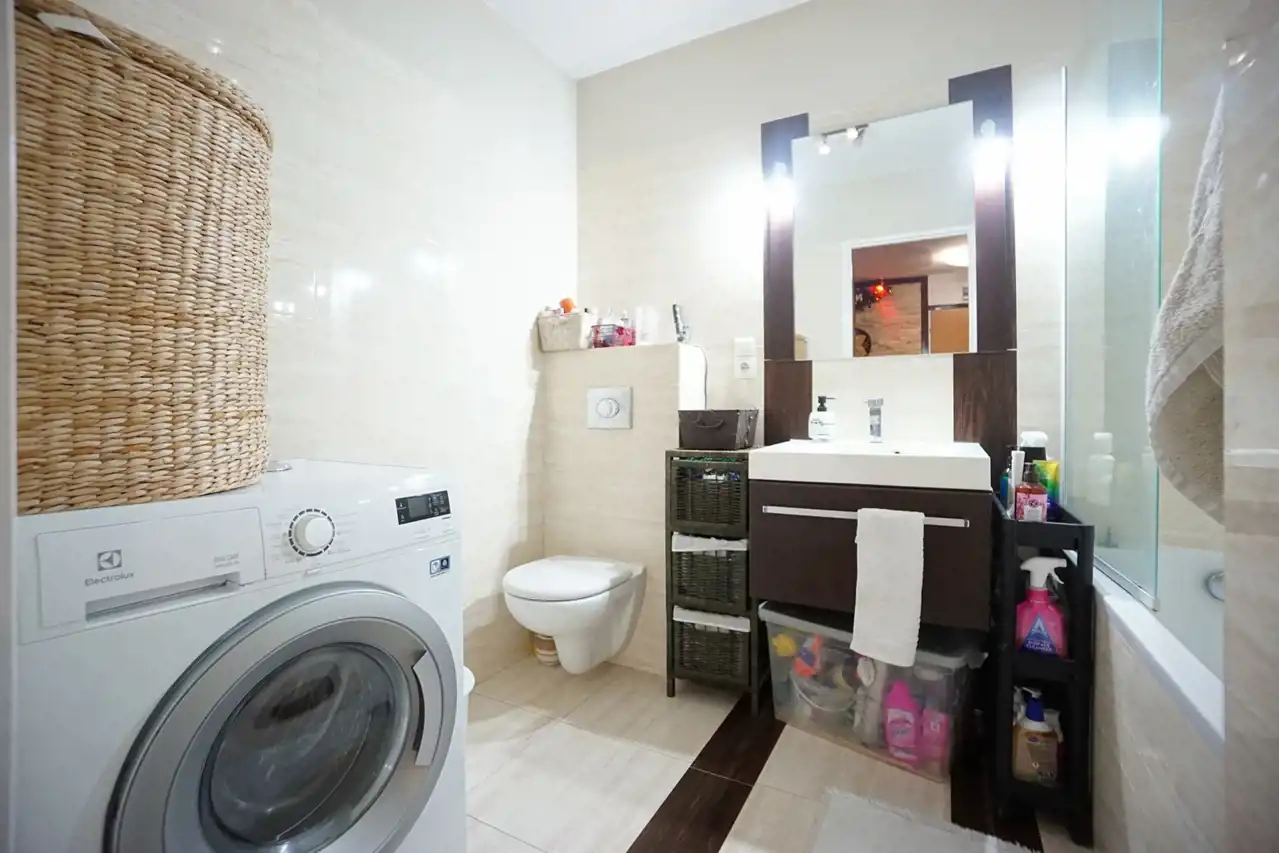 W łazience jest wanna z prysznicem, umywalka oraz pralko-suszarka.