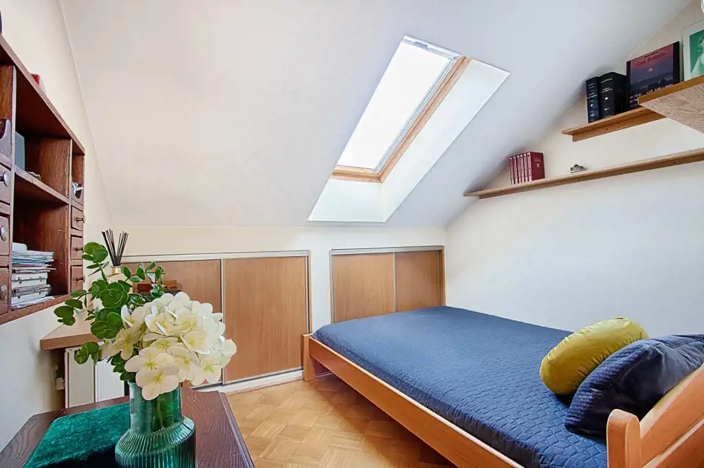 - II poziom: 2 pokoje (zabudowy pod skosami tworzą praktyczne miejsce do przechowywania), łazienka z WC i prysznicem, przedpokój
