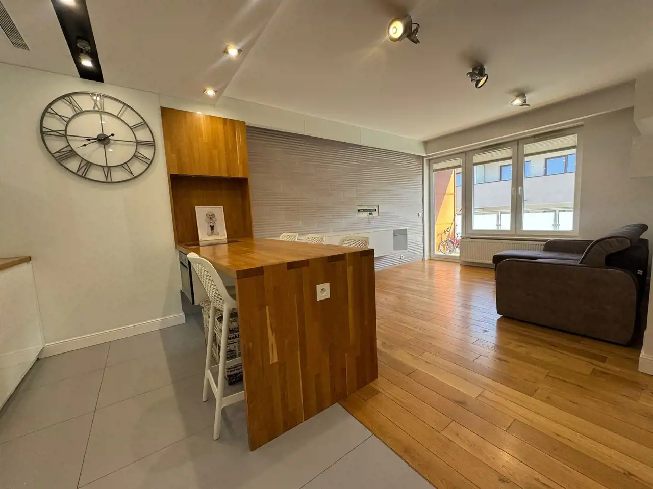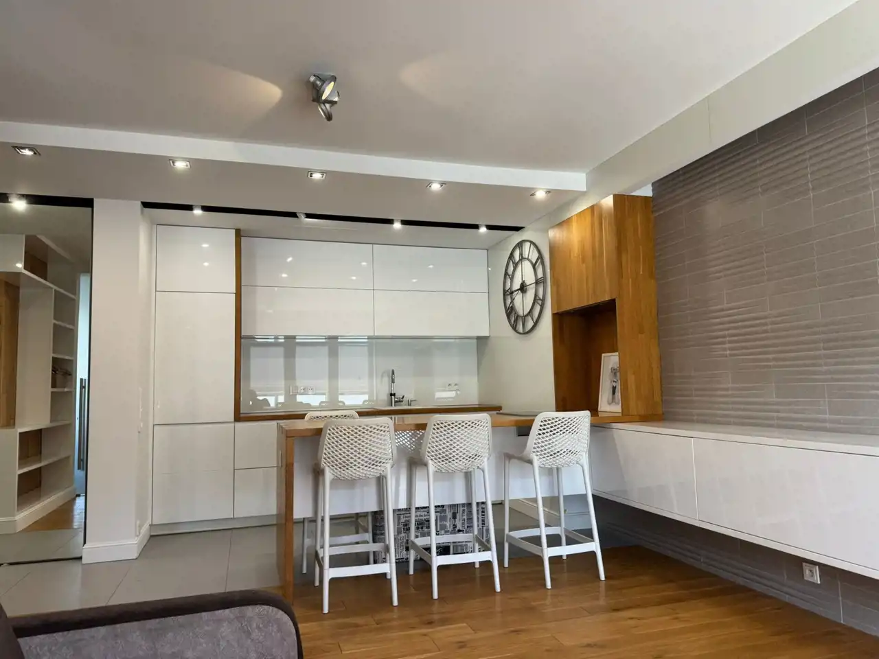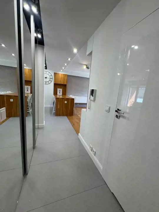 Lokal wykończony w wysokim standardzie, kompletnie urządzony i wyposażony z dbałością o każdy szczegół, pod okiem architekta. Na podłodze drewno, ściany malowane.