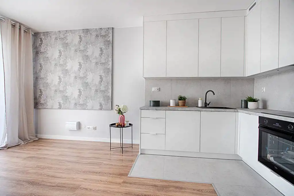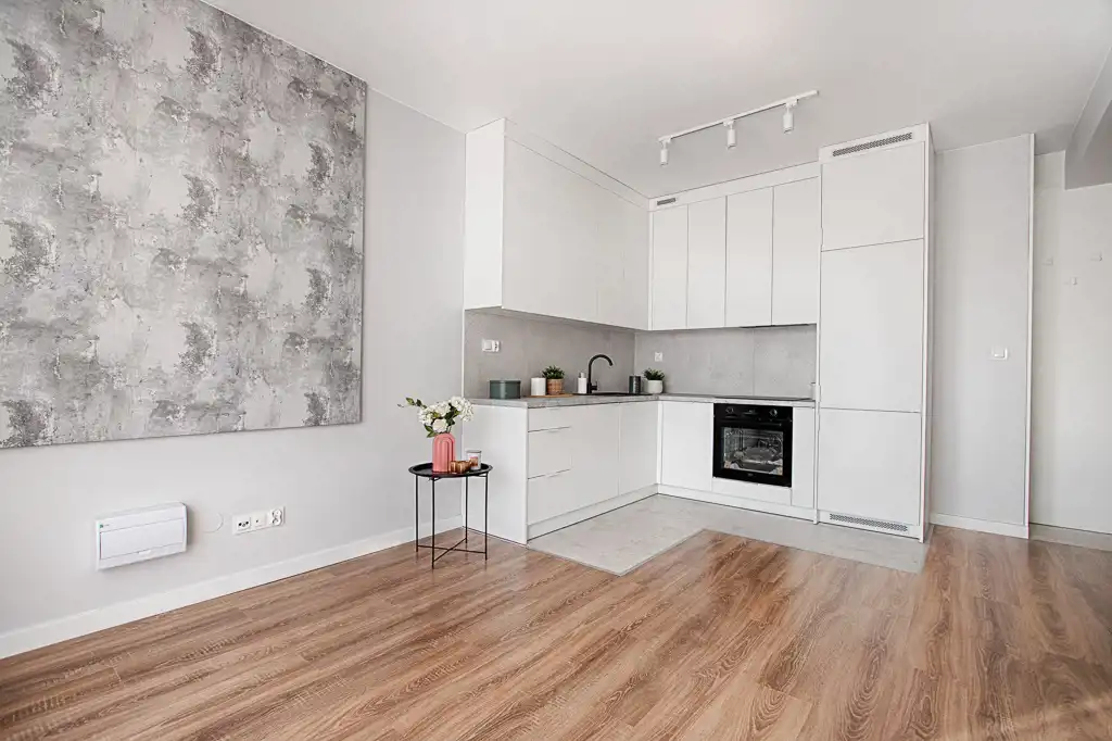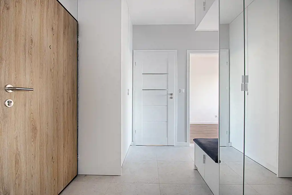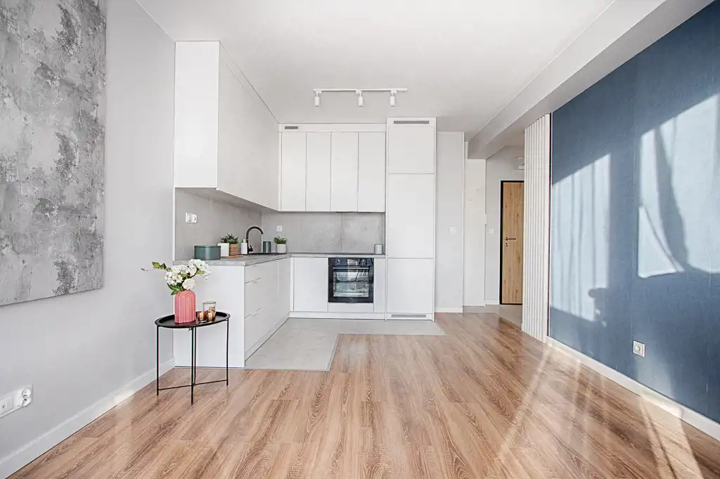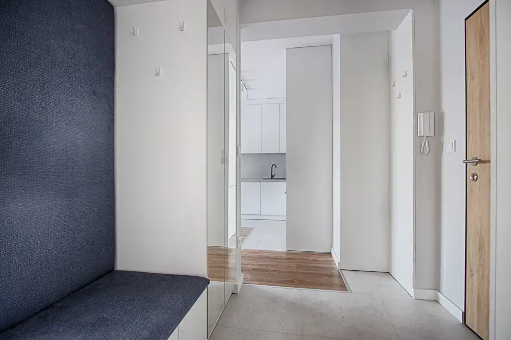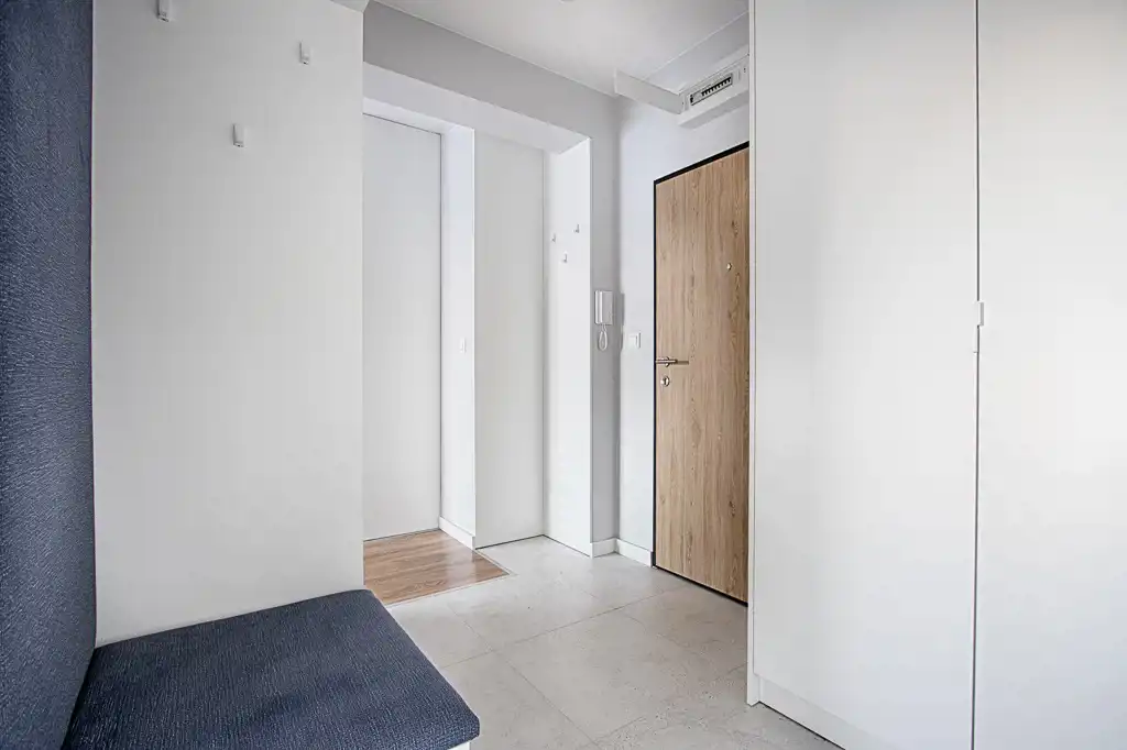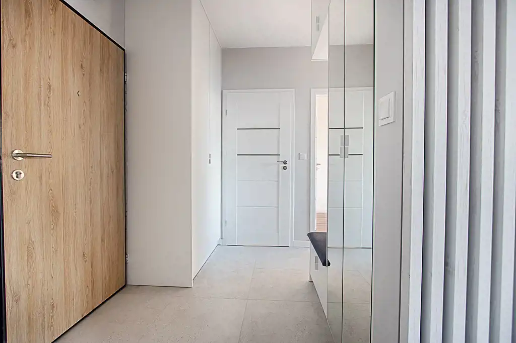 Kuchnia została wykonana na wymiar i wyposażona w sprzęt AGD (lodówka, zmywarka, piekarnik, płyta indukcyjna) – wszystkie urządzenia objęte są gwarancją. W przedpokoju znajdują się funkcjonalne szafy w zabudowie, zapewniające wygodę przechowywania.