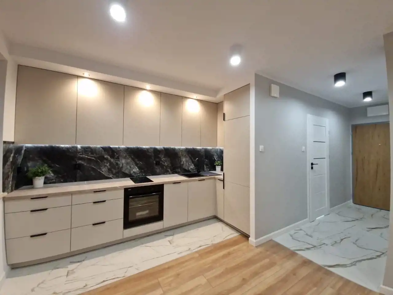 Mieszkanie wykończone gotowe do odbioru koniec maja 2026r. przy wykorzystaniu materiałów wysokiej jakości z nowym sprzętem agd w kuchni(sprzęt - piekarnik, lodówka, płyta indukcyjna, okap, zmywarka). Kuchnia w pełnej zabudowie na wymiar. W salonie klimatyzacja