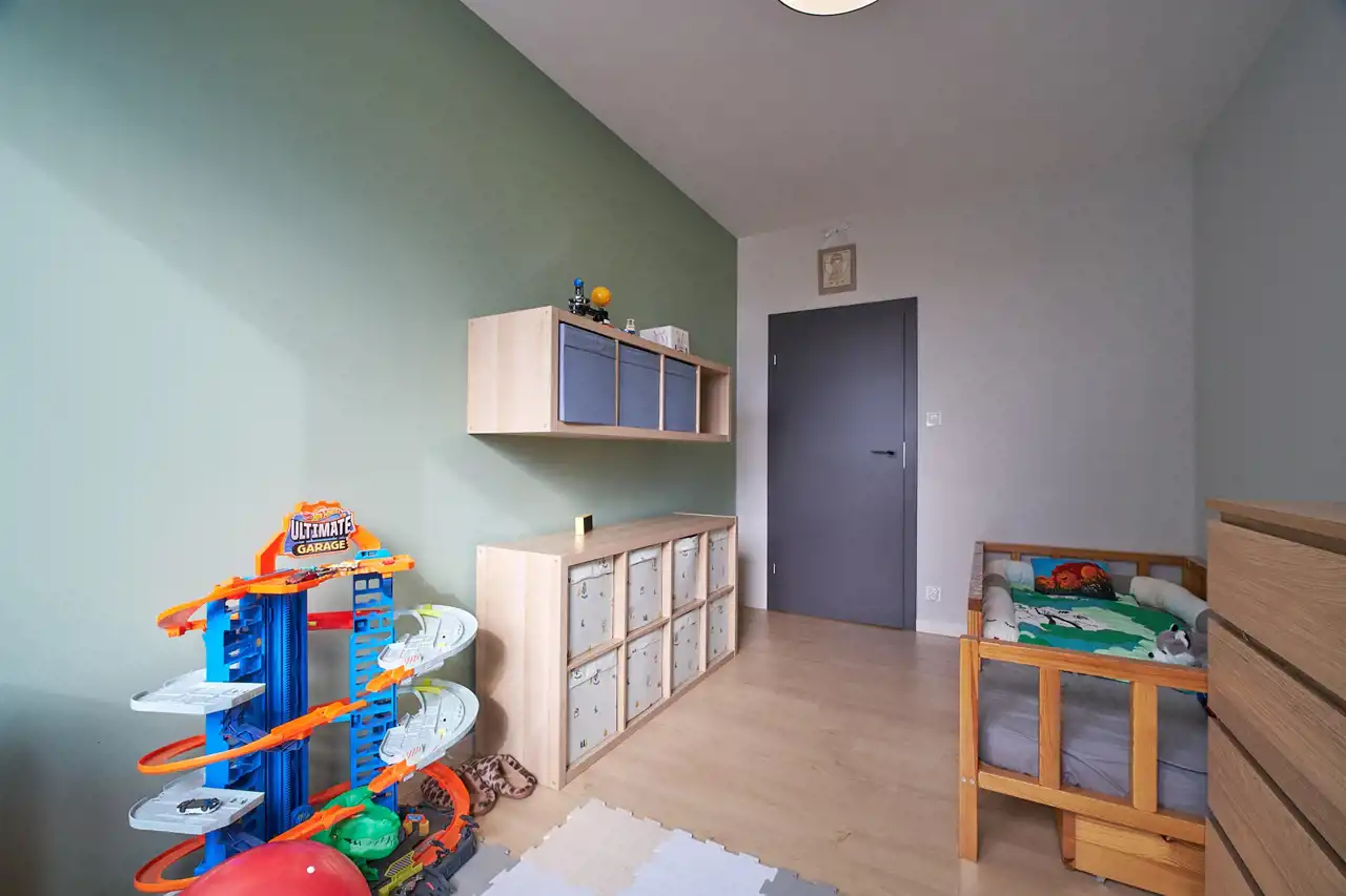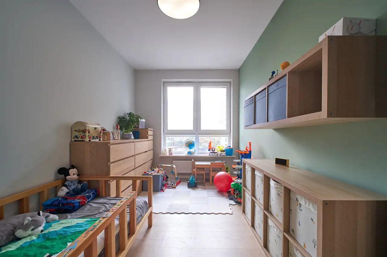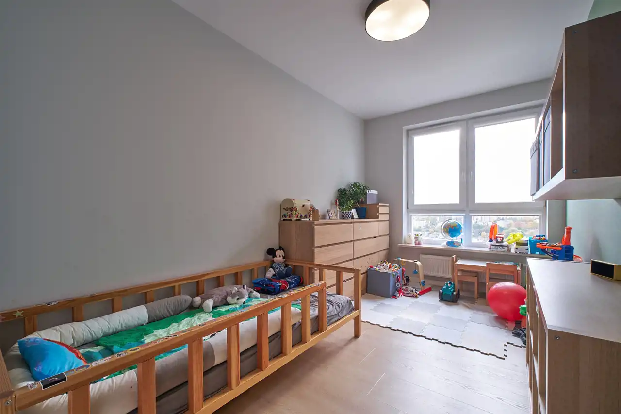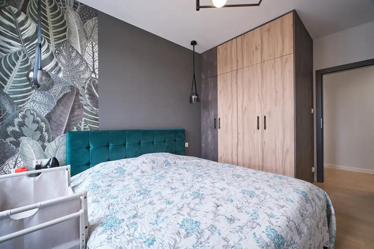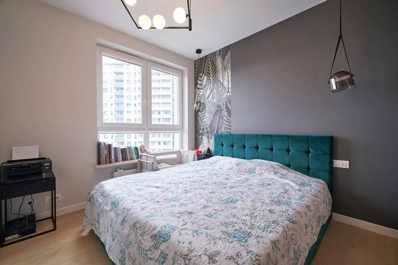 Salon z aneksem kuchennym tworzy serce mieszkania. Z salonu jest wyjście na duży balkon z ładnym widokiem na panoramę miasta. Kuchnia została w pełni zaprojektowana i wykonana na wymiar i wyposażona w sprzęt AGD. Jest to miejsce zarówno estetyczne ja i praktyczne. Sypialnia małżeńska wyposażona w łoże oraz szafę, dalej znajdziemy duży pokój dziecięcy. Łazienka wyposażona w wannę z funkcją prysznica. Wnętrze utrzymane jest w spójnej kolorystyce i jest utrzymane w aktualnie obowiązujących trendach.