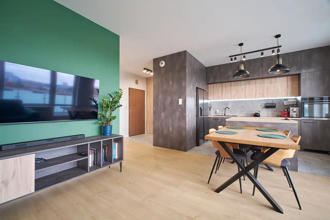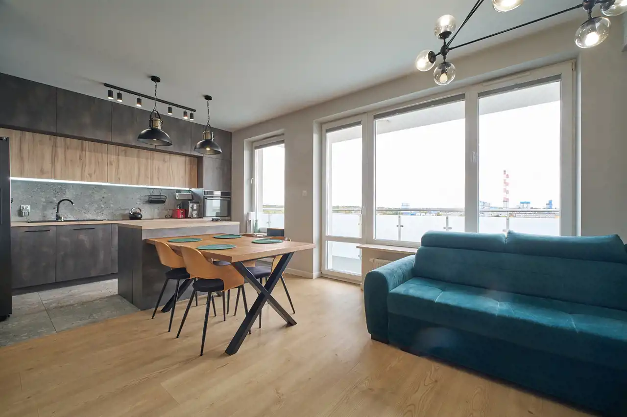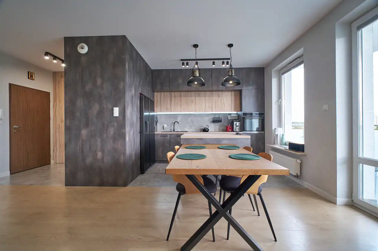 Apartament - Ten nowoczesny 3 pokojowy apartament został zaprojektowany z myślą o komforcie i funkcjonalności. Wnętrze łączy elegancki minimalizm z ciepłem naturalnych materiałów tworząc przestrzeń idealną do życia i relaksu.