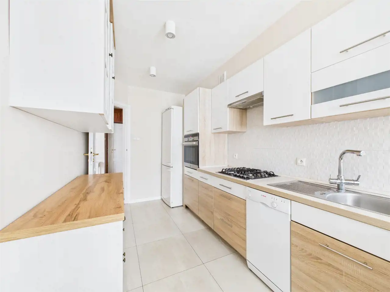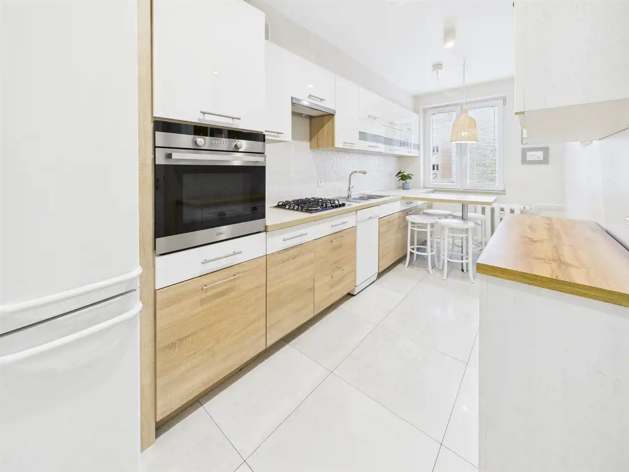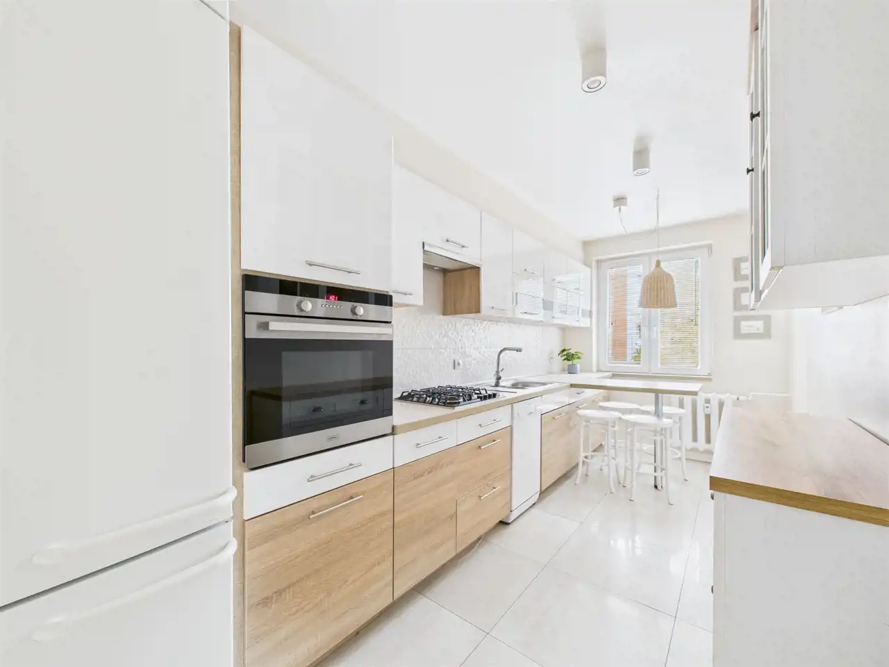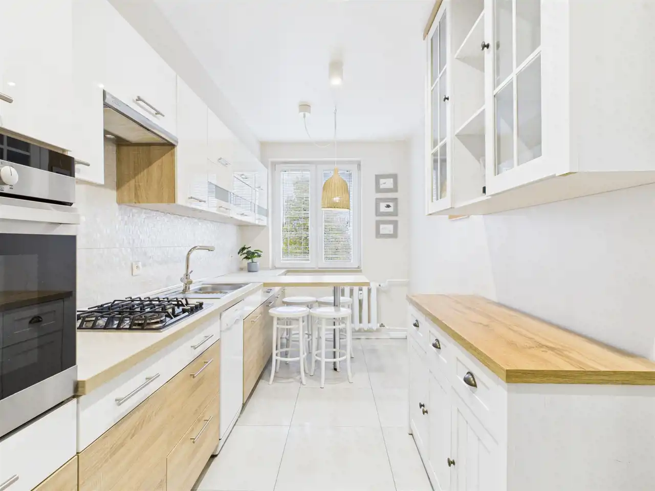 Kuchnia – oddzielna, jasna i funkcjonalna, w pełnej zabudowie meblowej wykonanej na wymiar. W wyposażeniu wysokiej klasy sprzęt AGD: zmywarka, płyta gazowa, piekarnik.