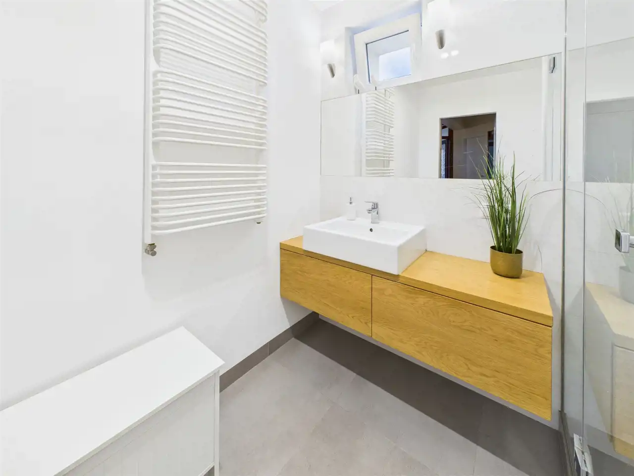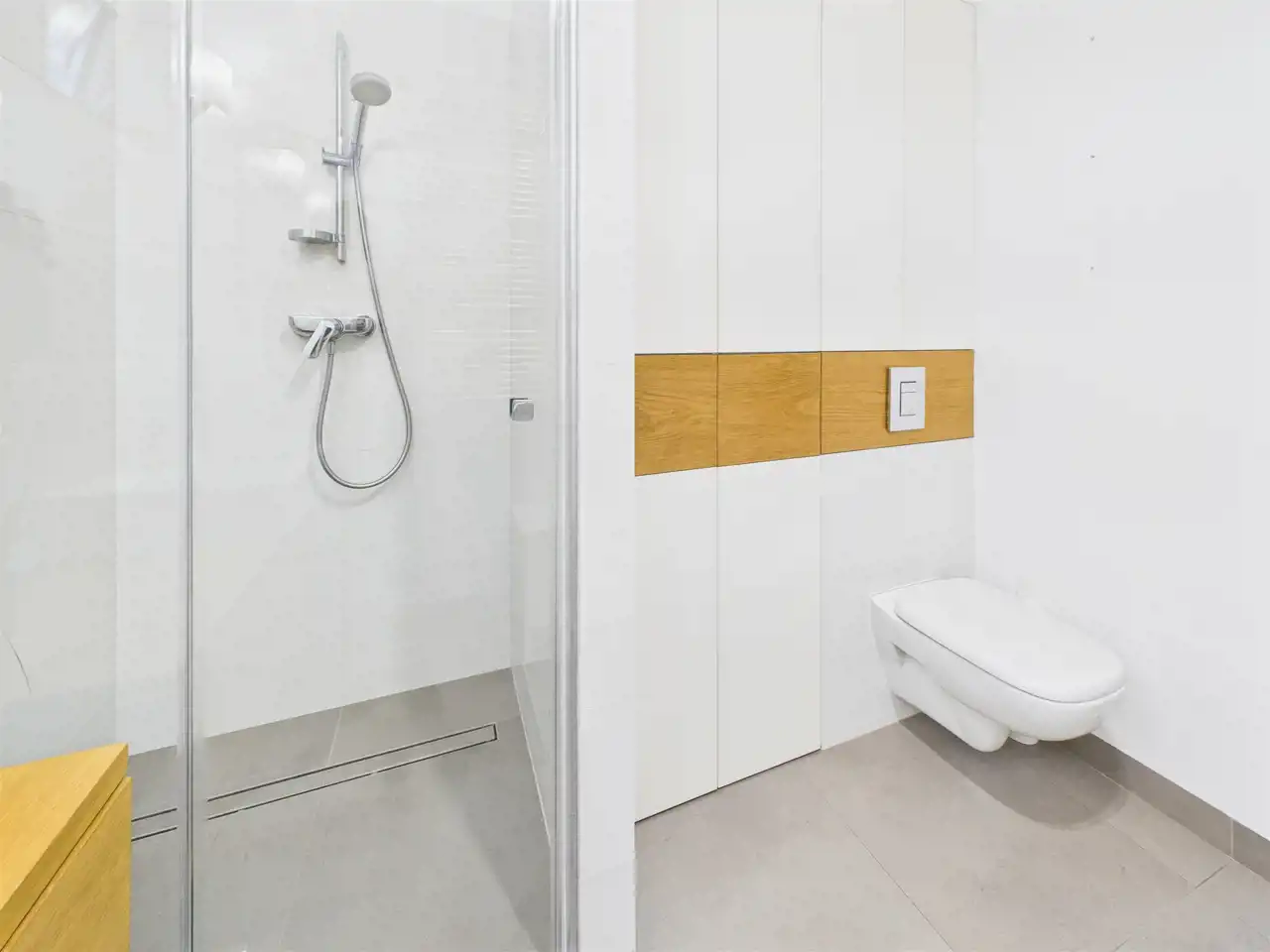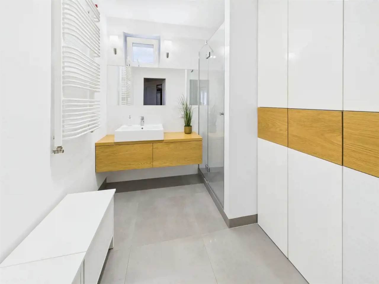 Łazienka – elegancko zaaranżowana, z kabina prysznicową oraz zabudową meblową z miejscem na pralkę i dużą ilością przestrzeni do przechowywania.