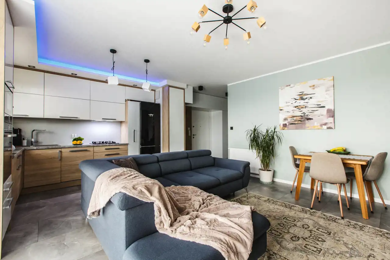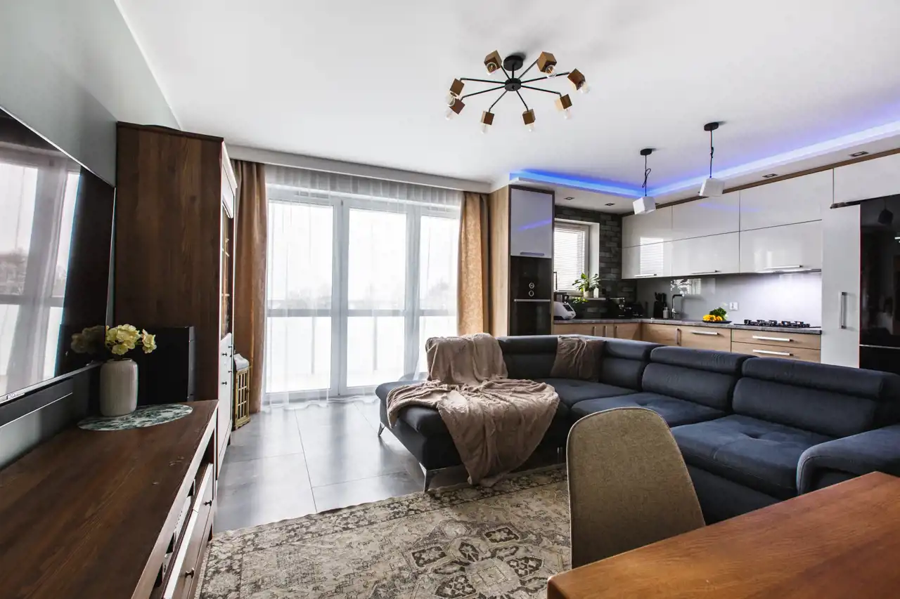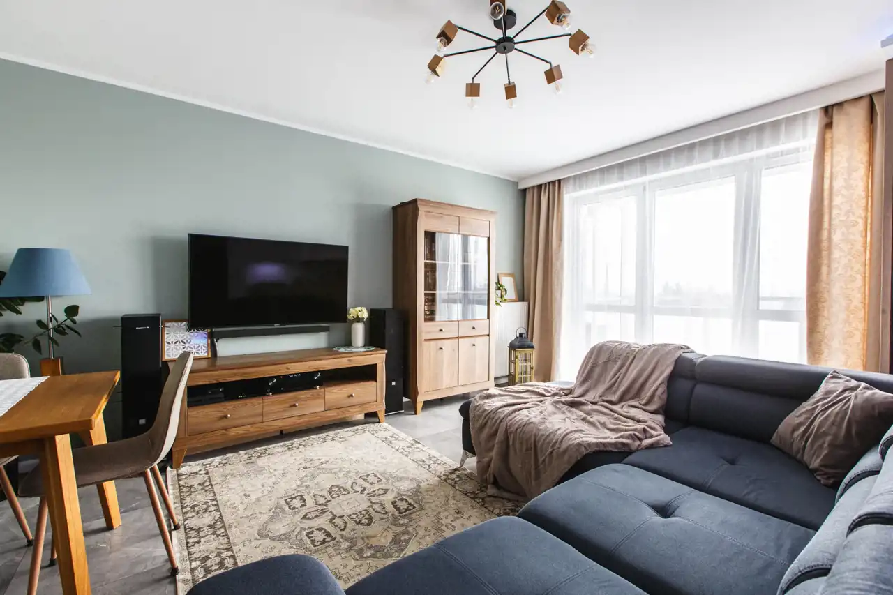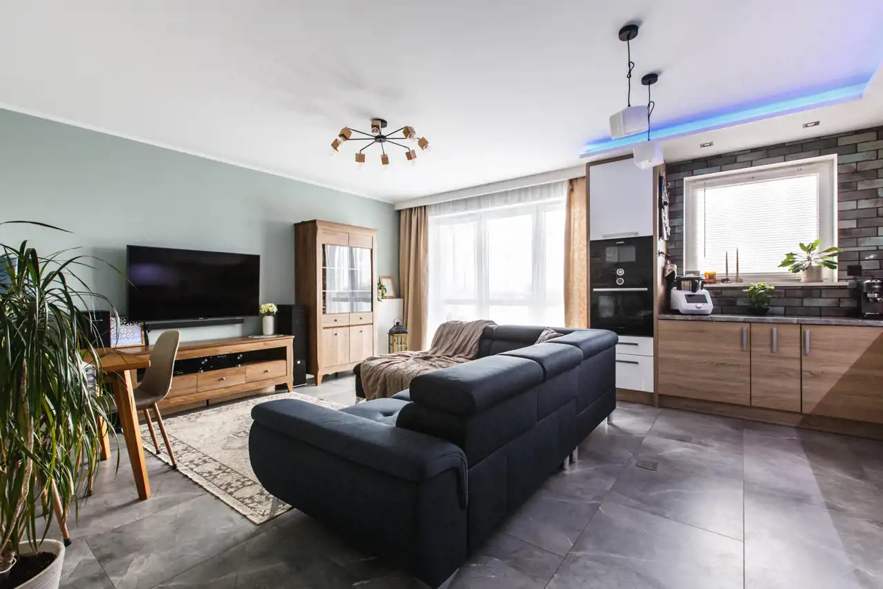 Mieszkanie wykończone w wysokim standardzie, na podłodze solidne panele winylowe i gres o wymiarze 120x60, ściany malowane, w korytarzu nowoczesne oświetlenie, duża łazienka z wc w przyjemnej kolorystyce - z wanną i prysznicem. Aneks kuchenny wyposażony z sprzęt AGD i płynnie łączący się z jadalnią oraz salonem. Stałe zabudowy i część wyposażenia w cenie!