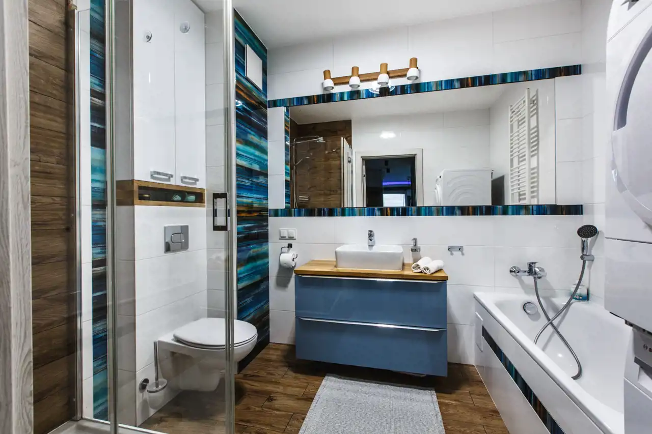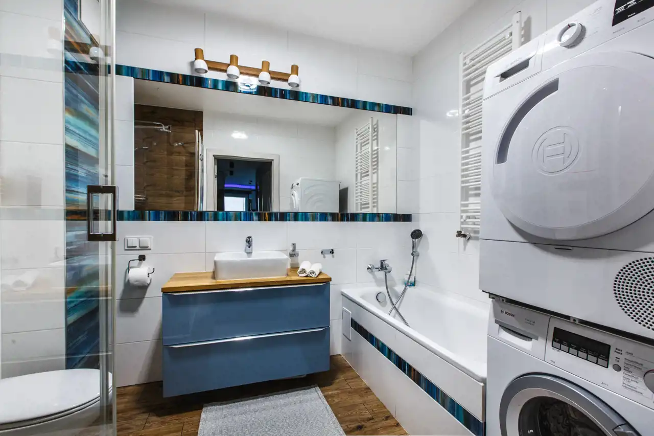 - ŁAZIENKA Z WC - z kabiną prysznicową oraz zabudową stałą, pralką, a także z wanną