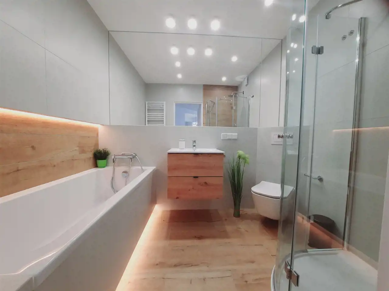 Apartament jest w bardzo dobrym stanie technicznym – wysoki standard, dwustronny. Wnętrze wykończone zostało drogimi materiałami wysokiej jakości. W łazience z wc - podwieszany sufit z halogenami.