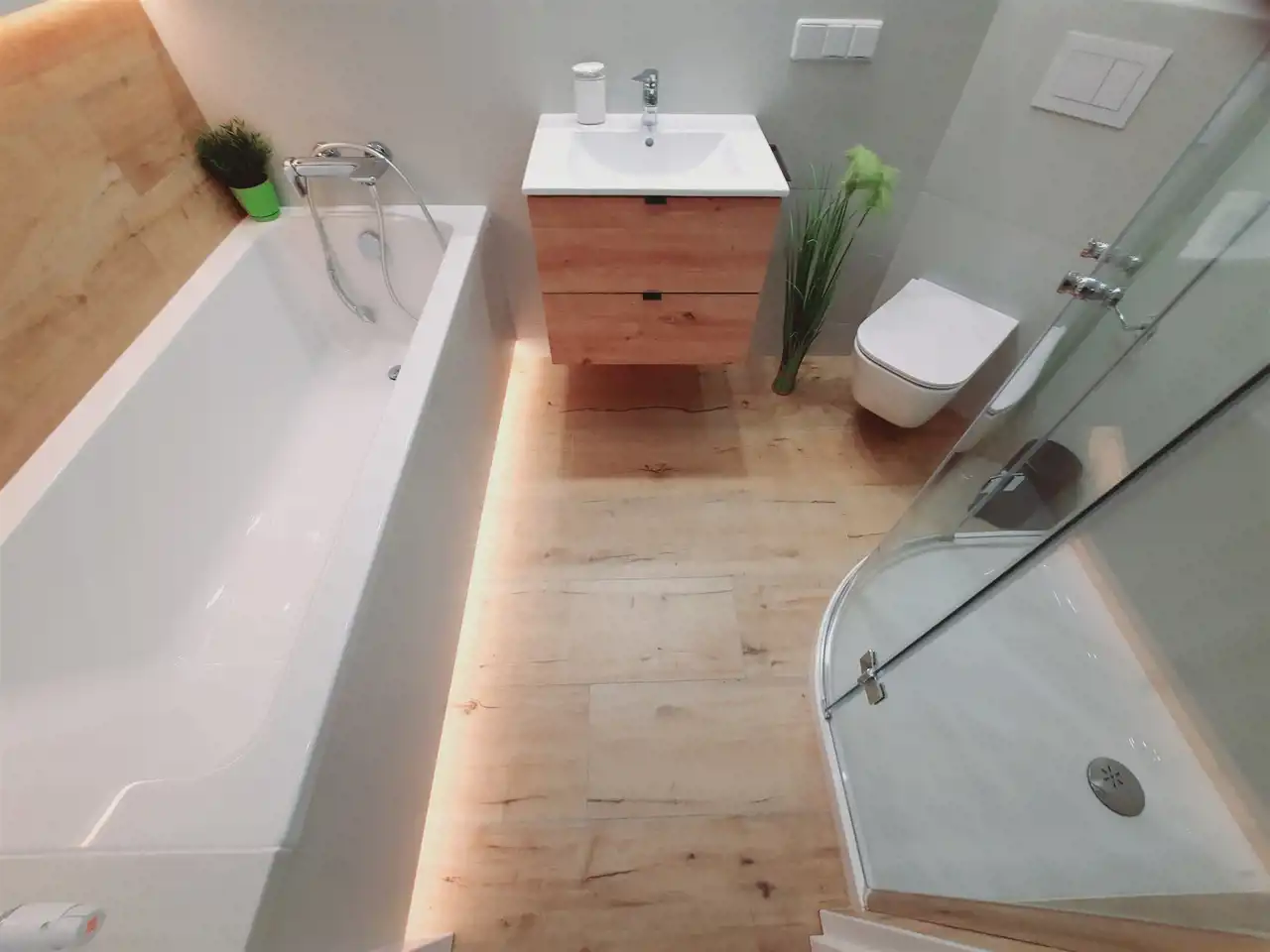 Łazienka z wc i przedpokój – na podłodze gres.