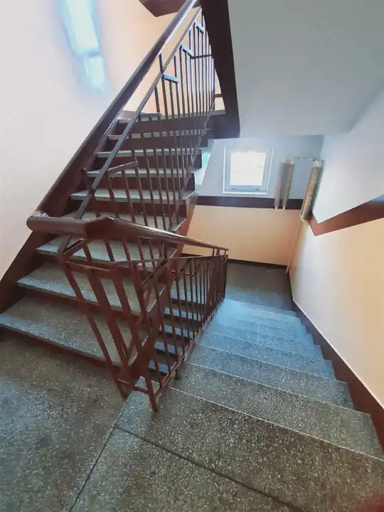 Przestronna, czysta i zadbana klatka schodowa.