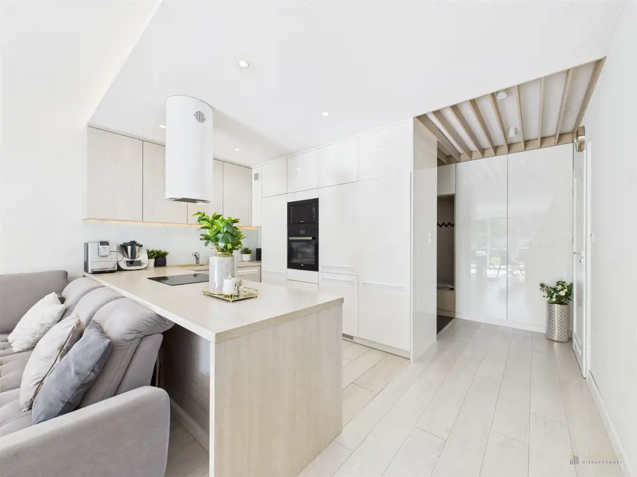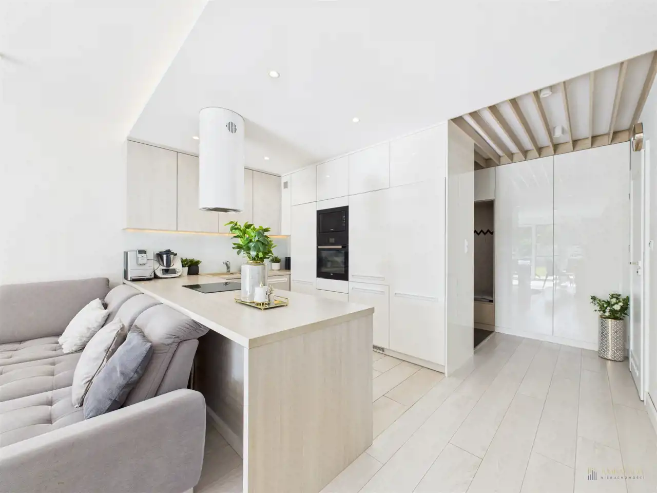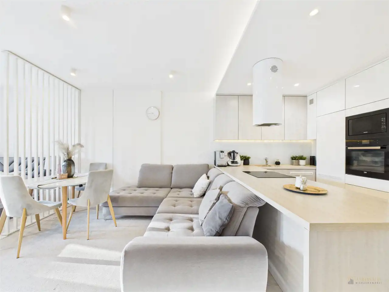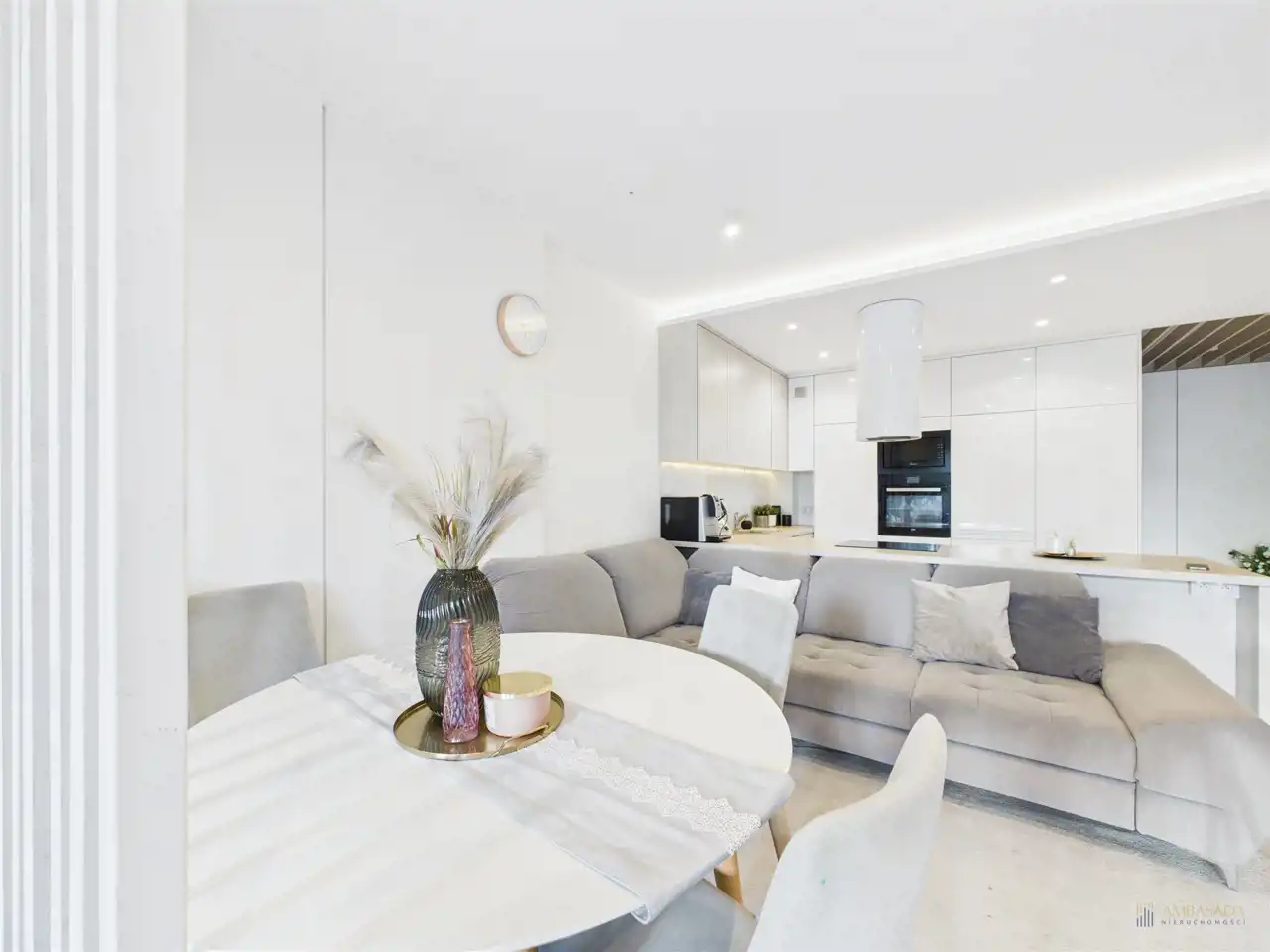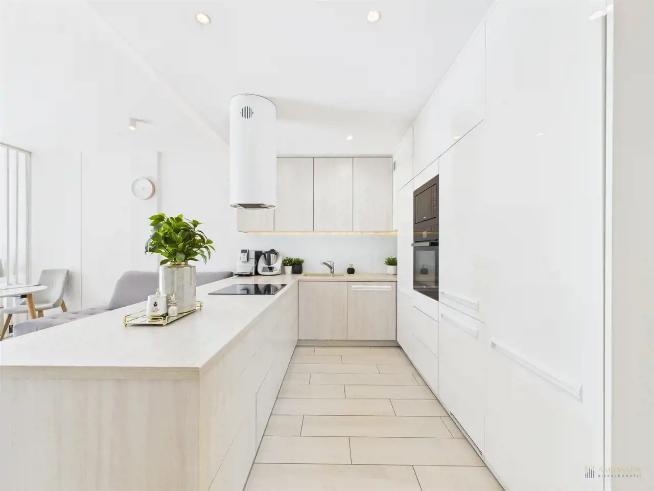 • Przestronny salon z aneksem kuchennym – jasny, z dużymi przeszkleniami od podłogi do sufitu, które nadają wnętrzu spektakularny efekt. Aneks kuchenny wykonany na zamówienie przez stolarza: białe meble w połysku, blat w odcieniu jasnego drewna, pojemne szafki cargo, pełne wyposażenie AGD (piekarnik, płyta indukcyjna, mikrofalówka, okap, zmywarka, lodówka). Dodatkowym atutem jest funkcjonalna wyspa/bar kuchenny, idealny do wspólnych posiłków i spotkań z bliskimi. W części jadalnianej znajduje się duży, rozkładany stół z czterema welurowymi krzesłami. Strefa wypoczynkowa to rozkładany narożnik.