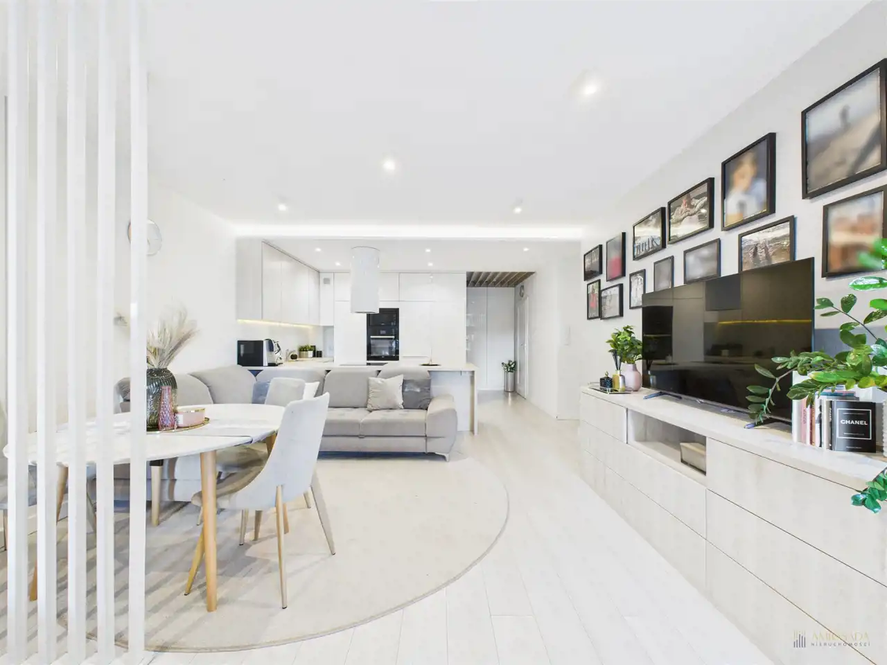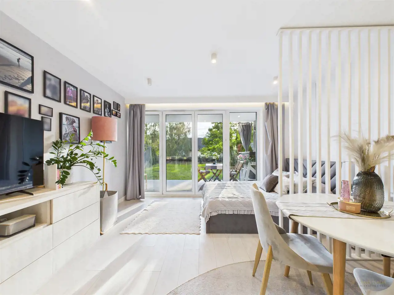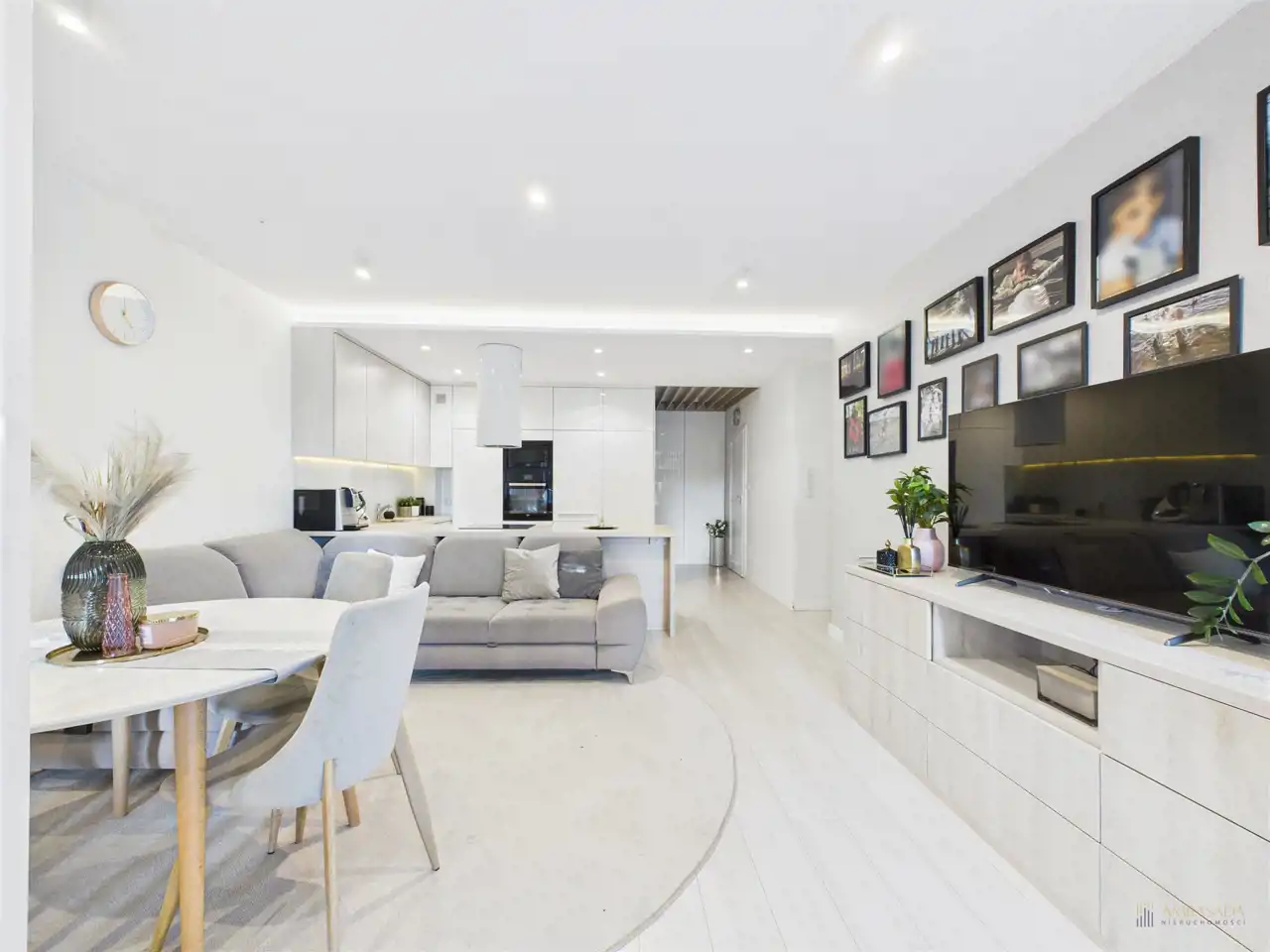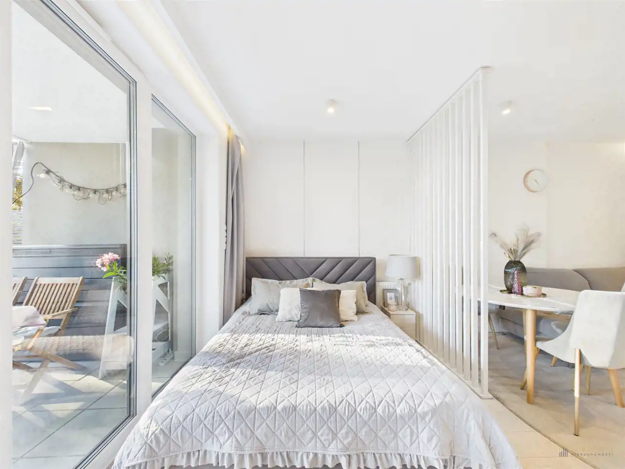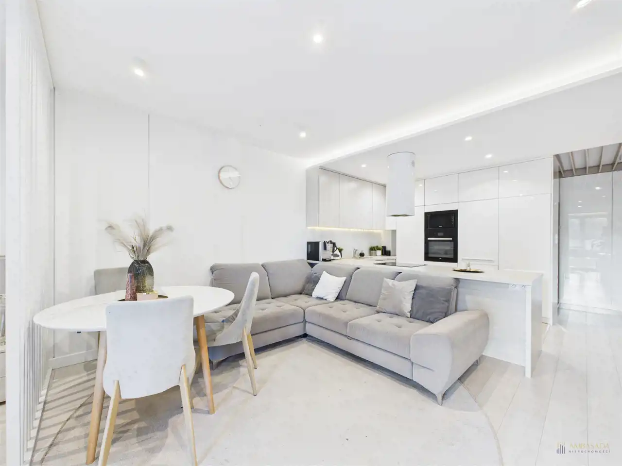 • Przestronny salon z aneksem kuchennym – jasny, z dużymi przeszkleniami od podłogi do sufitu, które nadają wnętrzu spektakularny efekt. Aneks kuchenny wykonany na zamówienie przez stolarza: białe meble w połysku, blat w odcieniu jasnego drewna, pojemne szafki cargo, pełne wyposażenie AGD (piekarnik, płyta indukcyjna, mikrofalówka, okap, zmywarka, lodówka). Dodatkowym atutem jest funkcjonalna wyspa/bar kuchenny, idealny do wspólnych posiłków i spotkań z bliskimi. W części jadalnianej znajduje się duży, rozkładany stół z czterema welurowymi krzesłami. Strefa wypoczynkowa to rozkładany narożnik.