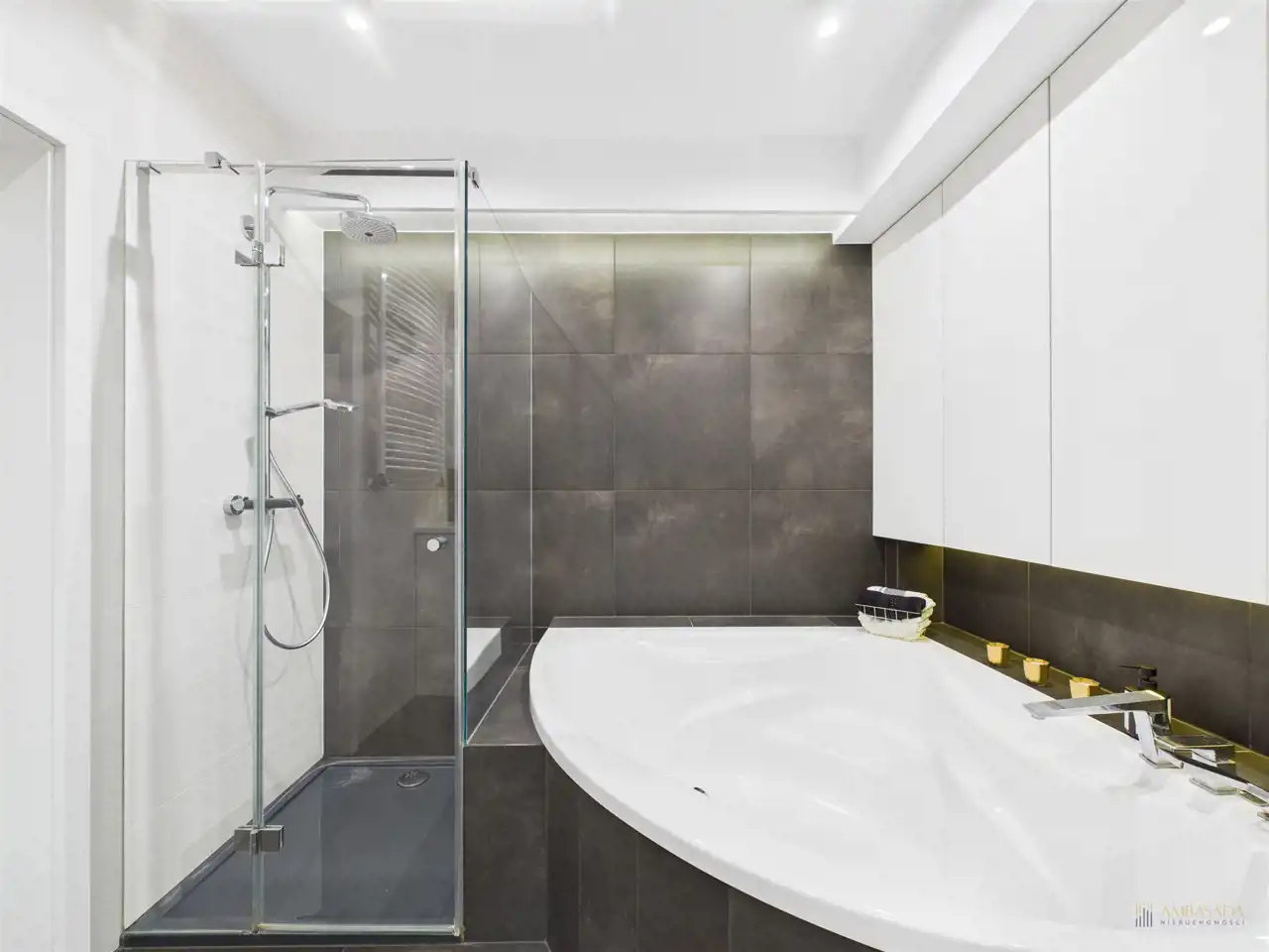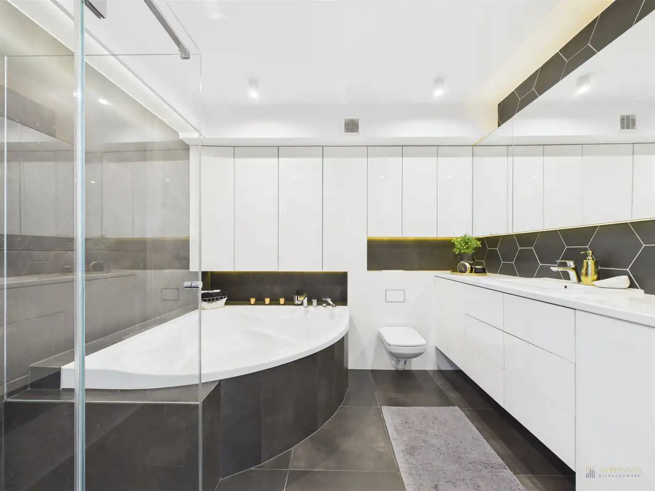 • Łazienka (pokój kąpielowy) – wyjątkowo przestronna, z narożną wanną, dużym prysznicem 1x1 m, WC oraz zabudowaną pralką. W łazience również znajdują się elementy lustrzane, które podkreślają nowoczesny charakter wnętrza.