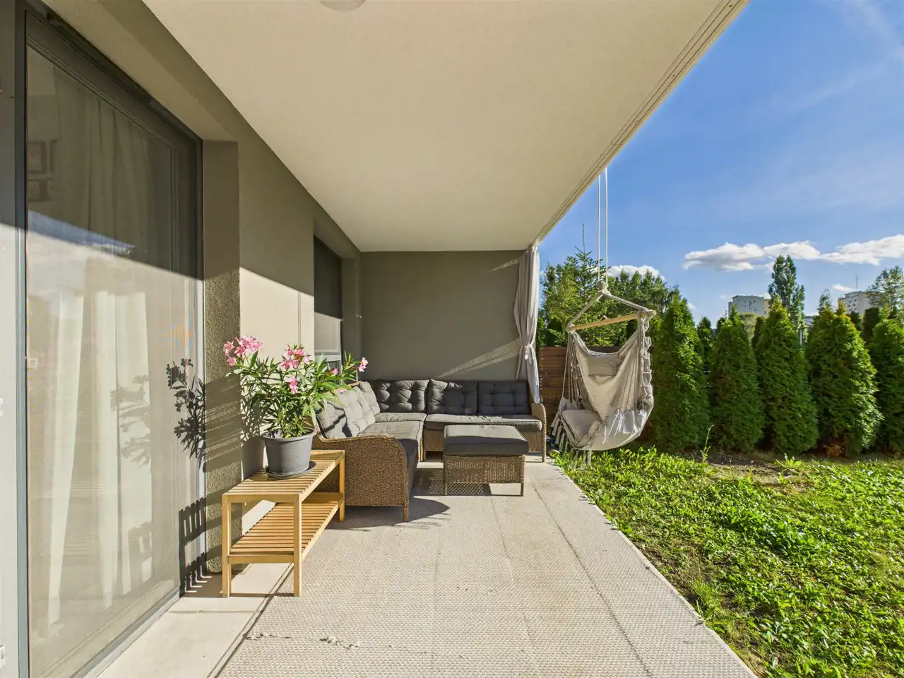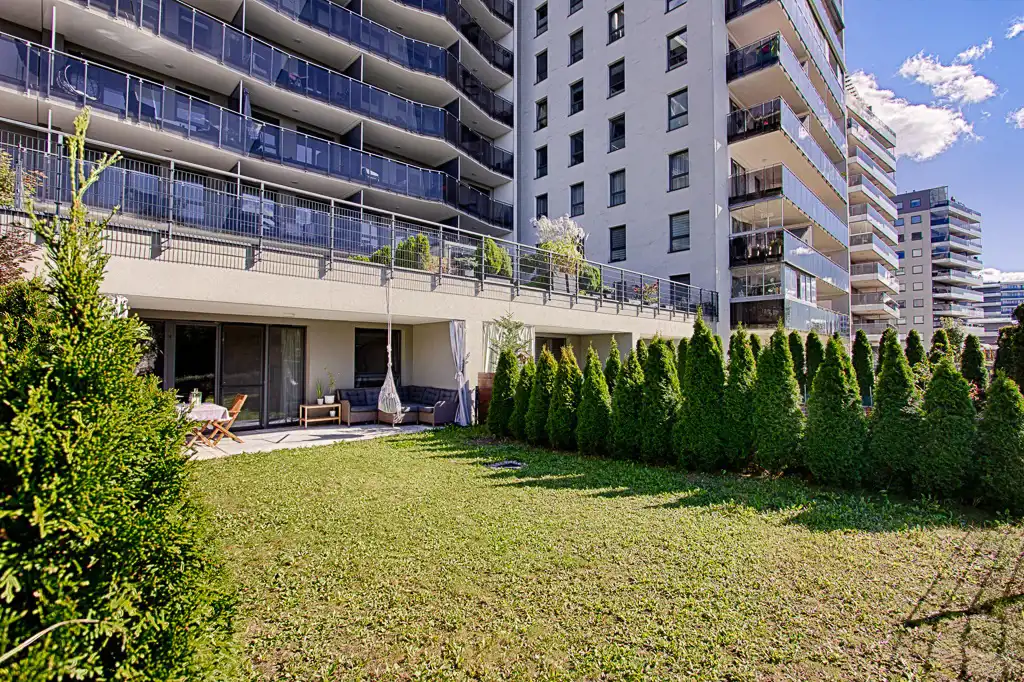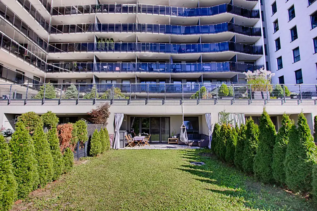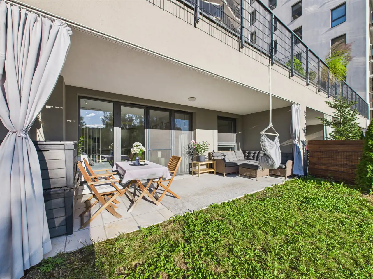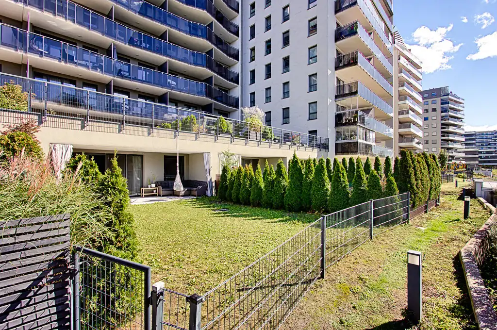Niewątpliwym atutem nieruchomości jest taras z prywatnym ogrodem o łącznej powierzchni 90,07 m², usytuowany od wewnętrznej strony budynku - idealny do odpoczynku i spotkań na świeżym powietrzu w spokojnej i cichej atmosferze dzięki licznym nasadzeniom. Można korzystać w pełni z komfortu i prywatności ponieważ nad tarasem znajduje się jeden prywatny ogród a cały blok jest cofnięty w głąb.