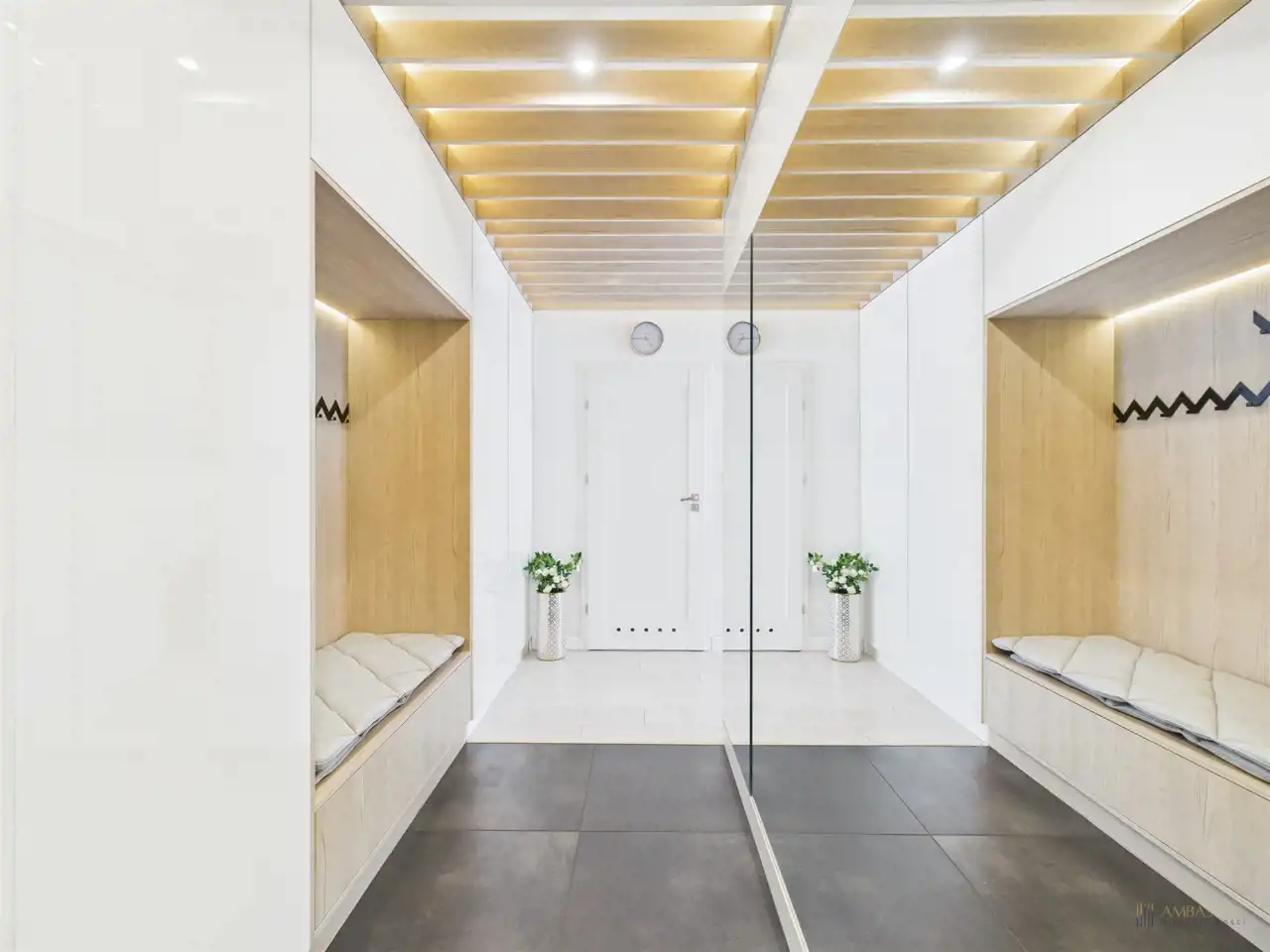 • Korytarz – w całości zabudowany pojemnymi szafami stolarskimi na całej długości i wysokości, z przemyślanymi rozwiązaniami do przechowywania nawet dużych gabarytów. Jedna ze ścian korytarza została w pełni wykończona lustrem, co nadaje wnętrzu elegancji i przestronności. Na suficie zostały ułożone deski z podświetleniem co podkreśla ciekawy wygląd korytarza.