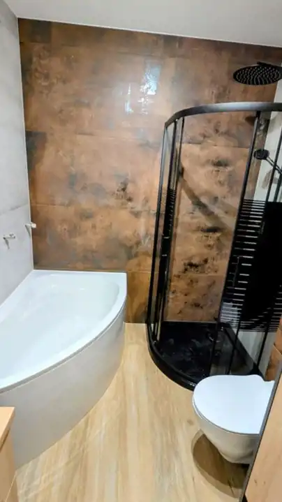 Duża łazienka w nowoczesnej aranżacji z dużą wanną oraz prysznicem. Ponadto wyposazona w pralkę i suszarkę.