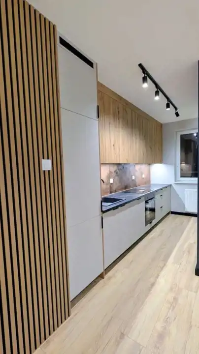 Nieruchomość posiada duży salon z kuchnia. Calość w nowoczesnej kolorystyce - połączenie odcieni szarości i drewna nadaje wnętrzu oryginalny charakter.