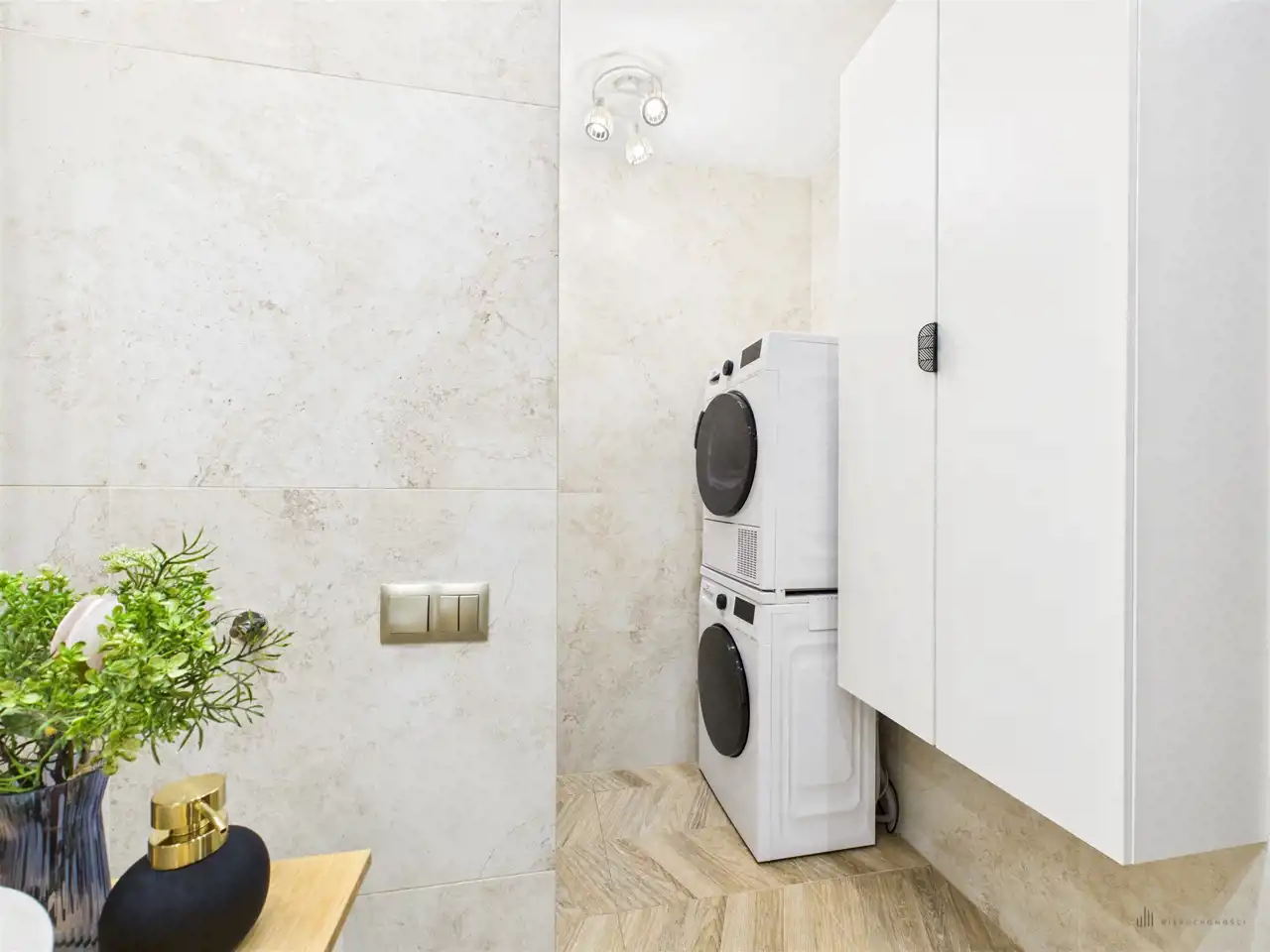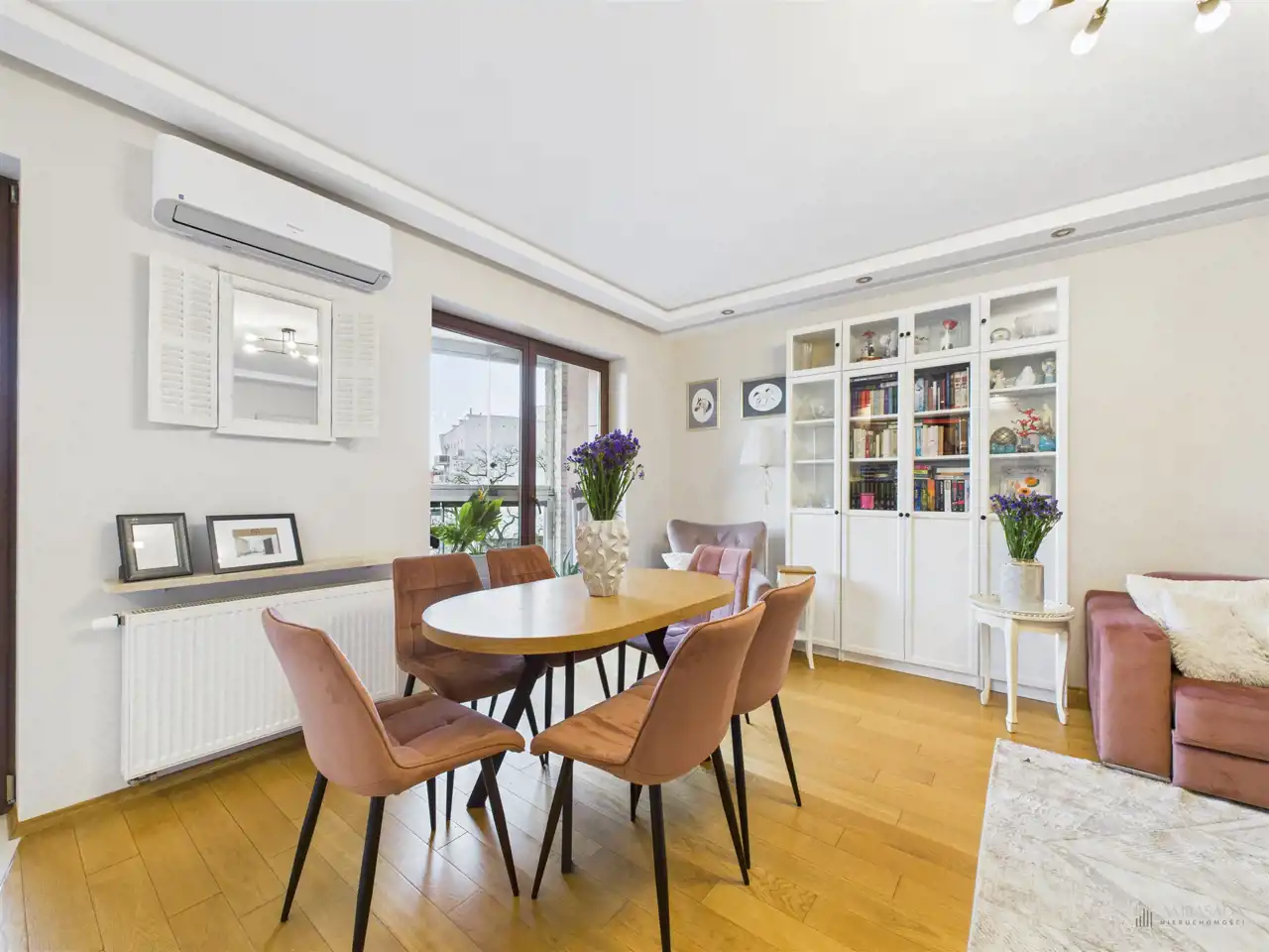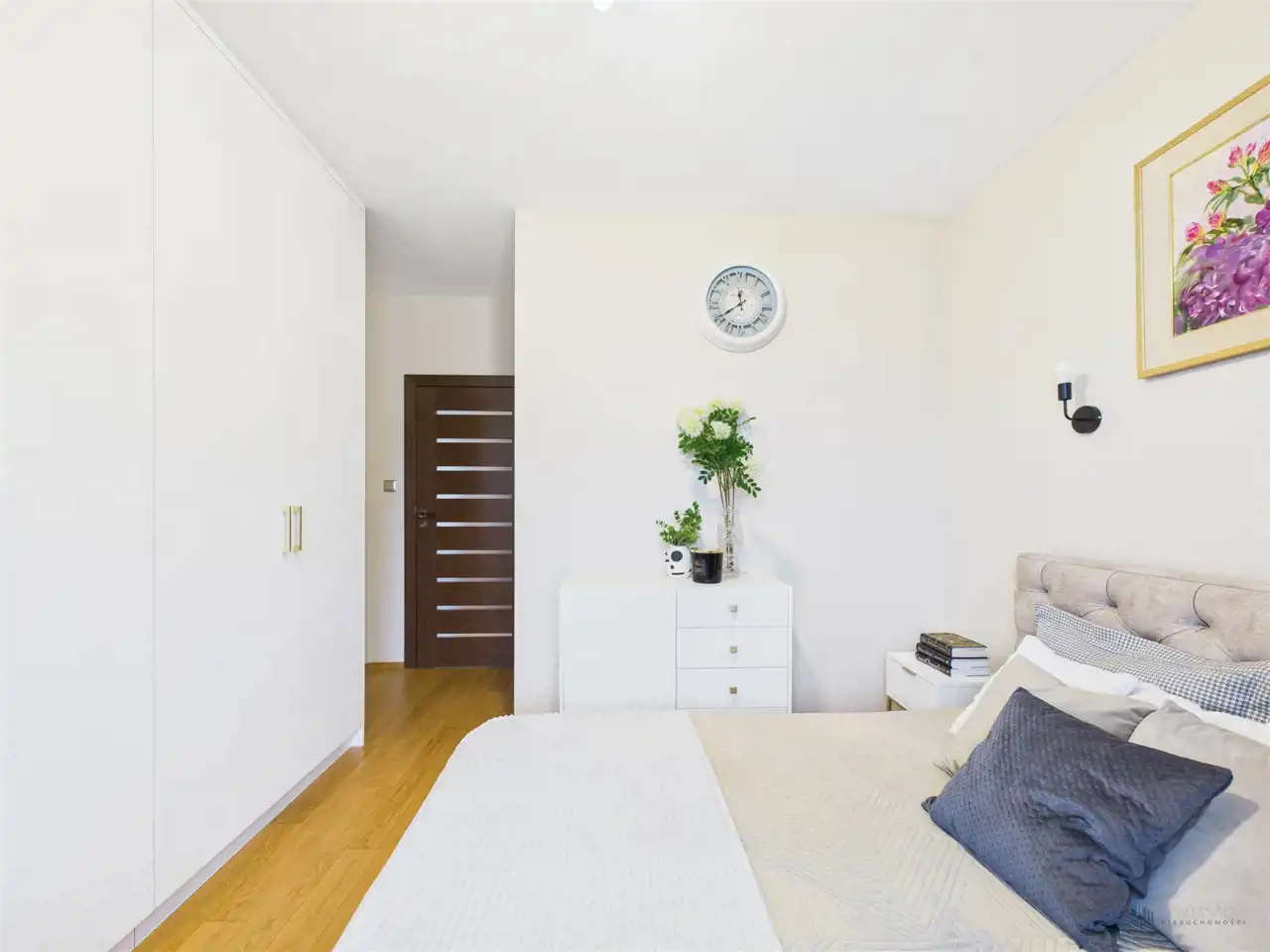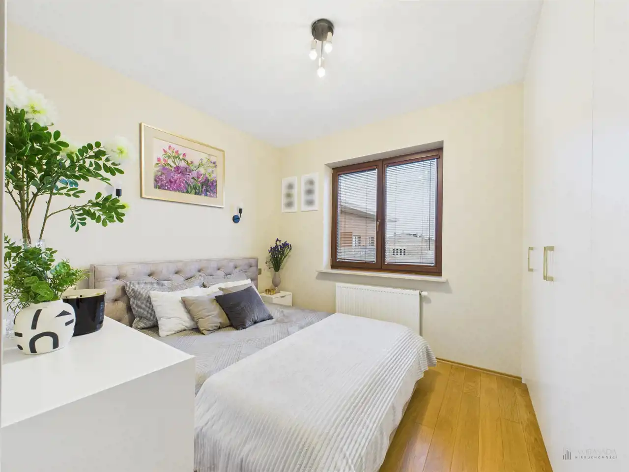 Przestronny salon w którym znajduje się duża kanapa, stół jadalniany oraz miejsce na fotel- idealny do wypoczynku z widokiem na miasto. Na podłogach położona jest wysokiej jakości drewniana podłoga, która nadaje mieszkaniu ciepły i stylowy charakter. Pojemna kuchnia w bieli, przełamana czerniami i drewnianymi blatami. Główna sypialnia pomieści duże sypialniane łóżko oraz szafę w zabudowie. Sypialnie bardzo ustawne w jednej z nich znajduje się pojemna zabudowa. Łazienka wyposażona w wannę, prysznic oraz miejscem na pralkę i suszarkę. Dużym udogodnieniem jest ogrzewanie podłogowe. Dodatkowym pomieszczeniem jest garderoba, która może pełnić rolę spiżarni bądź miejscem do przechowywania. Mieszkanie wyposażone w klimatyzację.