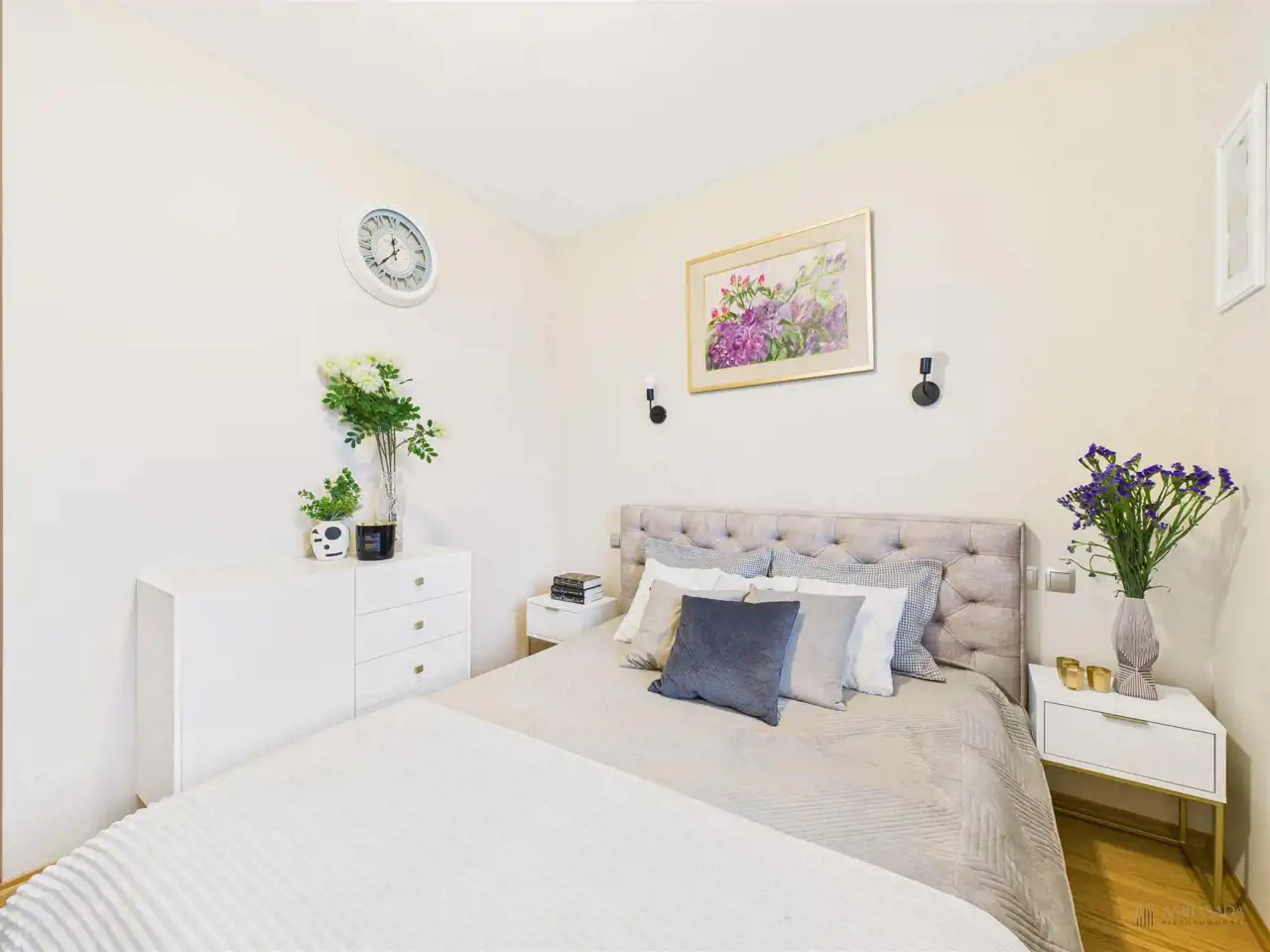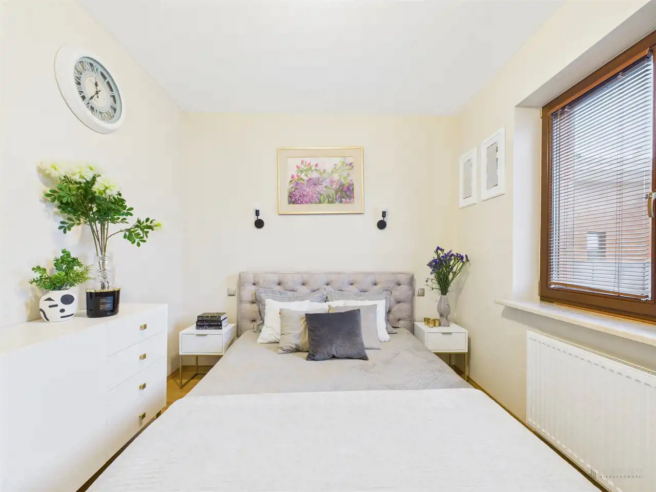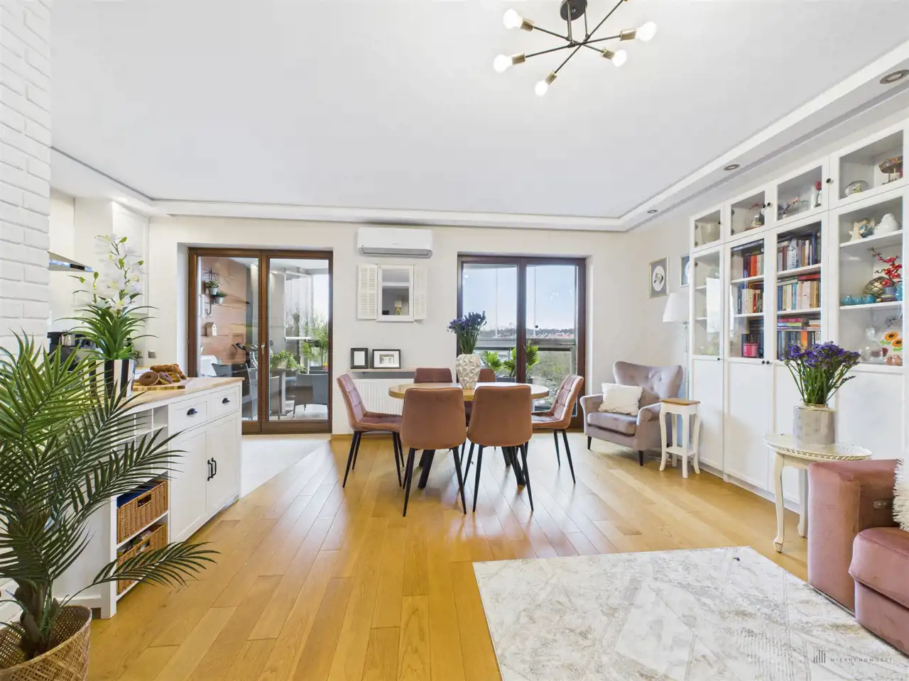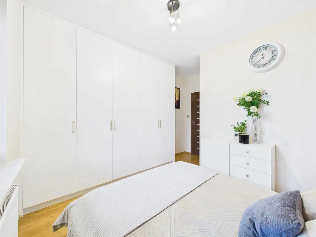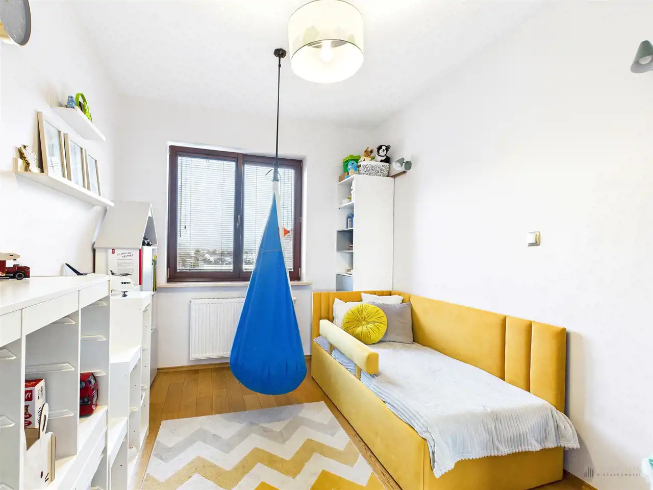 Przestronny salon w którym znajduje się duża kanapa, stół jadalniany oraz miejsce na fotel- idealny do wypoczynku z widokiem na miasto. Na podłogach położona jest wysokiej jakości drewniana podłoga, która nadaje mieszkaniu ciepły i stylowy charakter. Pojemna kuchnia w bieli, przełamana czerniami i drewnianymi blatami. Główna sypialnia pomieści duże sypialniane łóżko oraz szafę w zabudowie. Sypialnie bardzo ustawne w jednej z nich znajduje się pojemna zabudowa. Łazienka wyposażona w wannę, prysznic oraz miejscem na pralkę i suszarkę. Dużym udogodnieniem jest ogrzewanie podłogowe. Dodatkowym pomieszczeniem jest garderoba, która może pełnić rolę spiżarni bądź miejscem do przechowywania. Mieszkanie wyposażone w klimatyzację.