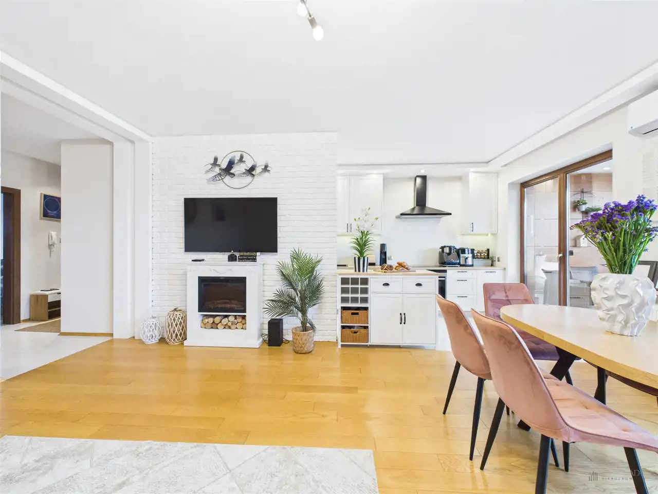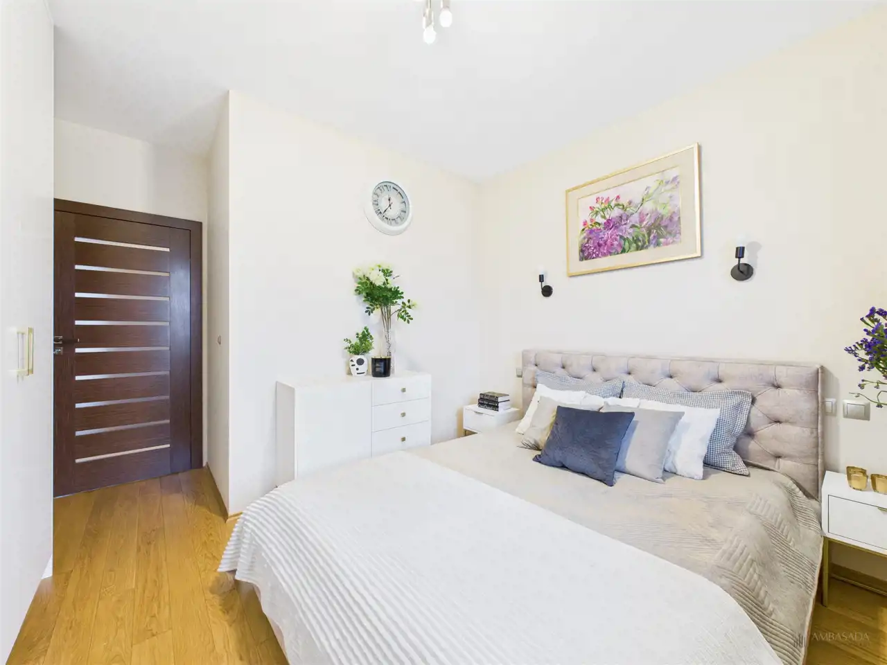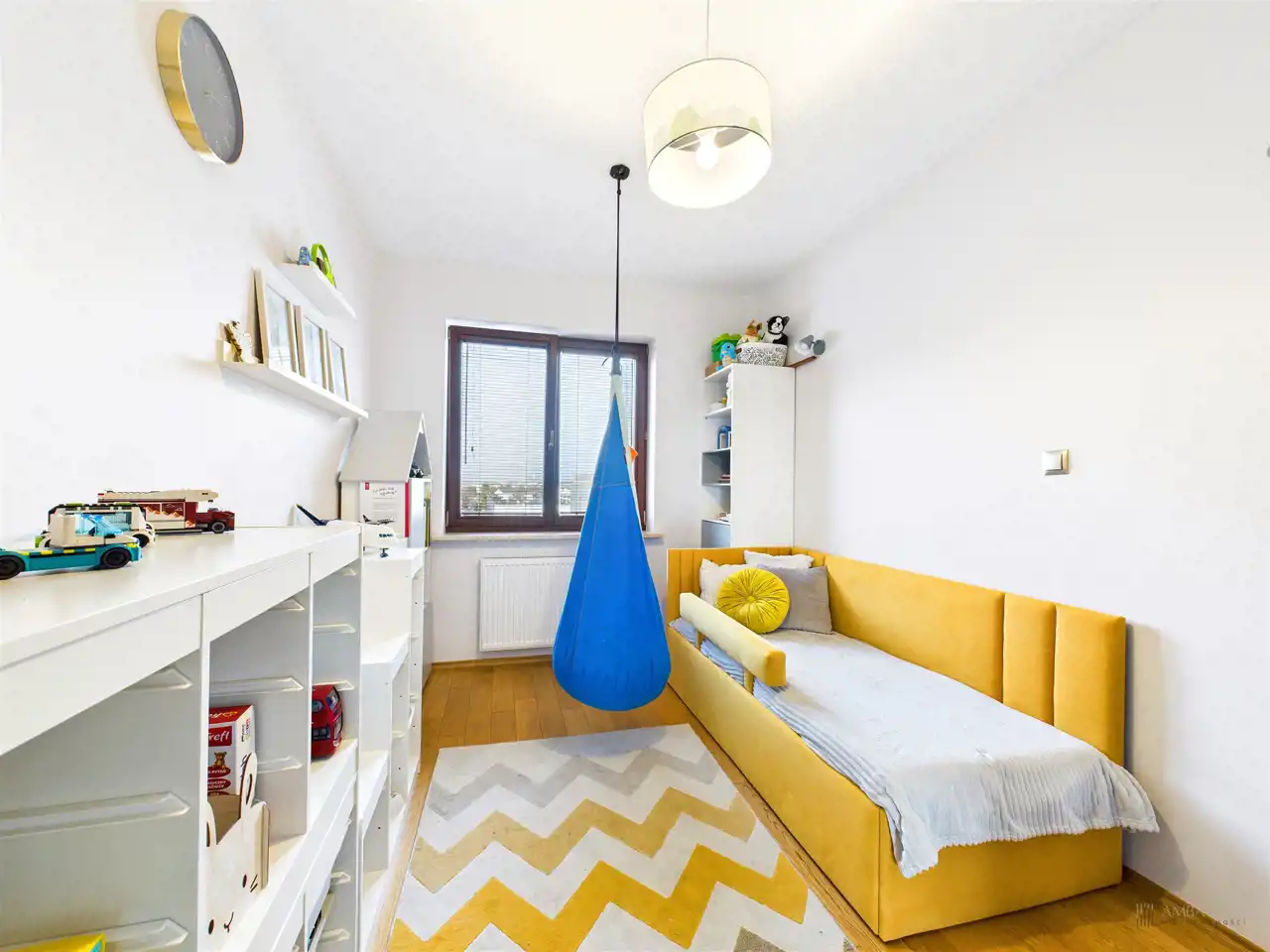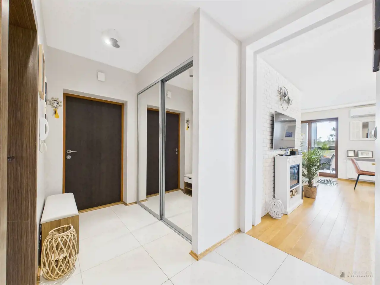 Przestronny salon w którym znajduje się duża kanapa, stół jadalniany oraz miejsce na fotel- idealny do wypoczynku z widokiem na miasto. Na podłogach położona jest wysokiej jakości drewniana podłoga, która nadaje mieszkaniu ciepły i stylowy charakter. Pojemna kuchnia w bieli, przełamana czerniami i drewnianymi blatami. Główna sypialnia pomieści duże sypialniane łóżko oraz szafę w zabudowie. Sypialnie bardzo ustawne w jednej z nich znajduje się pojemna zabudowa. Łazienka wyposażona w wannę, prysznic oraz miejscem na pralkę i suszarkę. Dużym udogodnieniem jest ogrzewanie podłogowe. Dodatkowym pomieszczeniem jest garderoba, która może pełnić rolę spiżarni bądź miejscem do przechowywania. Mieszkanie wyposażone w klimatyzację.
