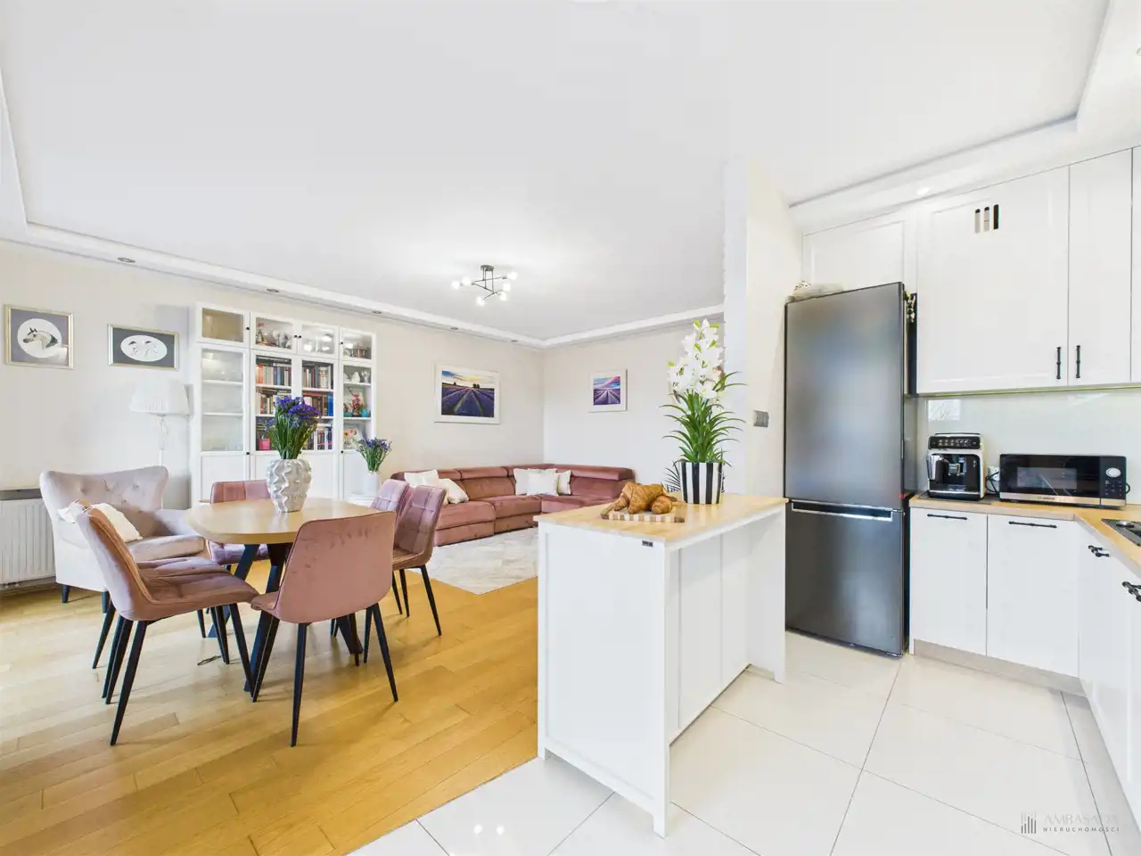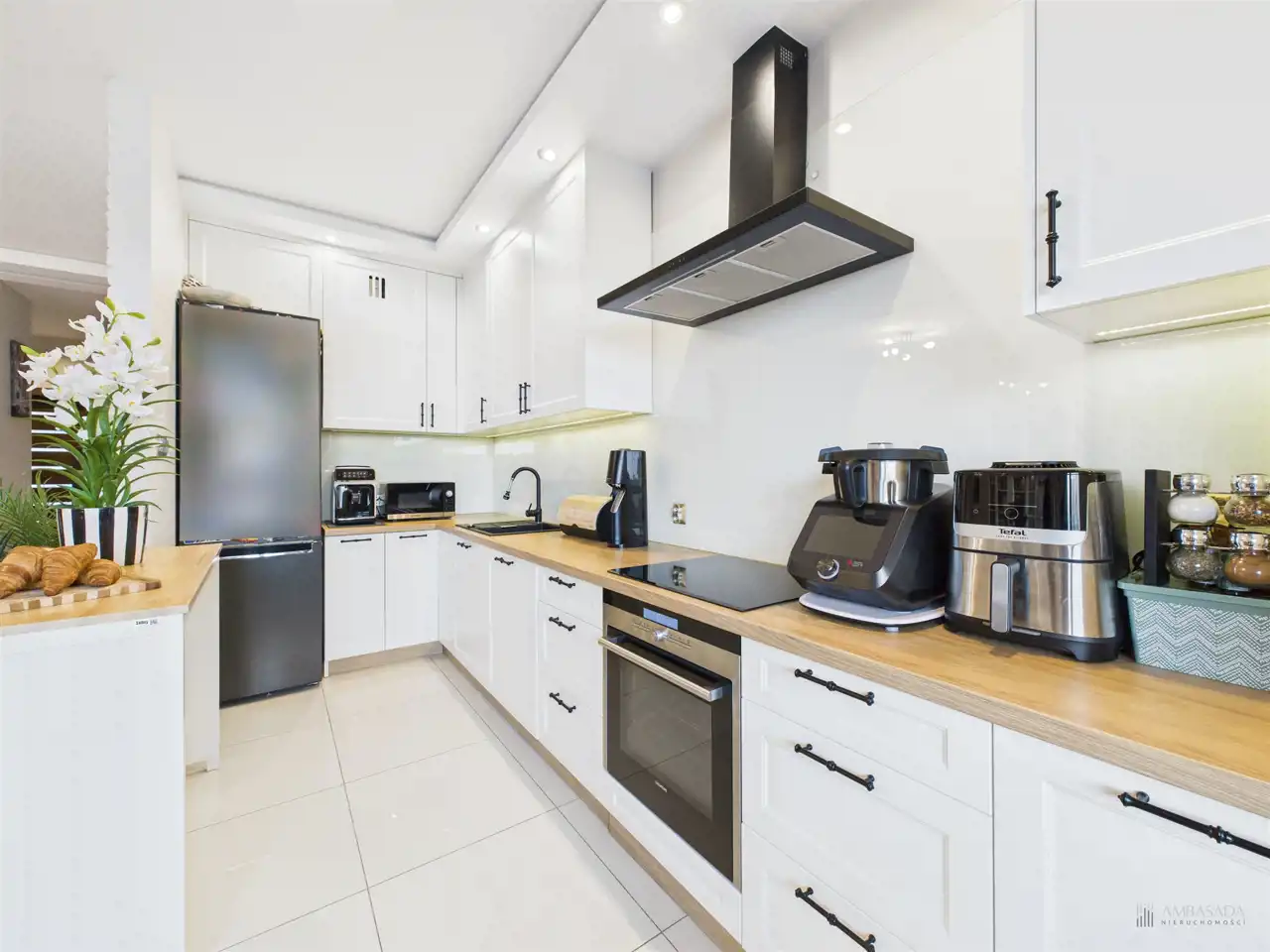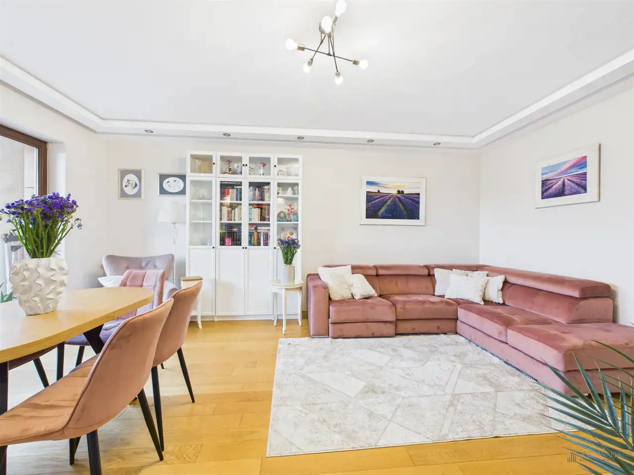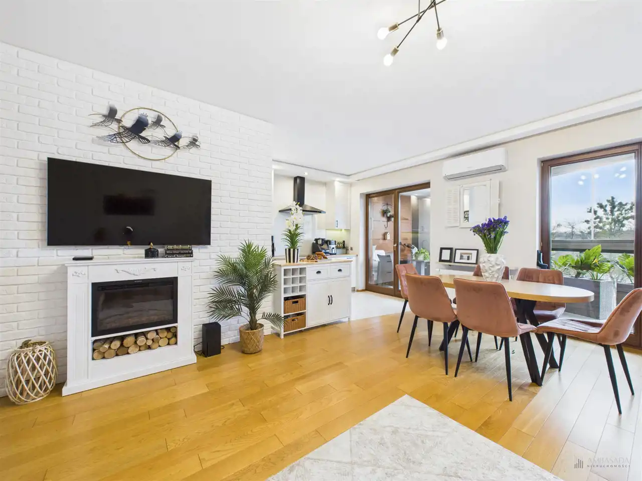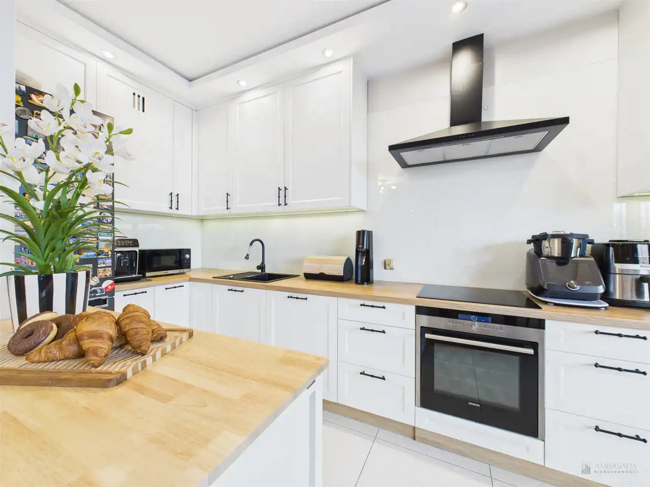 Przestronny salon w którym znajduje się duża kanapa, stół jadalniany oraz miejsce na fotel- idealny do wypoczynku z widokiem na miasto. Na podłogach położona jest wysokiej jakości drewniana podłoga, która nadaje mieszkaniu ciepły i stylowy charakter. Pojemna kuchnia w bieli, przełamana czerniami i drewnianymi blatami. Główna sypialnia pomieści duże sypialniane łóżko oraz szafę w zabudowie. Sypialnie bardzo ustawne w jednej z nich znajduje się pojemna zabudowa. Łazienka wyposażona w wannę, prysznic oraz miejscem na pralkę i suszarkę. Dużym udogodnieniem jest ogrzewanie podłogowe. Dodatkowym pomieszczeniem jest garderoba, która może pełnić rolę spiżarni bądź miejscem do przechowywania. Mieszkanie wyposażone w klimatyzację.