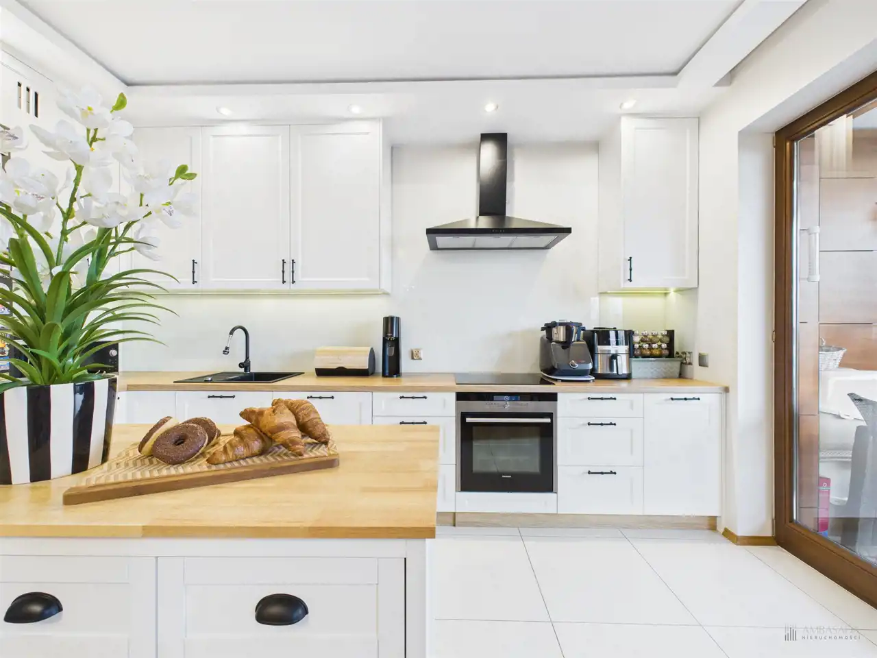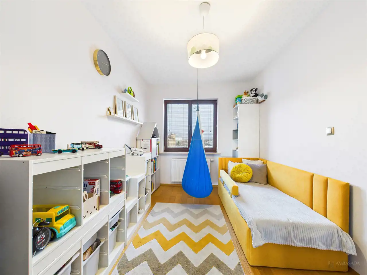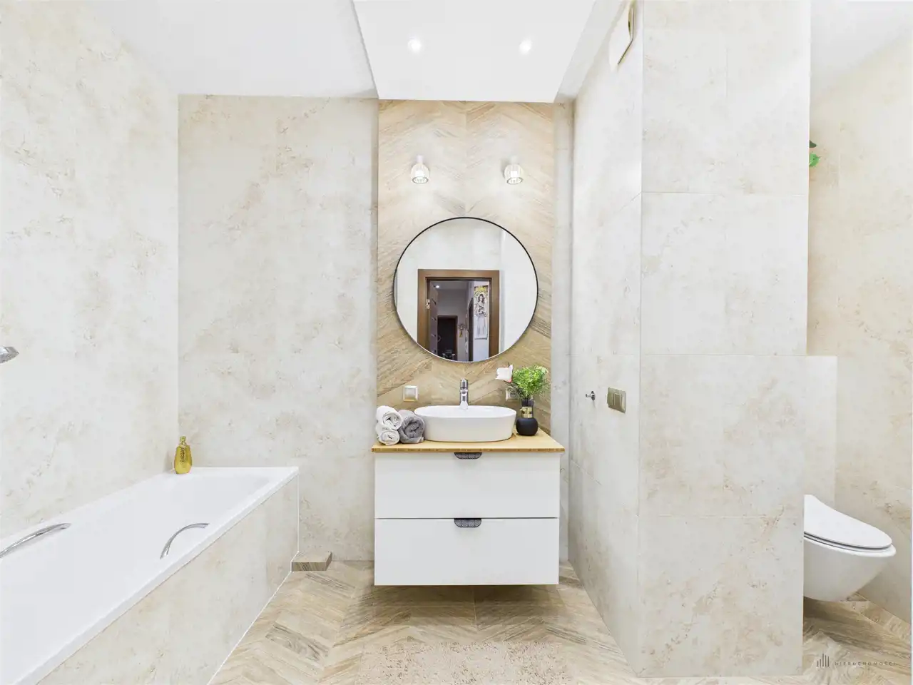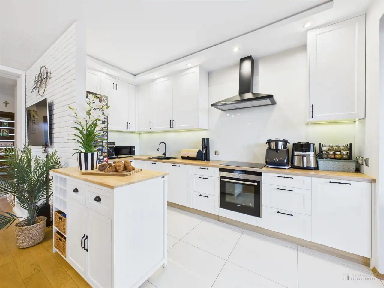 Przestronny salon w którym znajduje się duża kanapa, stół jadalniany oraz miejsce na fotel- idealny do wypoczynku z widokiem na miasto. Na podłogach położona jest wysokiej jakości drewniana podłoga, która nadaje mieszkaniu ciepły i stylowy charakter. Pojemna kuchnia w bieli, przełamana czerniami i drewnianymi blatami. Główna sypialnia pomieści duże sypialniane łóżko oraz szafę w zabudowie. Sypialnie bardzo ustawne w jednej z nich znajduje się pojemna zabudowa. Łazienka wyposażona w wannę, prysznic oraz miejscem na pralkę i suszarkę. Dużym udogodnieniem jest ogrzewanie podłogowe. Dodatkowym pomieszczeniem jest garderoba, która może pełnić rolę spiżarni bądź miejscem do przechowywania. Mieszkanie wyposażone w klimatyzację.