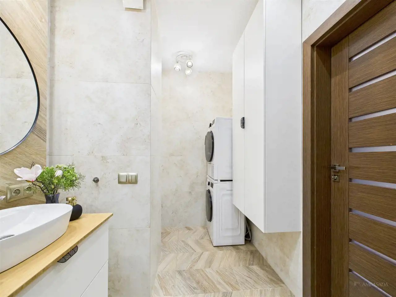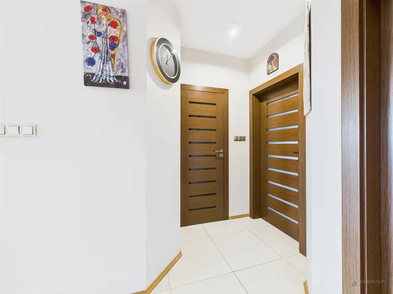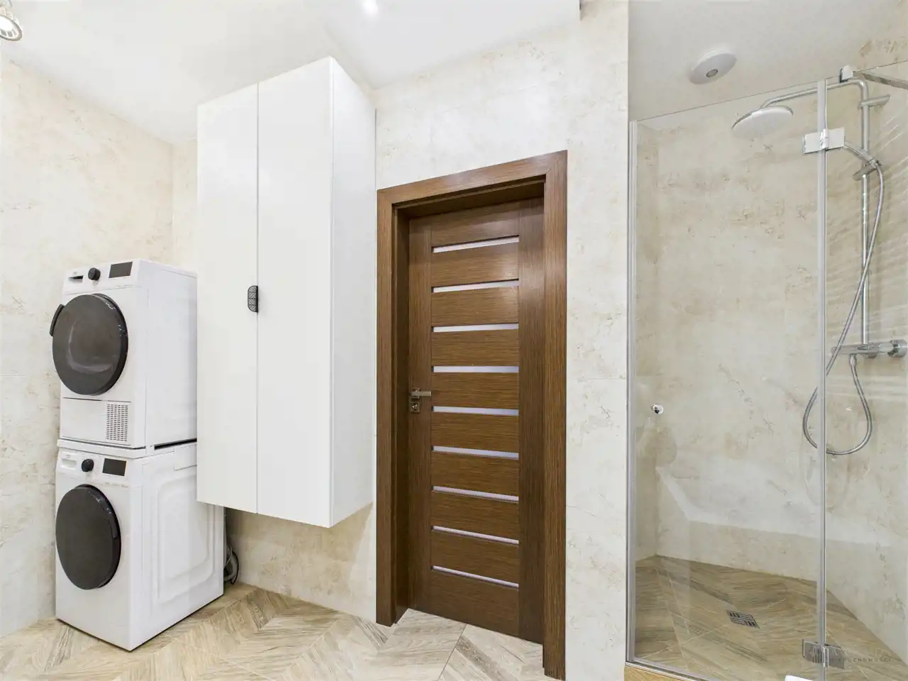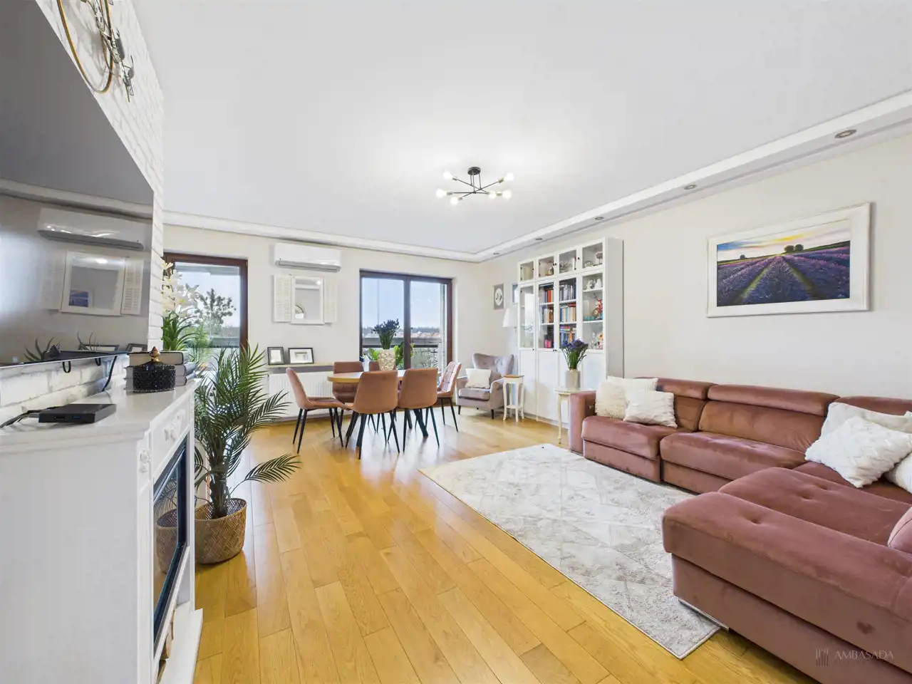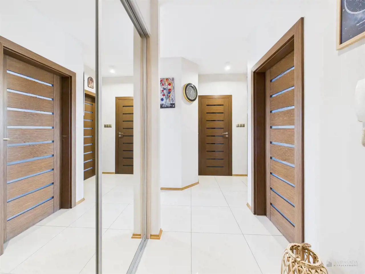 Przestronny salon w którym znajduje się duża kanapa, stół jadalniany oraz miejsce na fotel- idealny do wypoczynku z widokiem na miasto. Na podłogach położona jest wysokiej jakości drewniana podłoga, która nadaje mieszkaniu ciepły i stylowy charakter. Pojemna kuchnia w bieli, przełamana czerniami i drewnianymi blatami. Główna sypialnia pomieści duże sypialniane łóżko oraz szafę w zabudowie. Sypialnie bardzo ustawne w jednej z nich znajduje się pojemna zabudowa. Łazienka wyposażona w wannę, prysznic oraz miejscem na pralkę i suszarkę. Dużym udogodnieniem jest ogrzewanie podłogowe. Dodatkowym pomieszczeniem jest garderoba, która może pełnić rolę spiżarni bądź miejscem do przechowywania. Mieszkanie wyposażone w klimatyzację.
