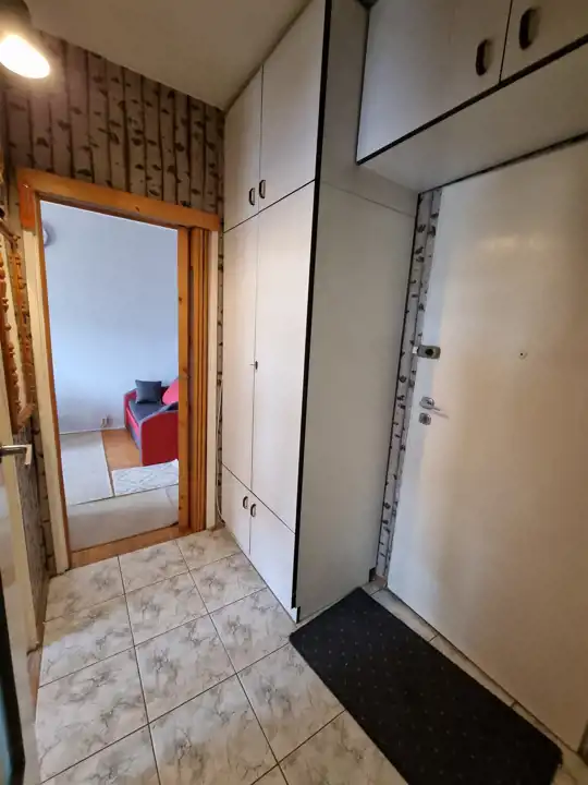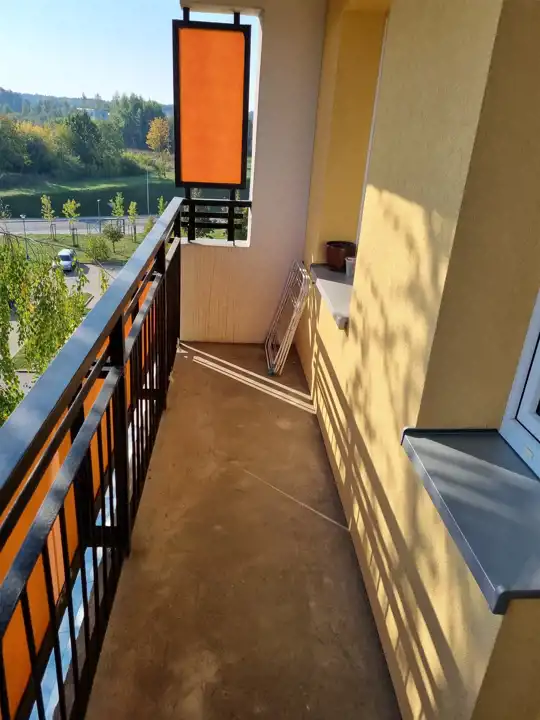 Powierzchnia 31m2, 2 pokoje, kuchnia w pełni wyposażona, piekarnik, lodówka, duże szafy- zabudowy stałe w korytarzu, łazienka razem z wc. Duży balkon, po całej szerokości dwóch pokoi.