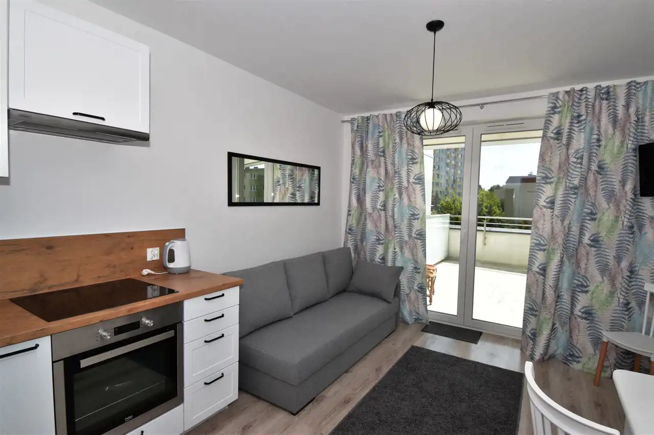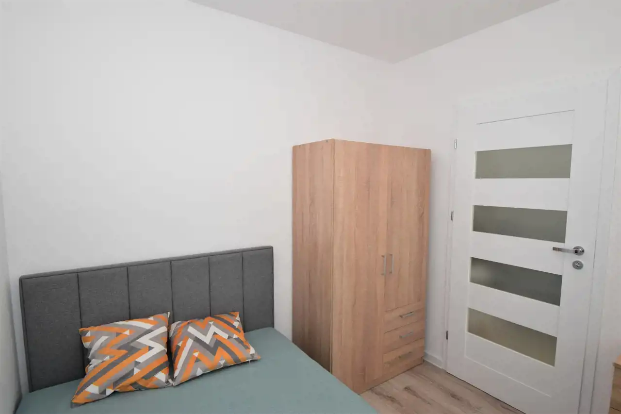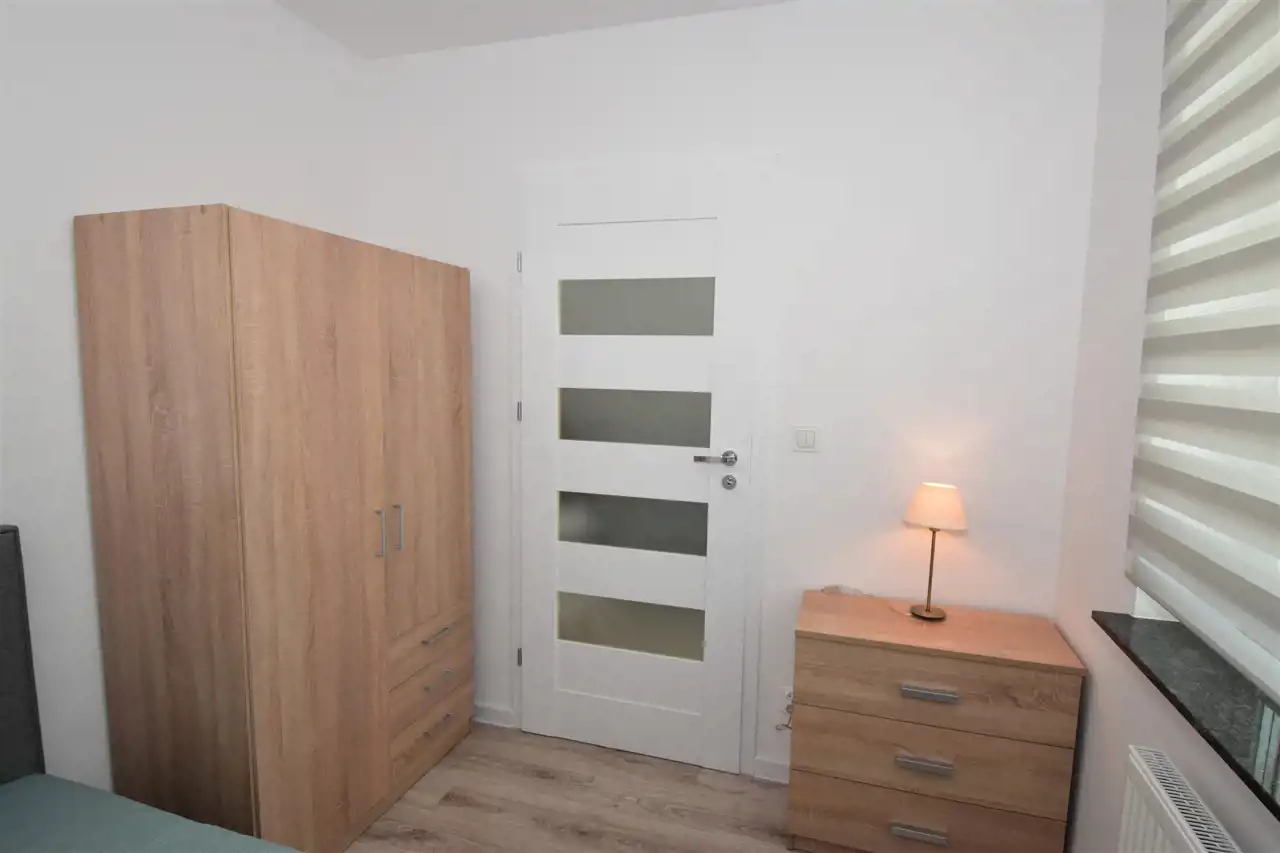 Oddzielna sypialnia, pokój dzienny z aneksem kuchennym , łazienka z prysznicem. Pełne wyposażenie sprzęt AGD oraz łóżko, szafa, pralka.