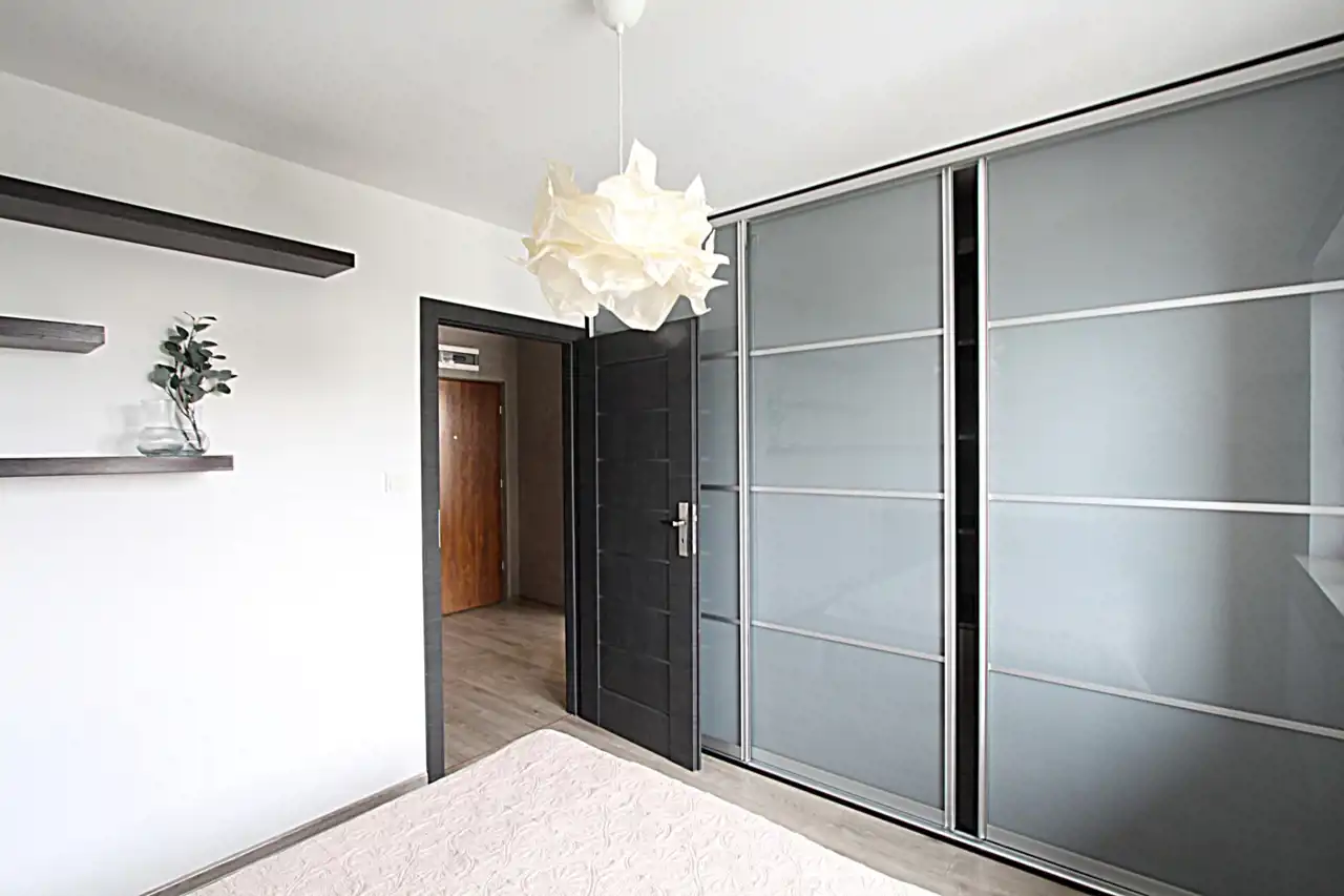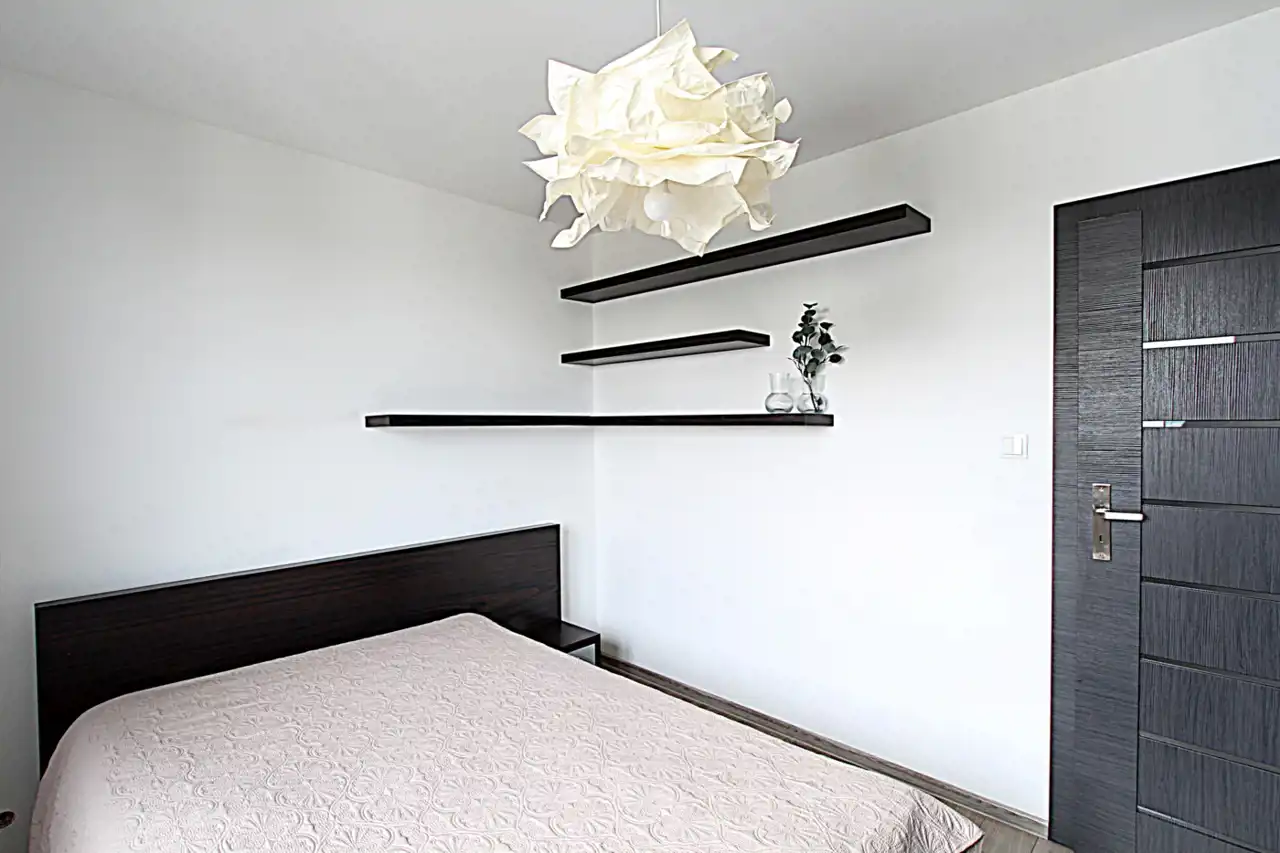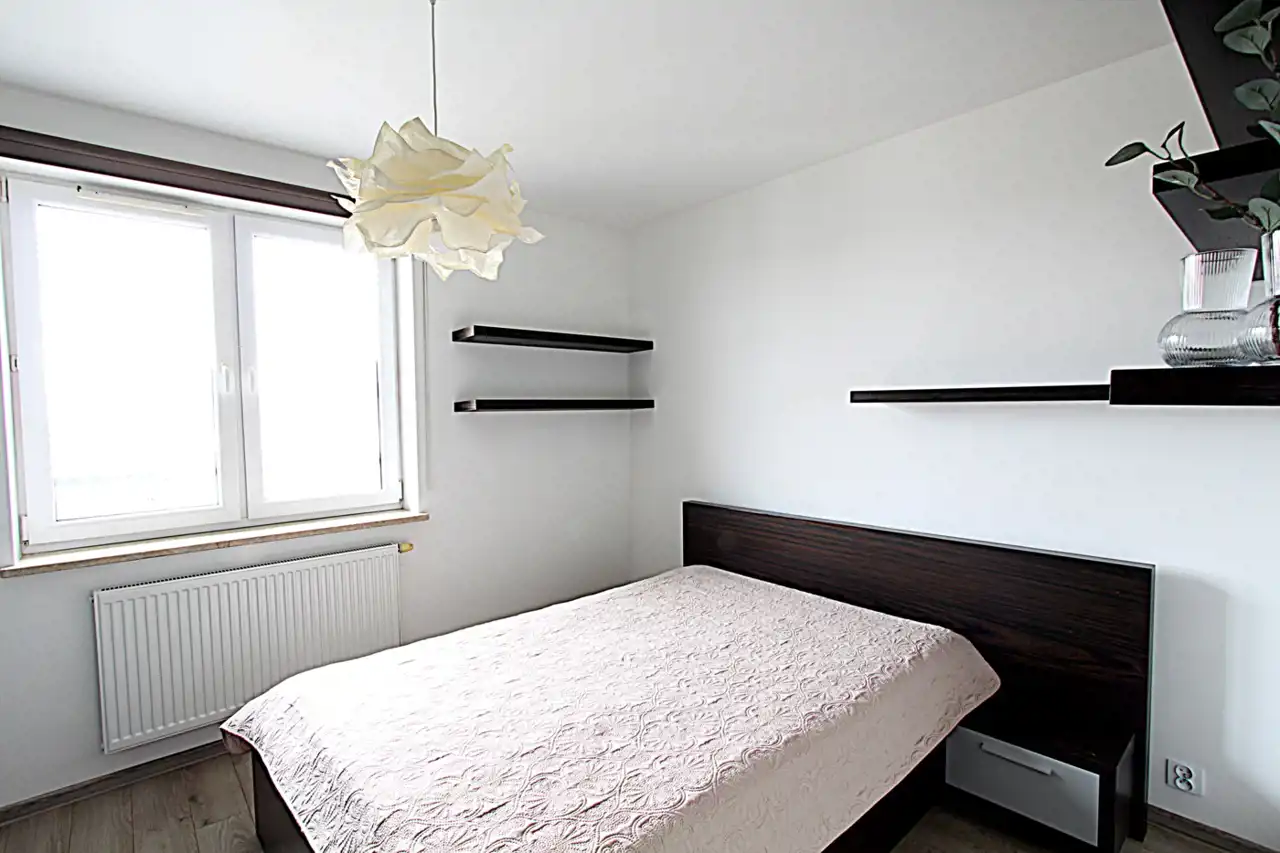 Sypialnia wyposażona jest w duże łóżko, zabudowę stałą -szafę typu Komandor.Mieszkanie jest wyposażone. Kuchnia posiada zabudowy stałe i sprzęt AGD (lodówka, piekarnik, płyta gazowa, zmywarka, okap).