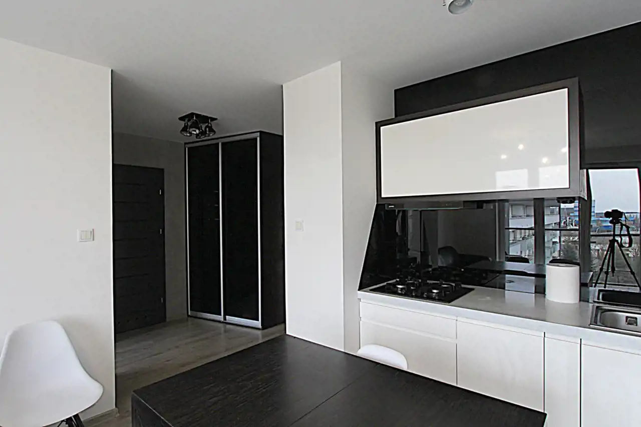 Mieszkanie jest wyposażone. Kuchnia posiada zabudowy stałe i sprzęt AGD (lodówka, piekarnik, płyta gazowa, zmywarka, okap).