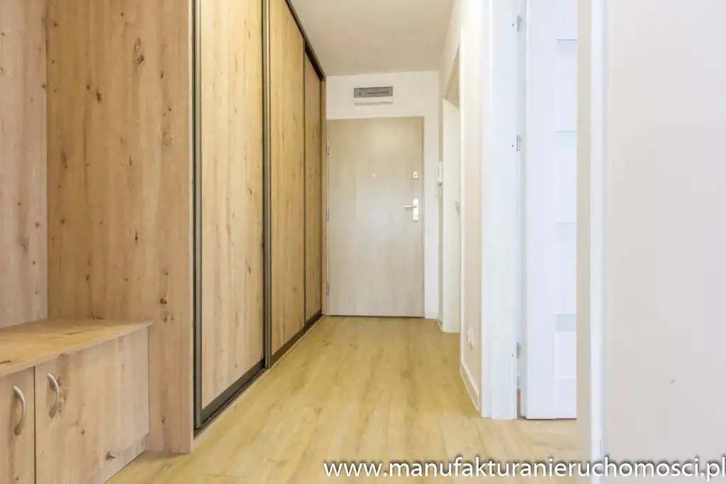 - przedpokój z zabudową stałą wyposażoną w szafki i w pojemne szafy