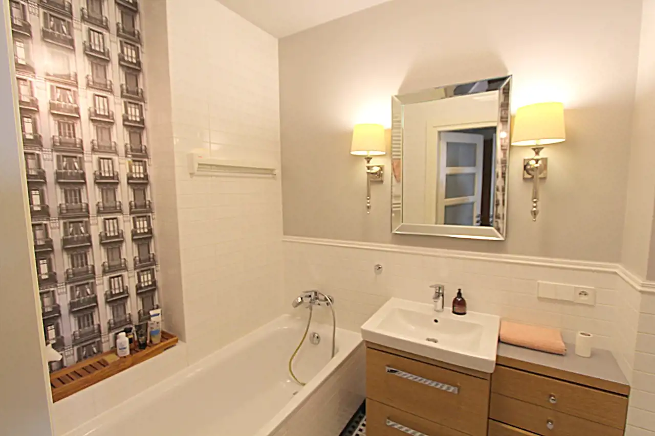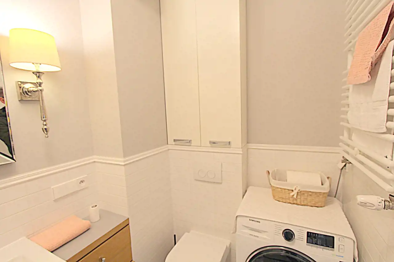 W łazience znajduje się wanna, umywalka, szafki, lustro, wc, pralka,